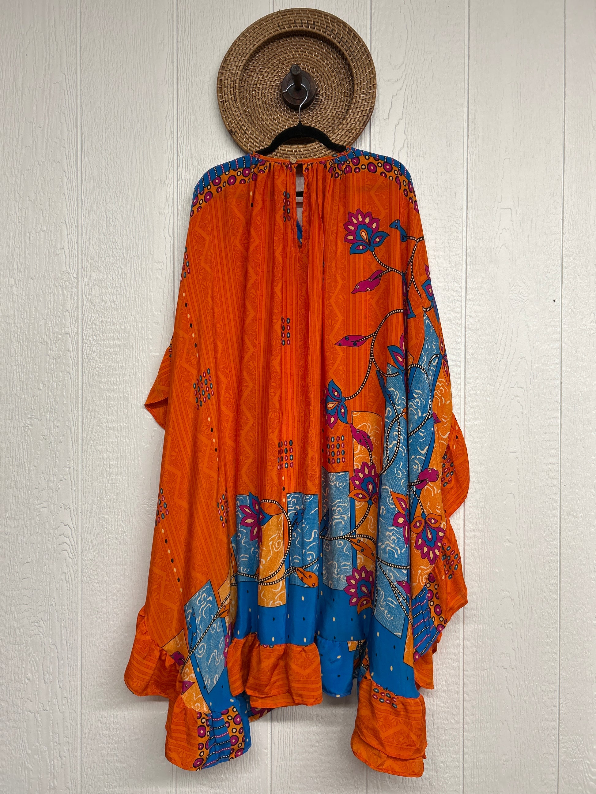 Fabrics may have small threads or holes in the layers. Color inconsistency or small stains may be present. The saris are sewn together and extend the life of each design. Imperfections should be celebrated.