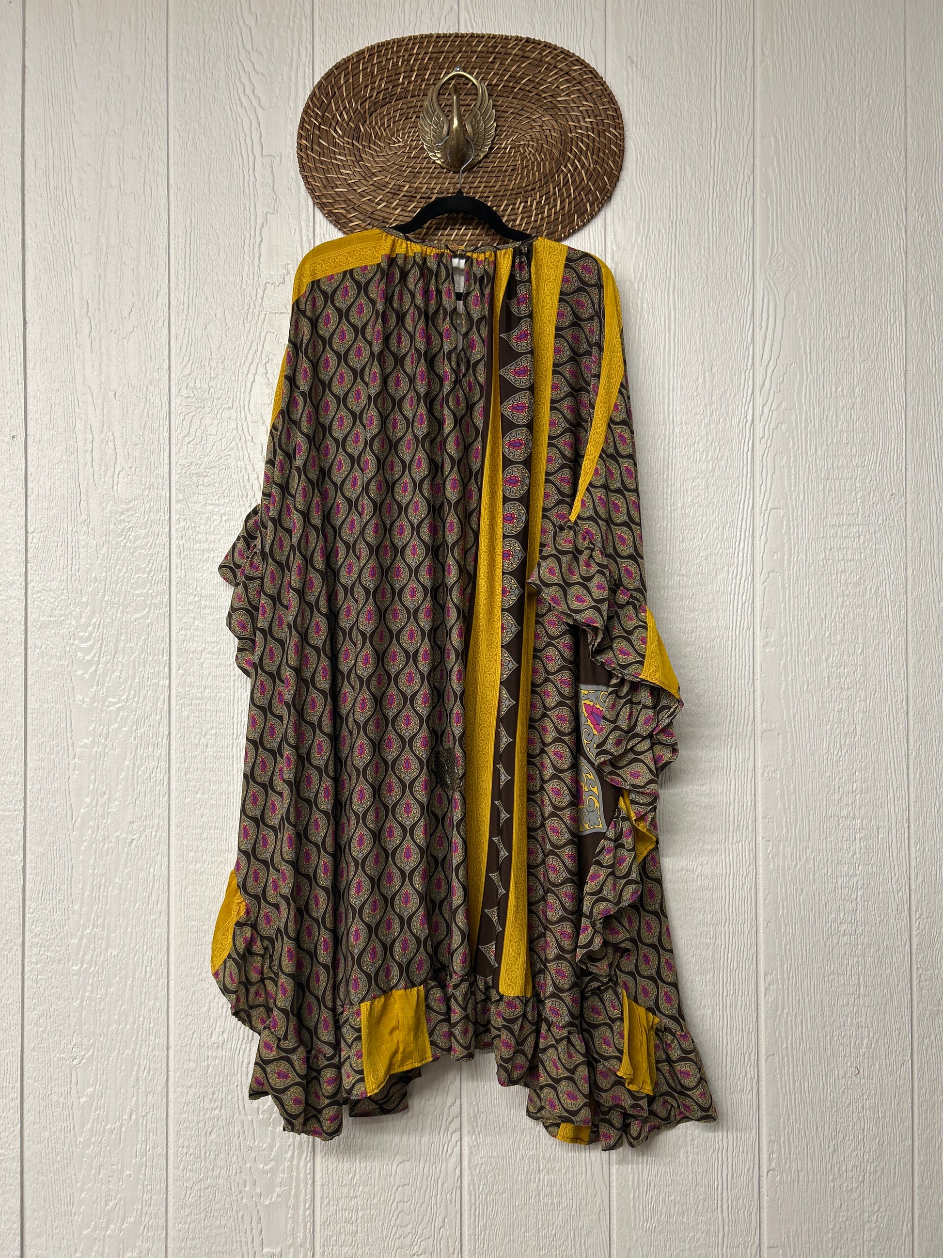 This dreamy muu is crafted from our ultra lux vintage rasgulla sari and features a button down placket and slouchy exterior pockets. Ruffles around the hem make this the ultimate rockstar layer that you can wear closed as a muu or open as a kimono!!