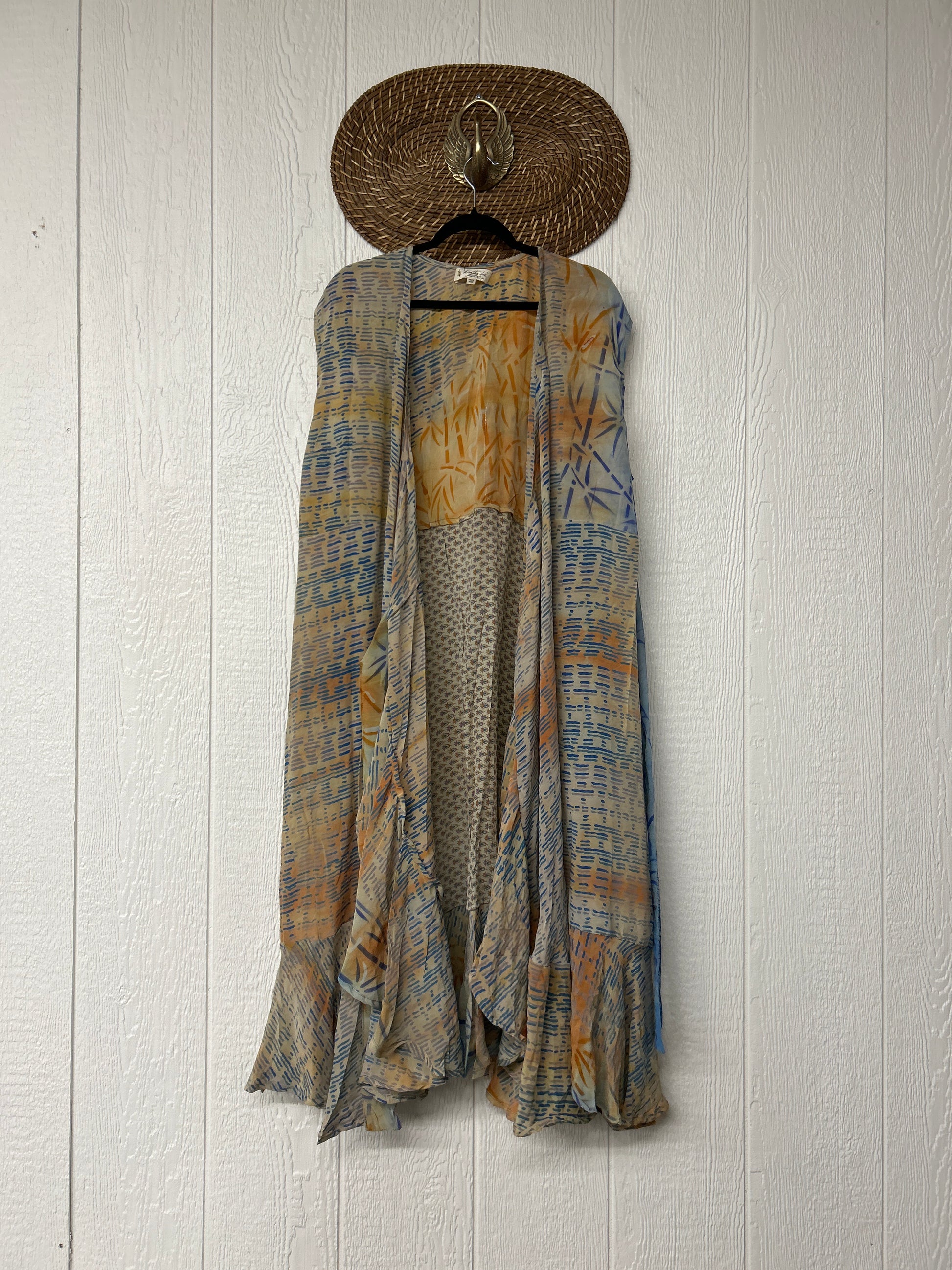 The Rhapsody Kimono Vest is crafted from our ultra lux vintage crepe silk sari. Features ruffle details throughout, interior pockets and a built in sash tie closure to wear open or closed. We're obsessed!