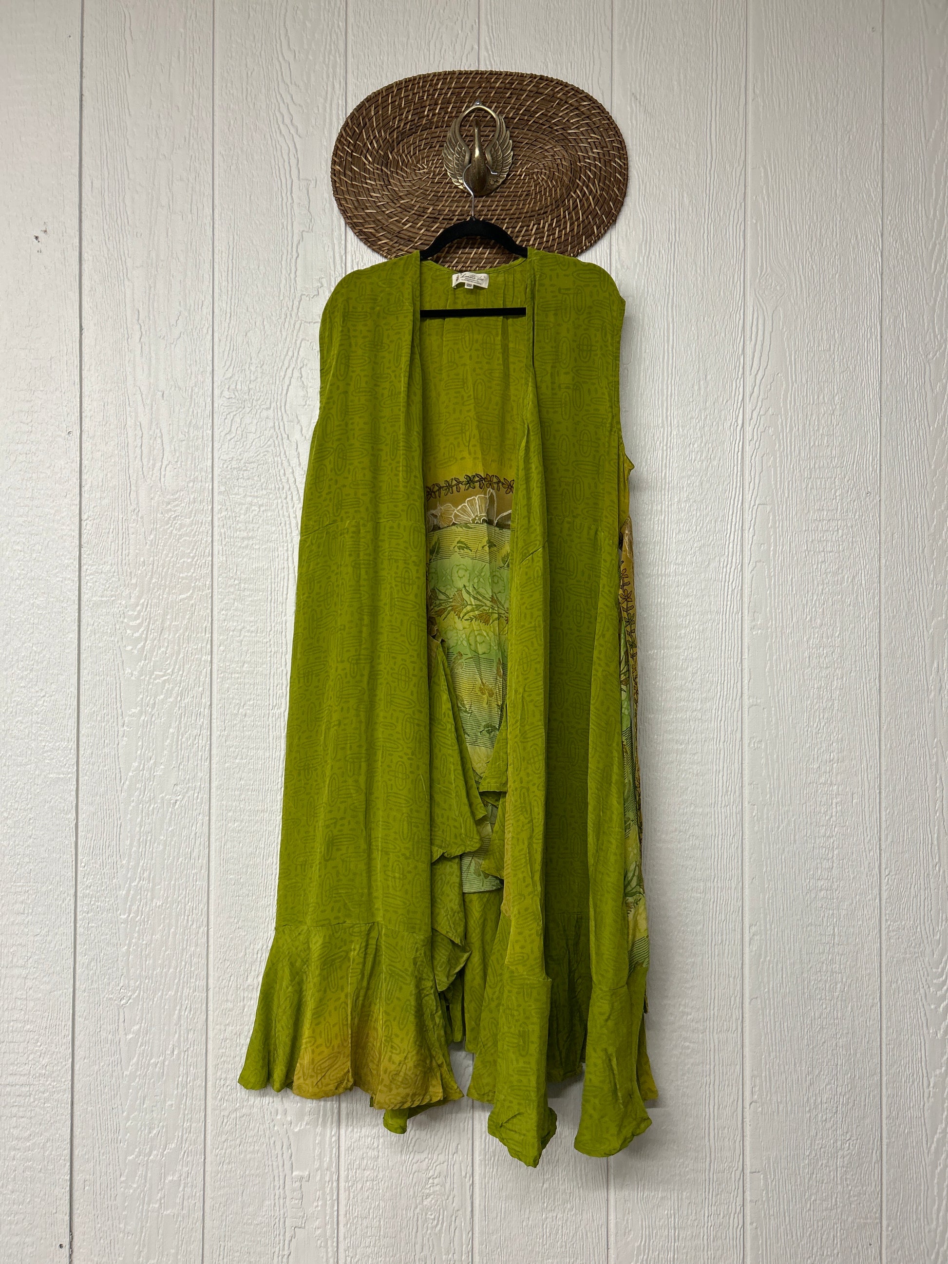 The Rhapsody Kimono Vest is crafted from our ultra lux vintage crepe silk sari. Features ruffle details throughout, interior pockets and a built in sash tie closure to wear open or closed. We're obsessed!
