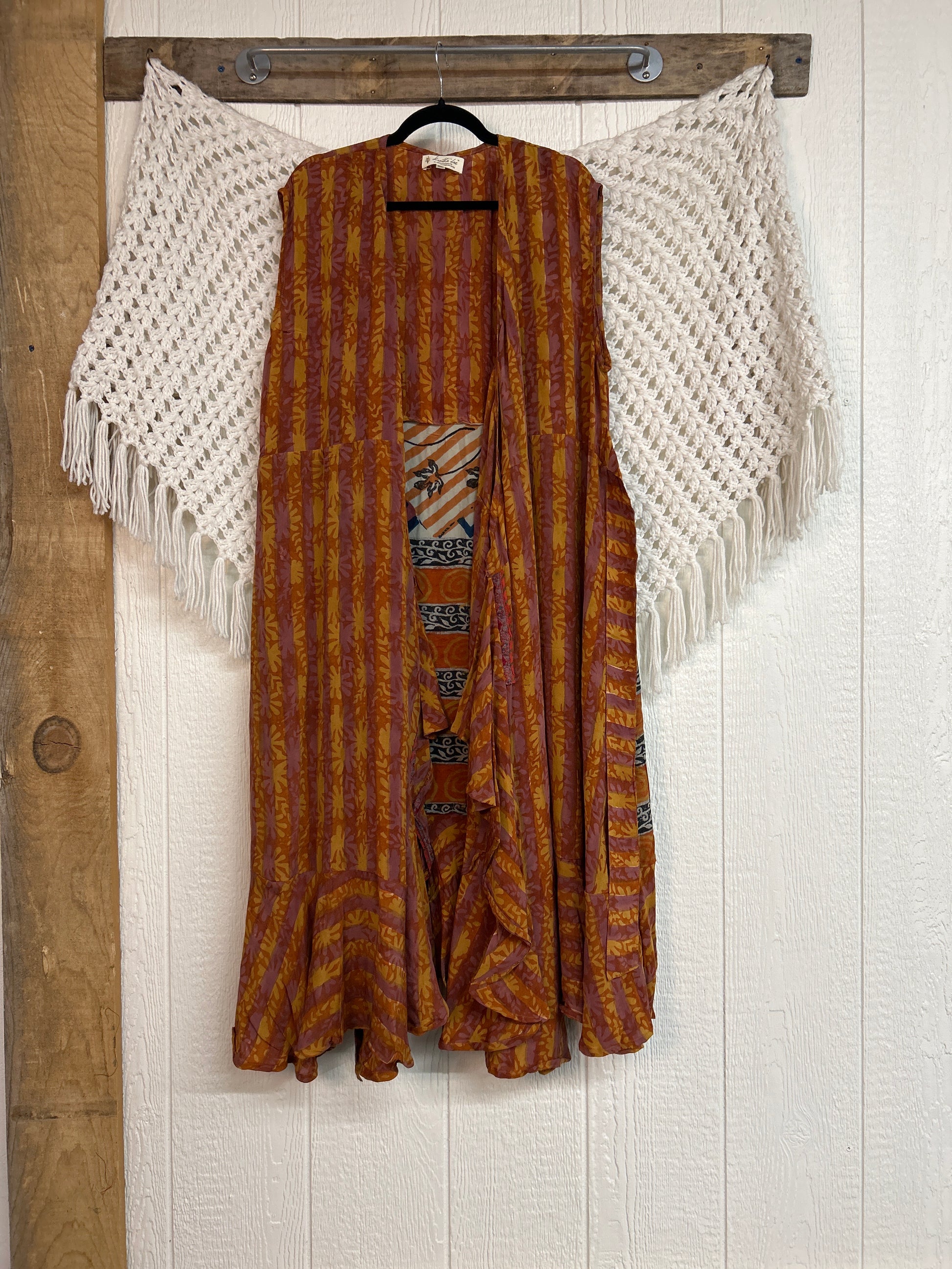 The Rhapsody Kimono Vest is crafted from our ultra lux vintage crepe silk sari. Features ruffle details throughout, interior pockets and a built in sash tie closure to wear open or closed. We're obsessed!