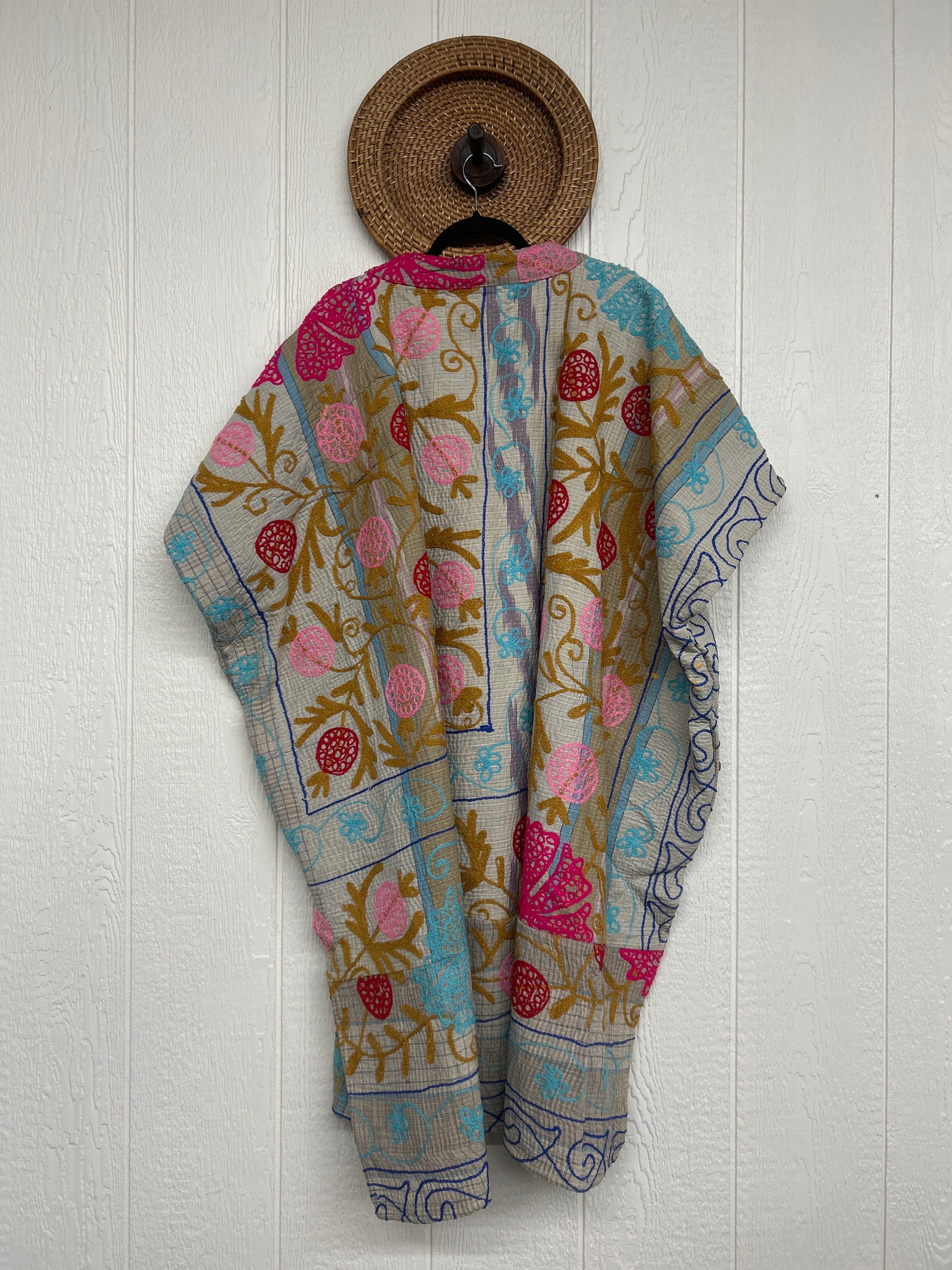 Crafted from hand embroidered fine kantha features a v neckline and interior pockets and side slits for extra dimension.