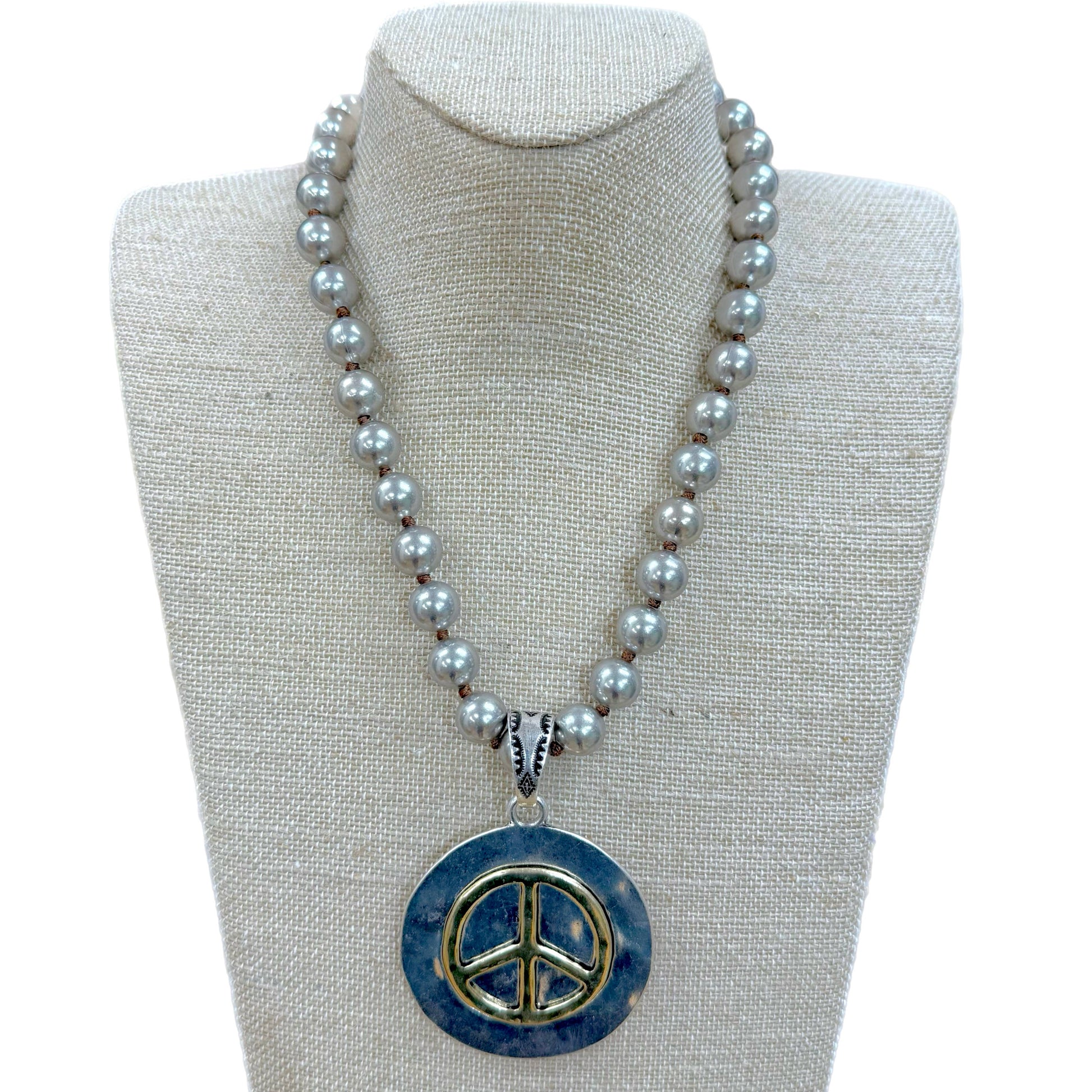 Two Tone Peace Sign Coin Pendant on Faux Navajo Pearls