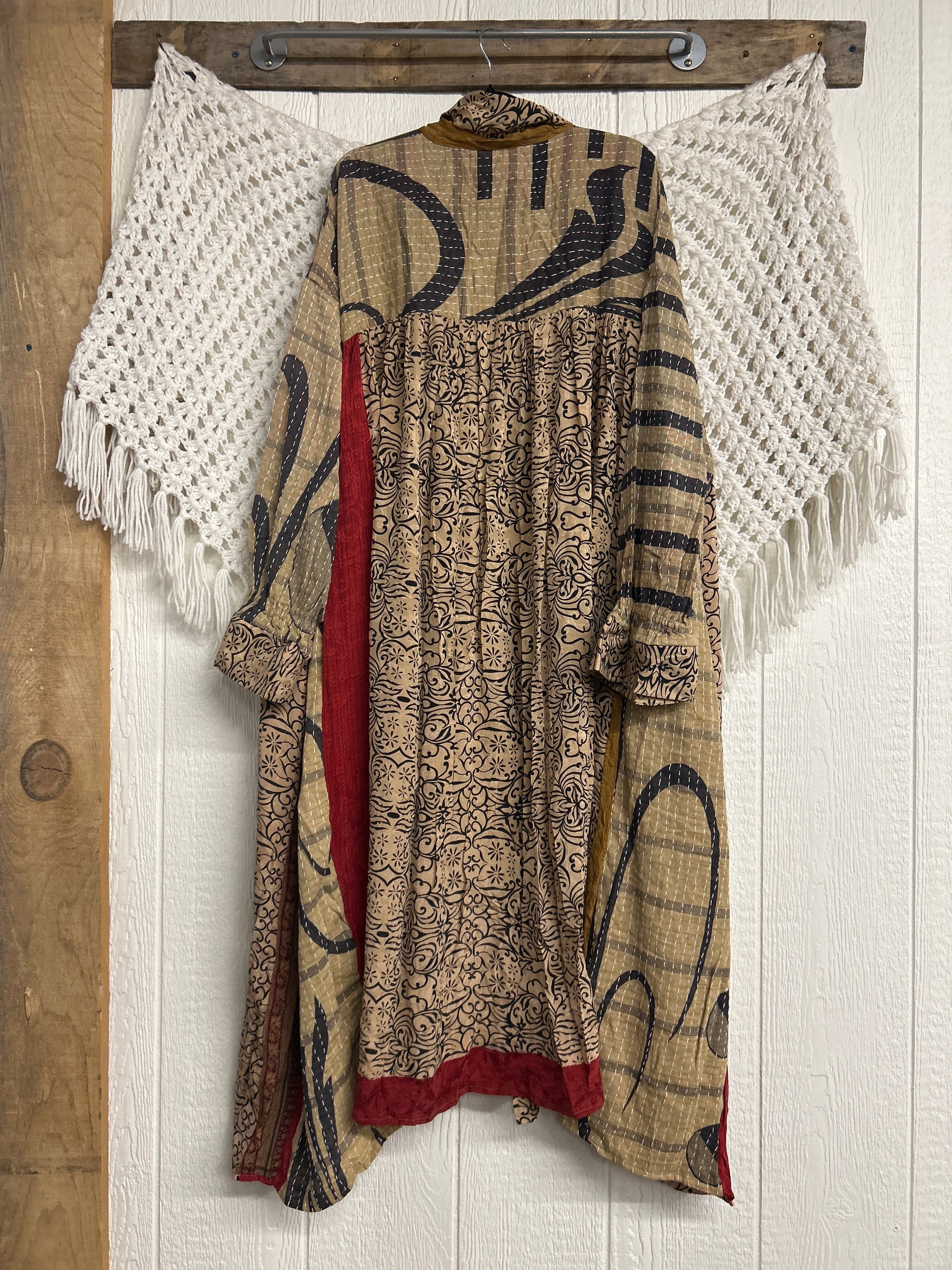 This dream layering piece is made from a mix of our lux vintage kantha embroidered cotton and crepe sari. Features an elastic ruffle sleeve that is easy to pull up or down to your desired length.