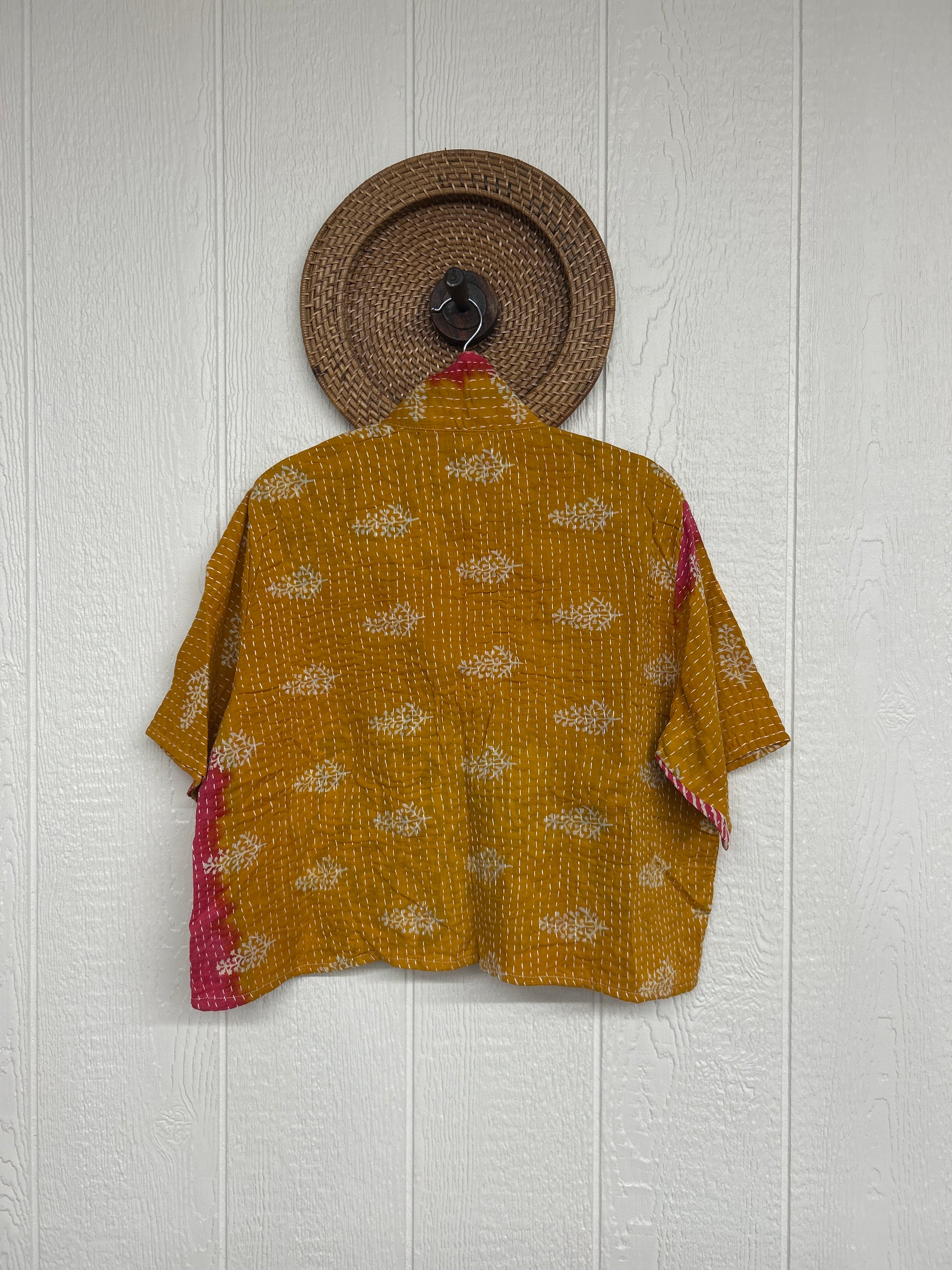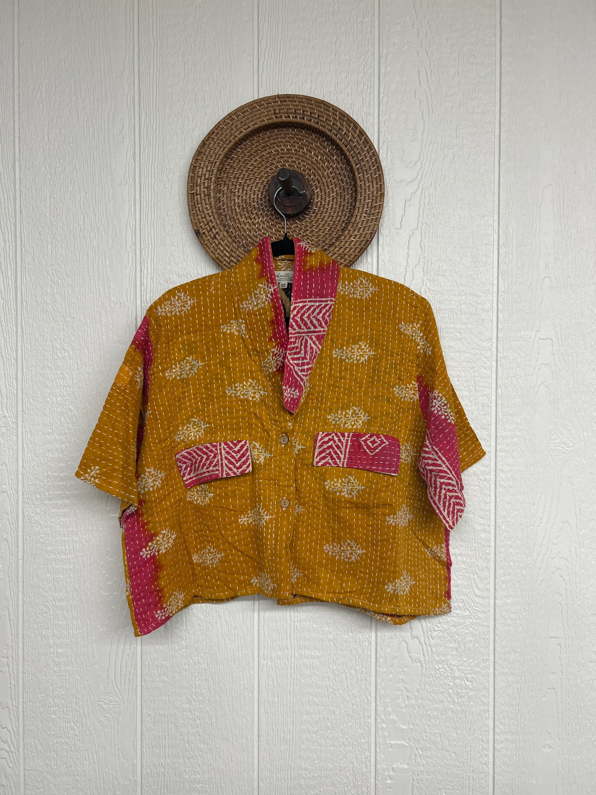The Clarity Crop is the cropped camp shirt of your dreams! Crafted from our ultra lux kantha stitched vintage cotton sari the Clarity crop features interior pockets, a button down placket, collar and trendy cropped boxy silhouette.