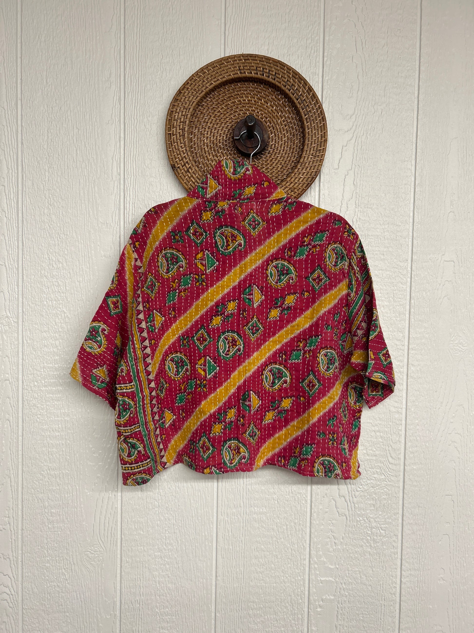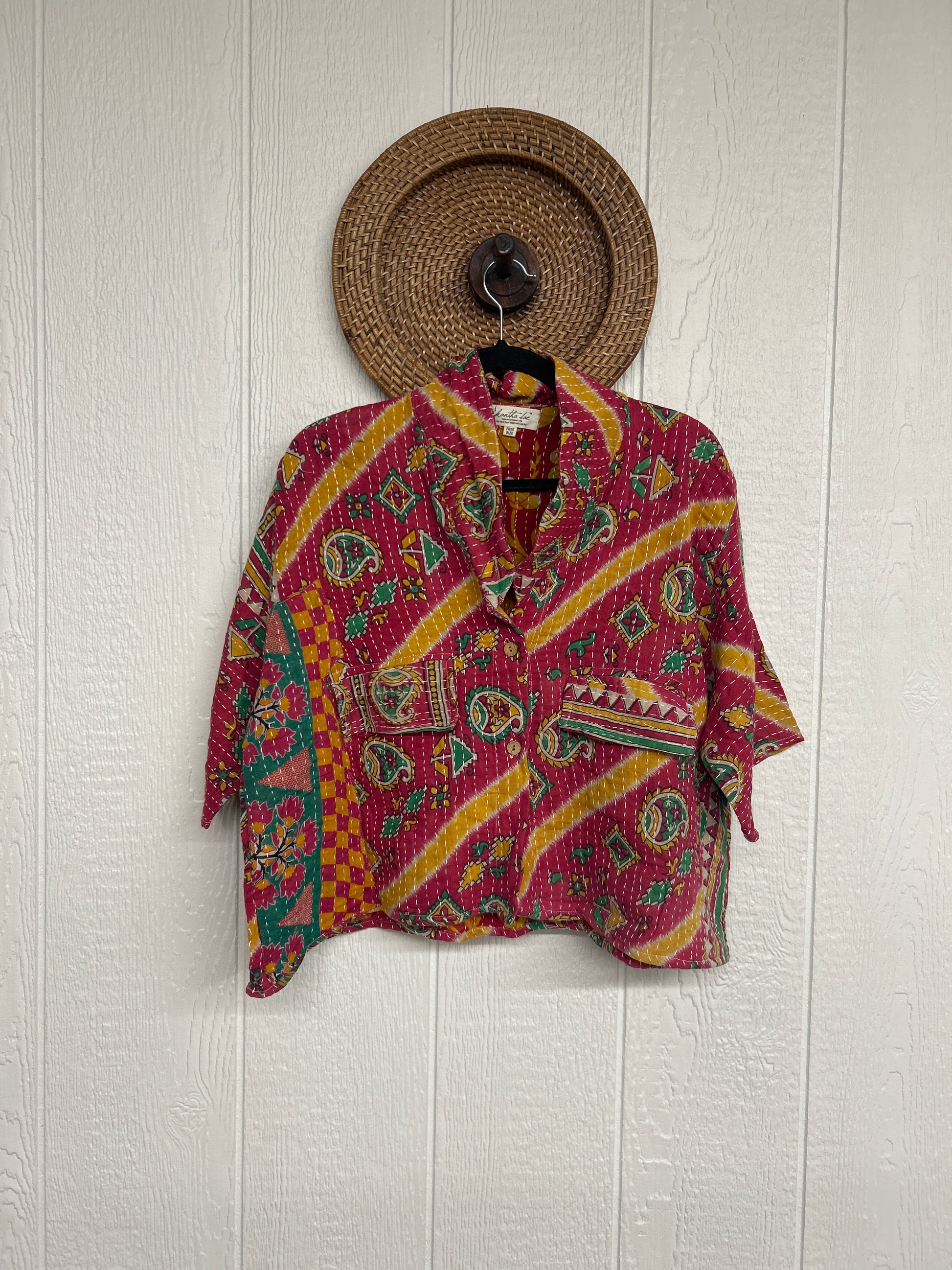 The Clarity Crop is the cropped camp shirt of your dreams! Crafted from our ultra lux kantha stitched vintage cotton sari the Clarity crop features interior pockets, a button down placket, collar and trendy cropped boxy silhouette.