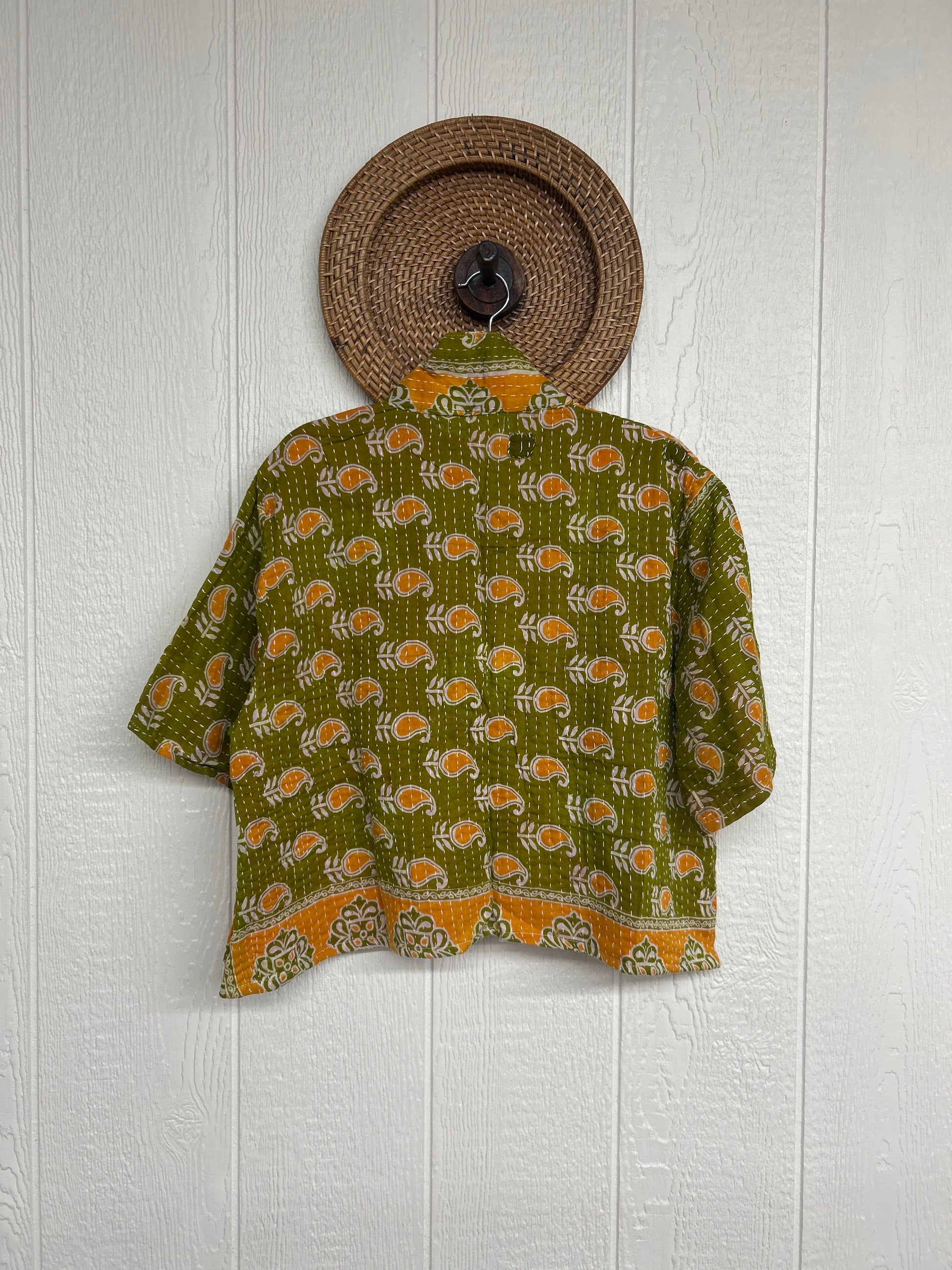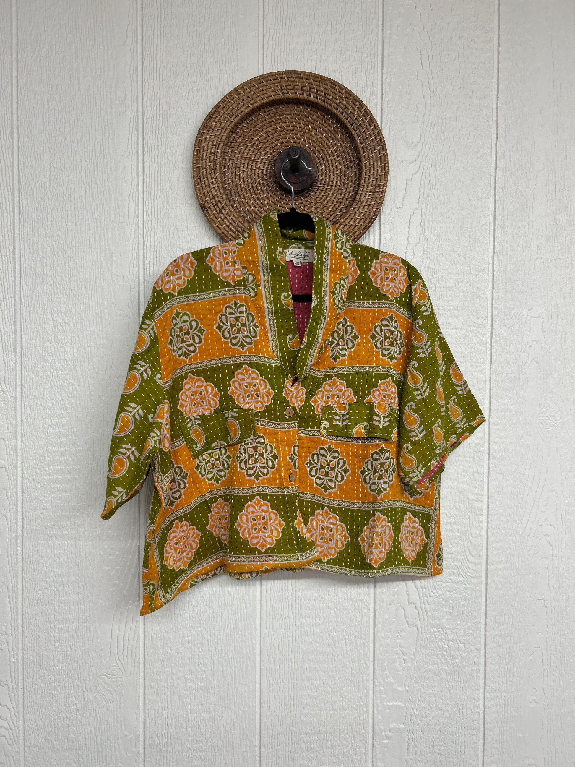 The Clarity Crop is the cropped camp shirt of your dreams! Crafted from our ultra lux kantha stitched vintage cotton sari the Clarity crop features interior pockets, a button down placket, collar and trendy cropped boxy silhouette.