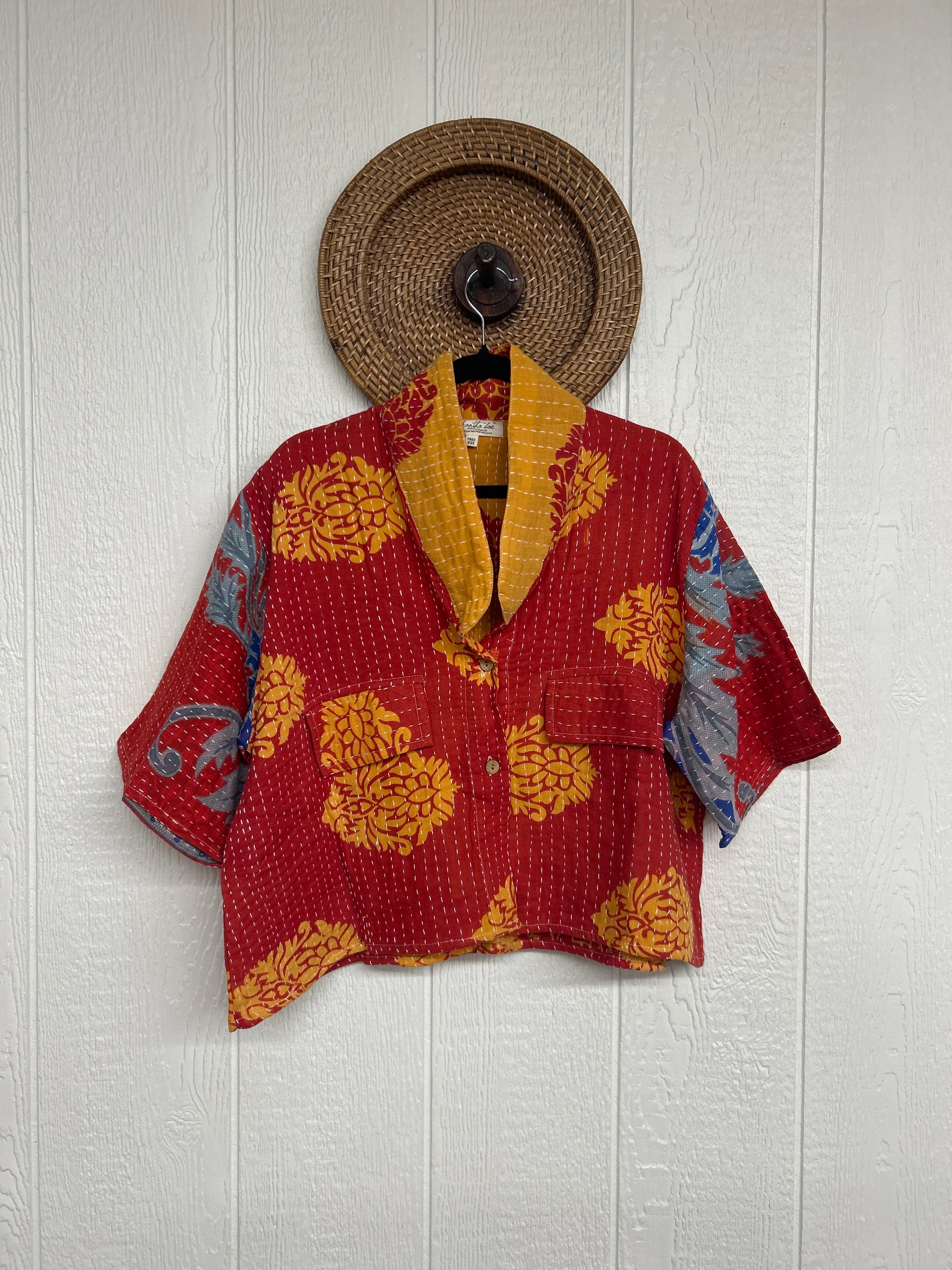 The Clarity Crop is the cropped camp shirt of your dreams! Crafted from our ultra lux kantha stitched vintage cotton sari the Clarity crop features interior pockets, a button down placket, collar and trendy cropped boxy silhouette.