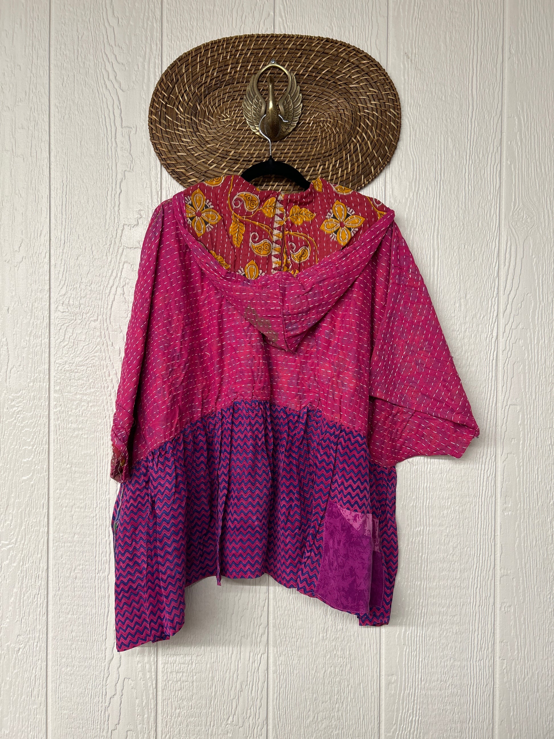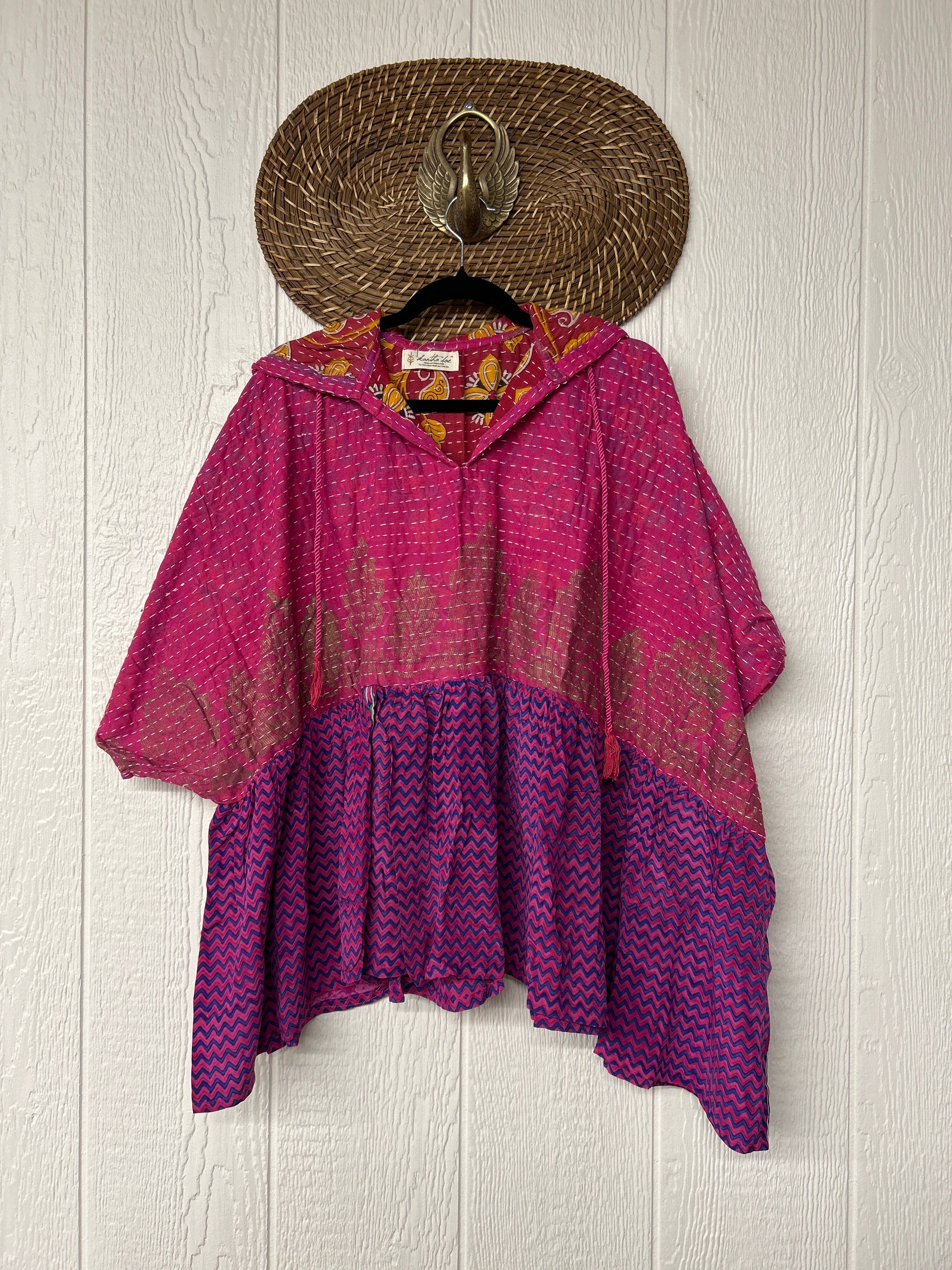 Your favorite throw on and go piece is made out of our vintage kantha embroidered sari with a crepe sari flounce. This poncho like silhouette is a flowy floaty dream.