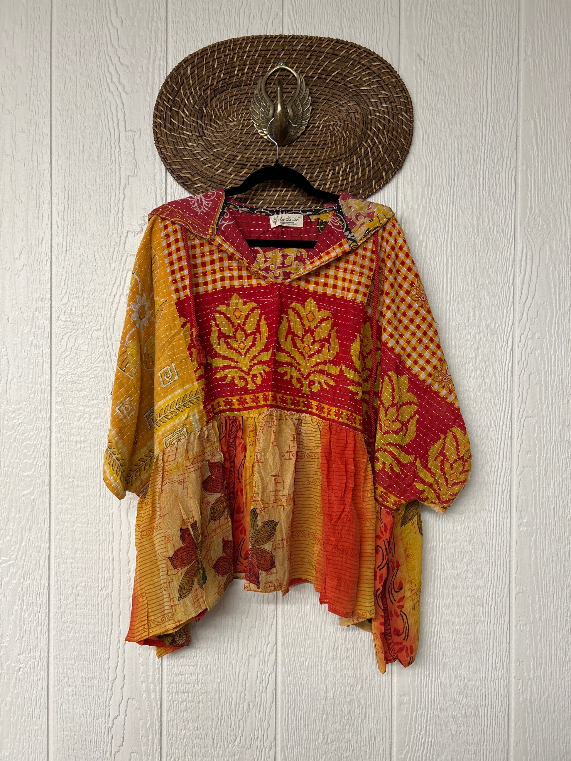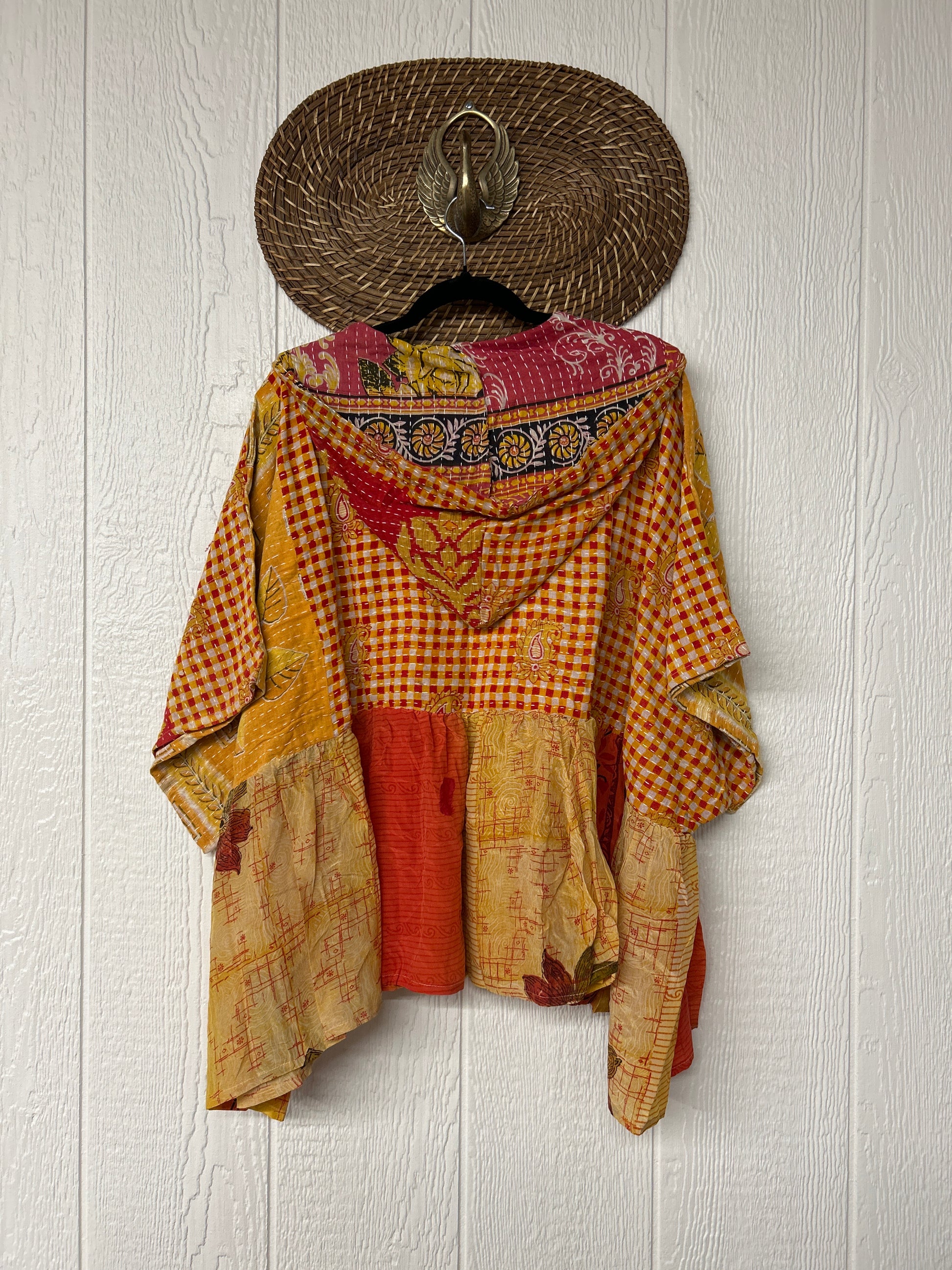 Your favorite throw on and go piece is made out of our vintage kantha embroidered sari with a crepe sari flounce. This poncho like silhouette is a flowy floaty dream.