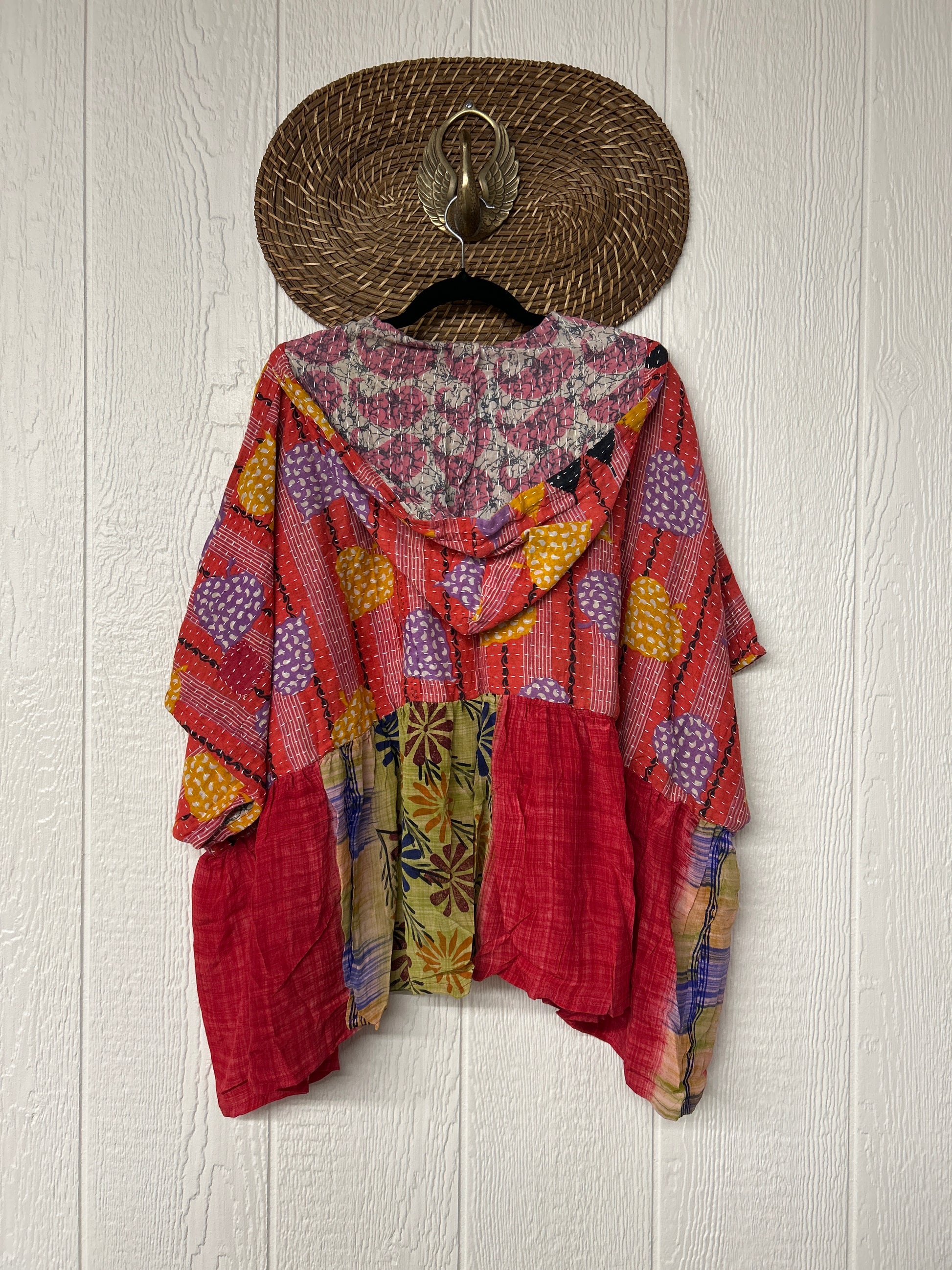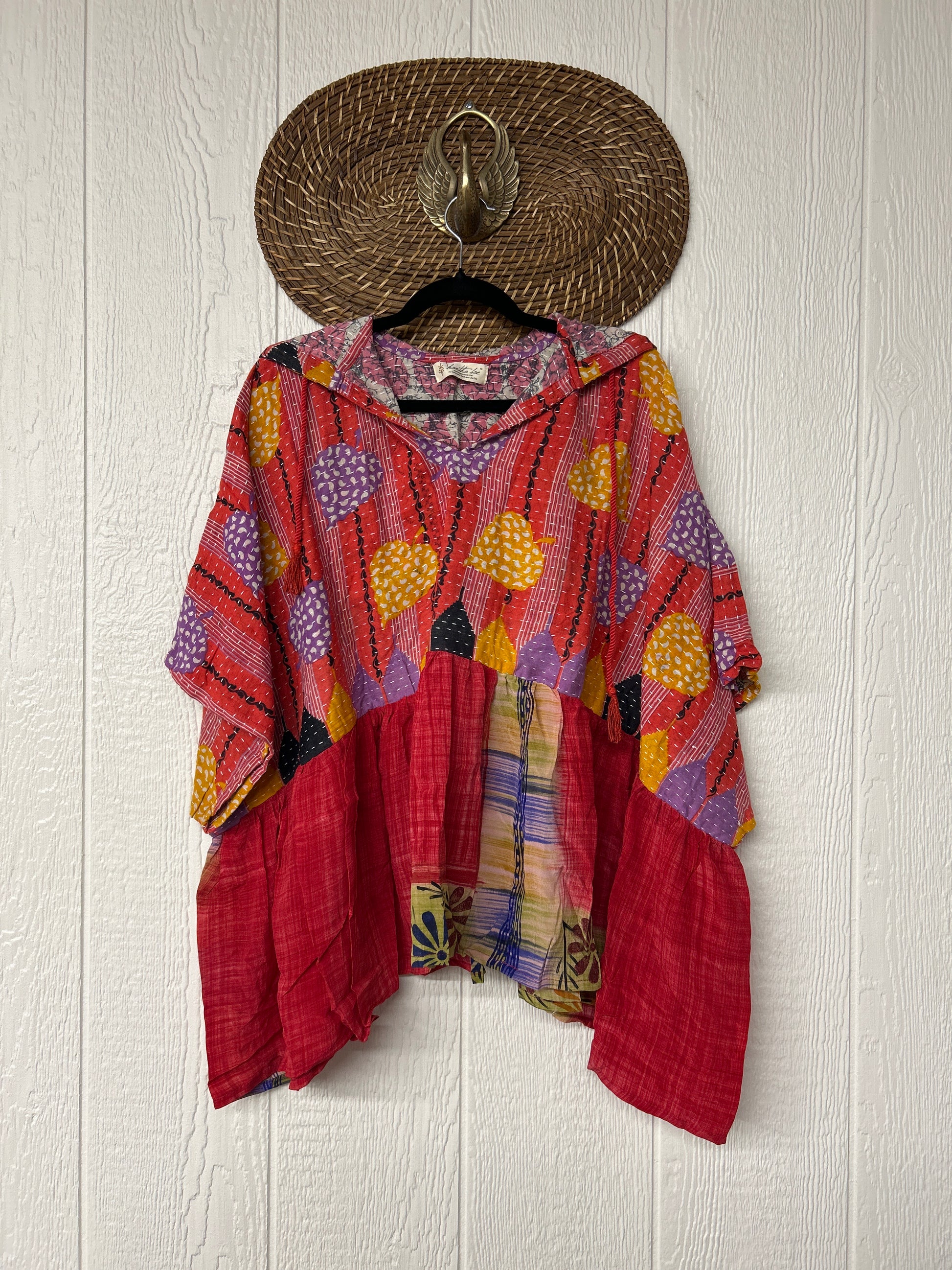 Your favorite throw on and go piece is made out of our vintage kantha embroidered sari with a crepe sari flounce. This poncho like silhouette is a flowy floaty dream.