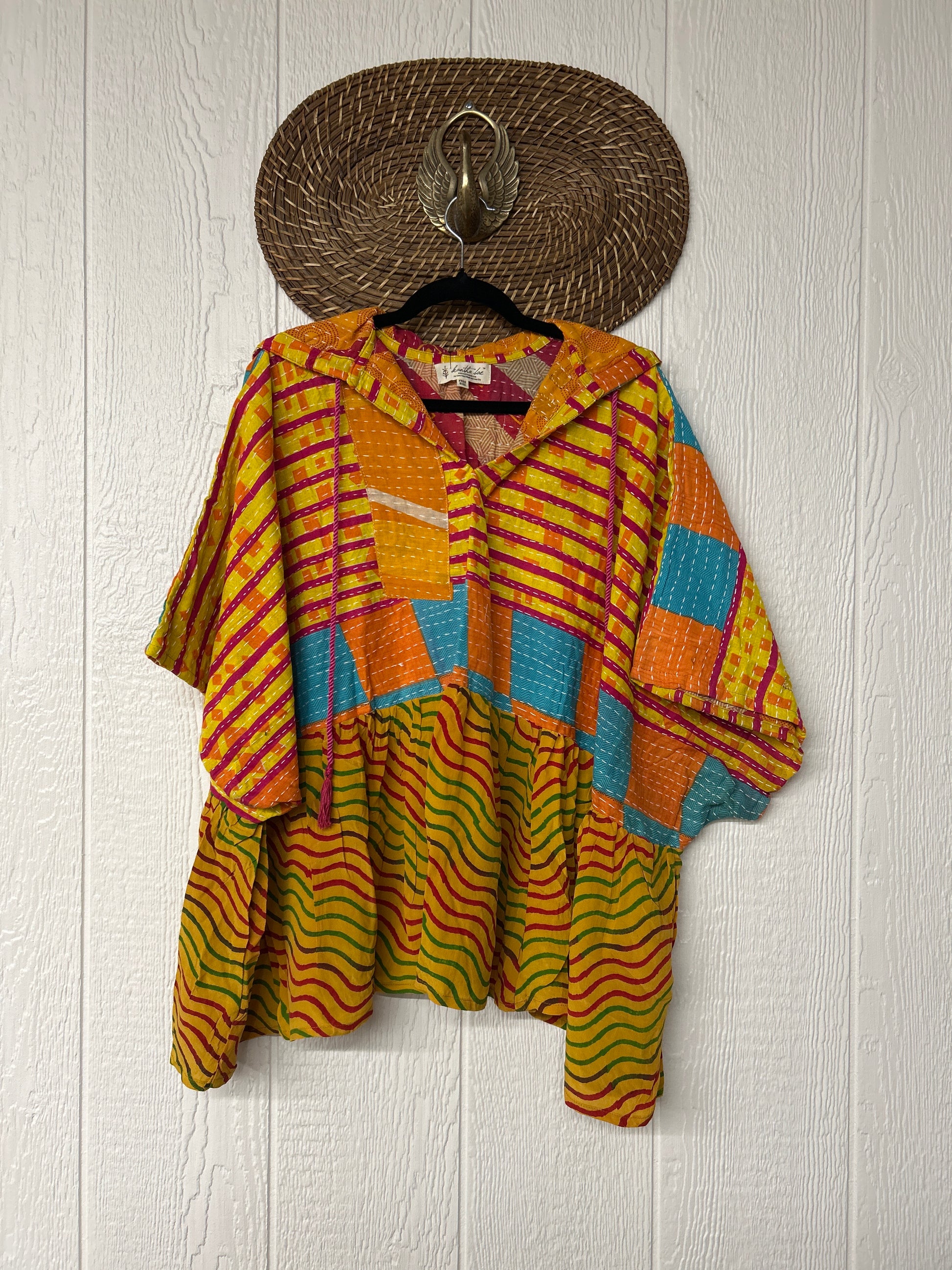 Your favorite throw on and go piece is made out of our vintage kantha embroidered sari with a crepe sari flounce. This poncho like silhouette is a flowy floaty dream.