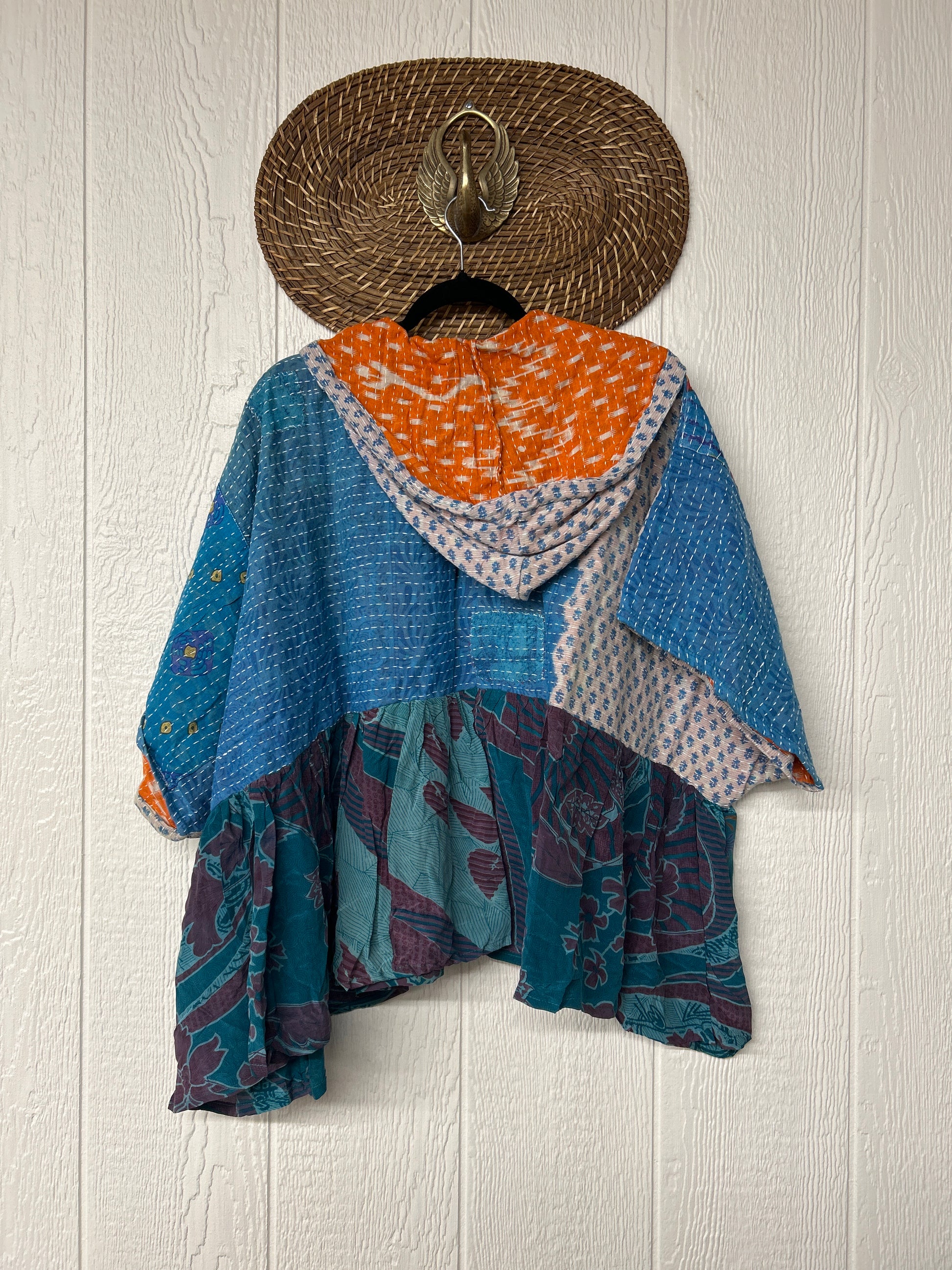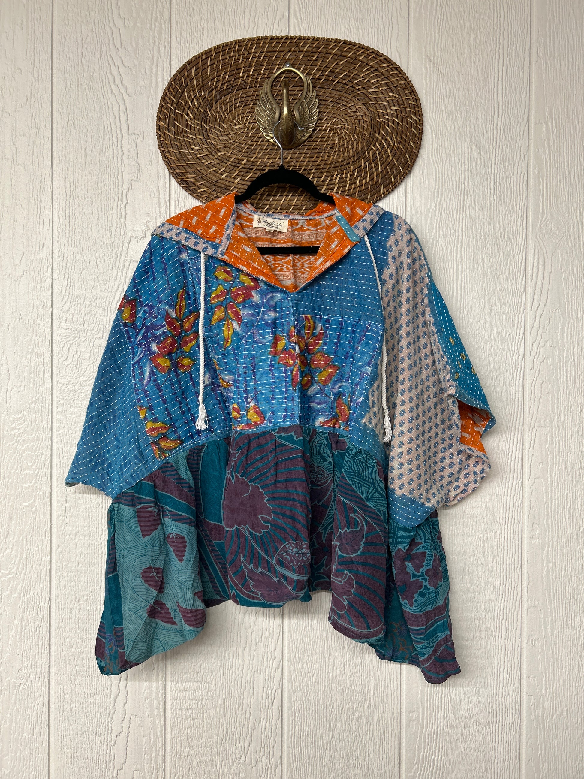 Your favorite throw on and go piece is made out of our vintage kantha embroidered sari with a crepe sari flounce. This poncho like silhouette is a flowy floaty dream.