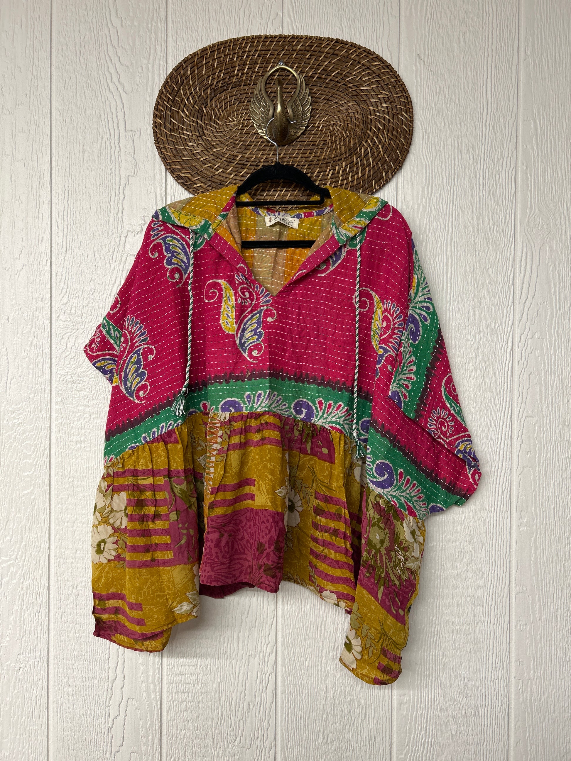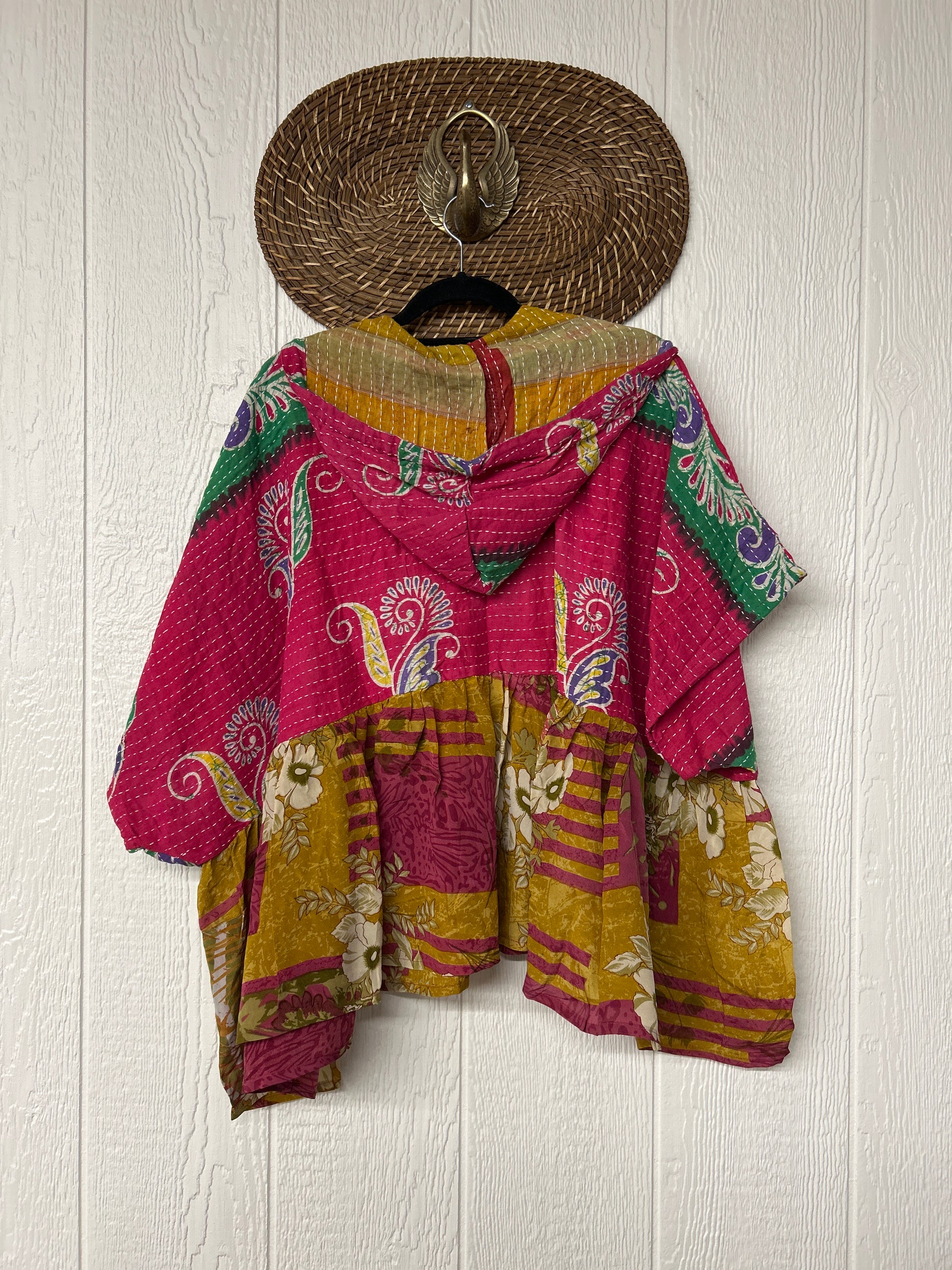 Your favorite throw on and go piece is made out of our vintage kantha embroidered sari with a crepe sari flounce. This poncho like silhouette is a flowy floaty dream.