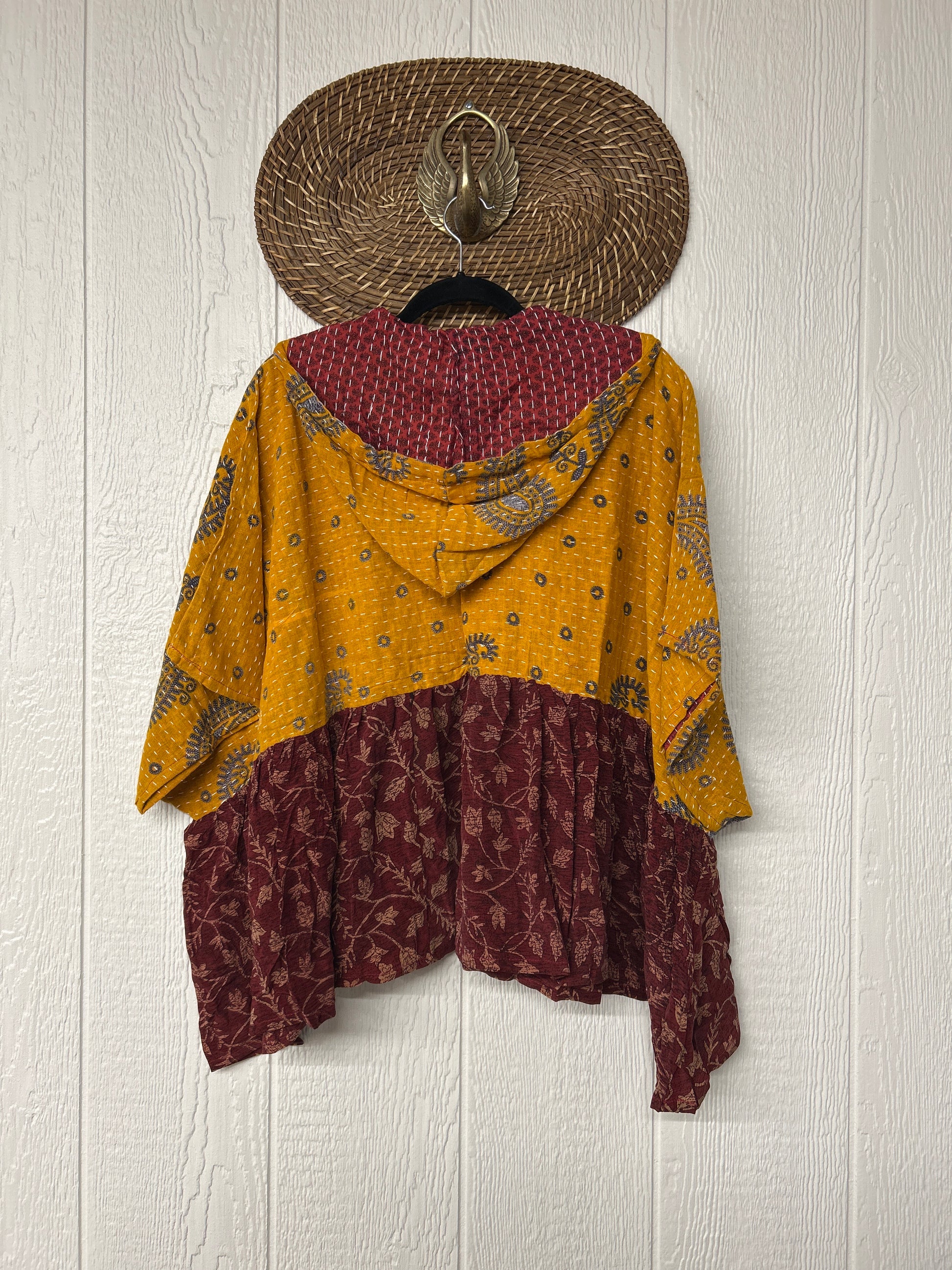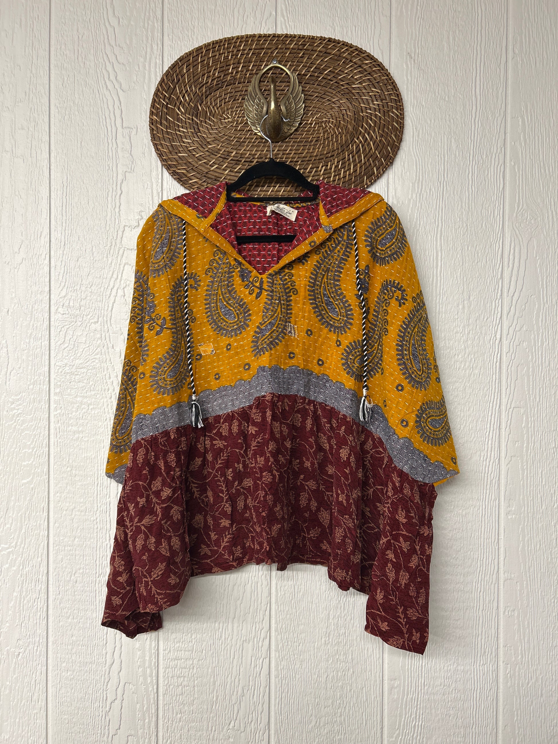 Your favorite throw on and go piece is made out of our vintage kantha embroidered sari with a crepe sari flounce. This poncho like silhouette is a flowy floaty dream.