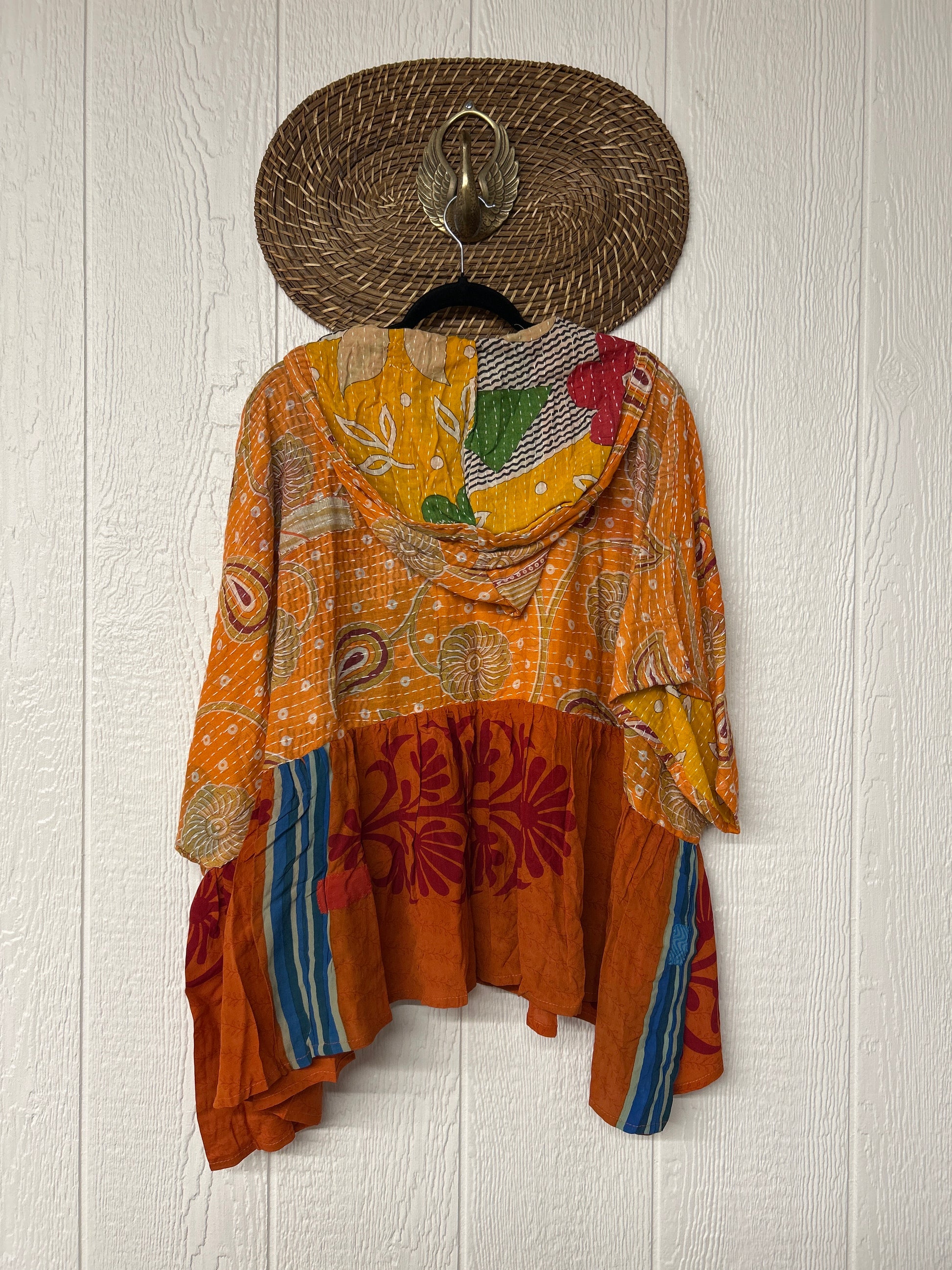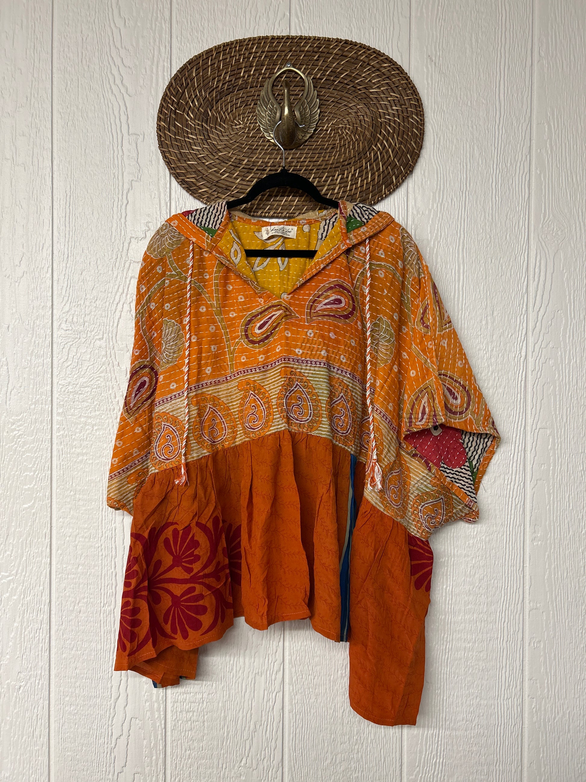 Your favorite throw on and go piece is made out of our vintage kantha embroidered sari with a crepe sari flounce. This poncho like silhouette is a flowy floaty dream.