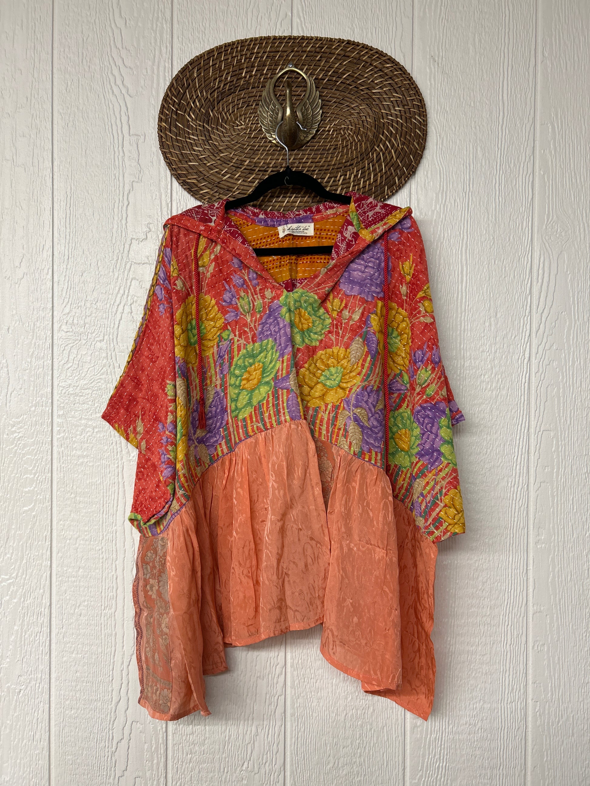 Your favorite throw on and go piece is made out of our vintage kantha embroidered sari with a crepe sari flounce. This poncho like silhouette is a flowy floaty dream.