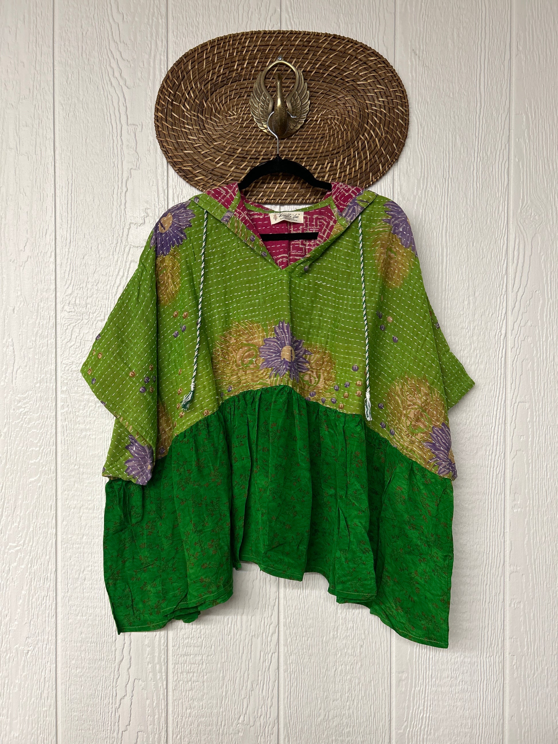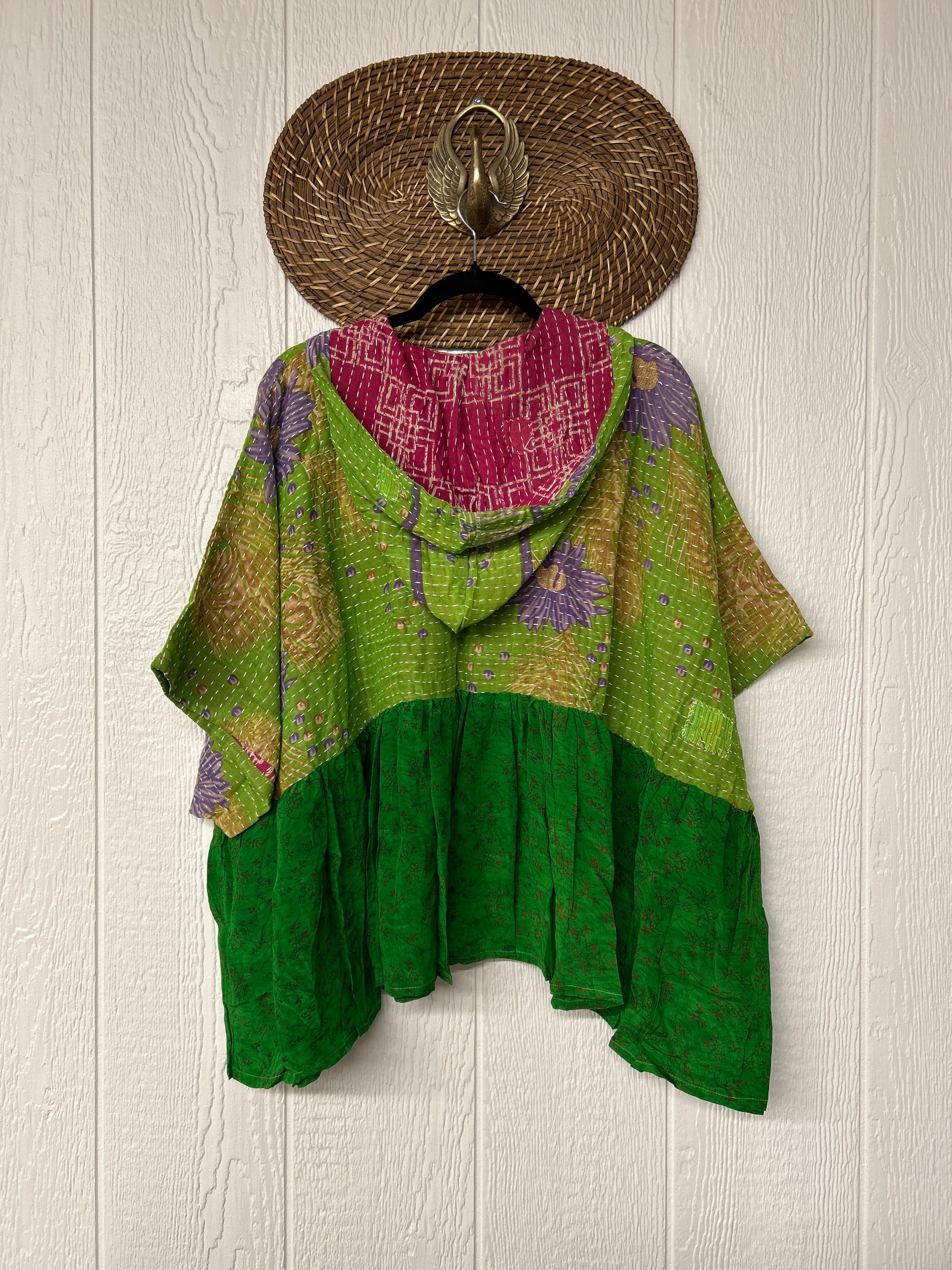 Your favorite throw on and go piece is made out of our vintage kantha embroidered sari with a crepe sari flounce. This poncho like silhouette is a flowy floaty dream.