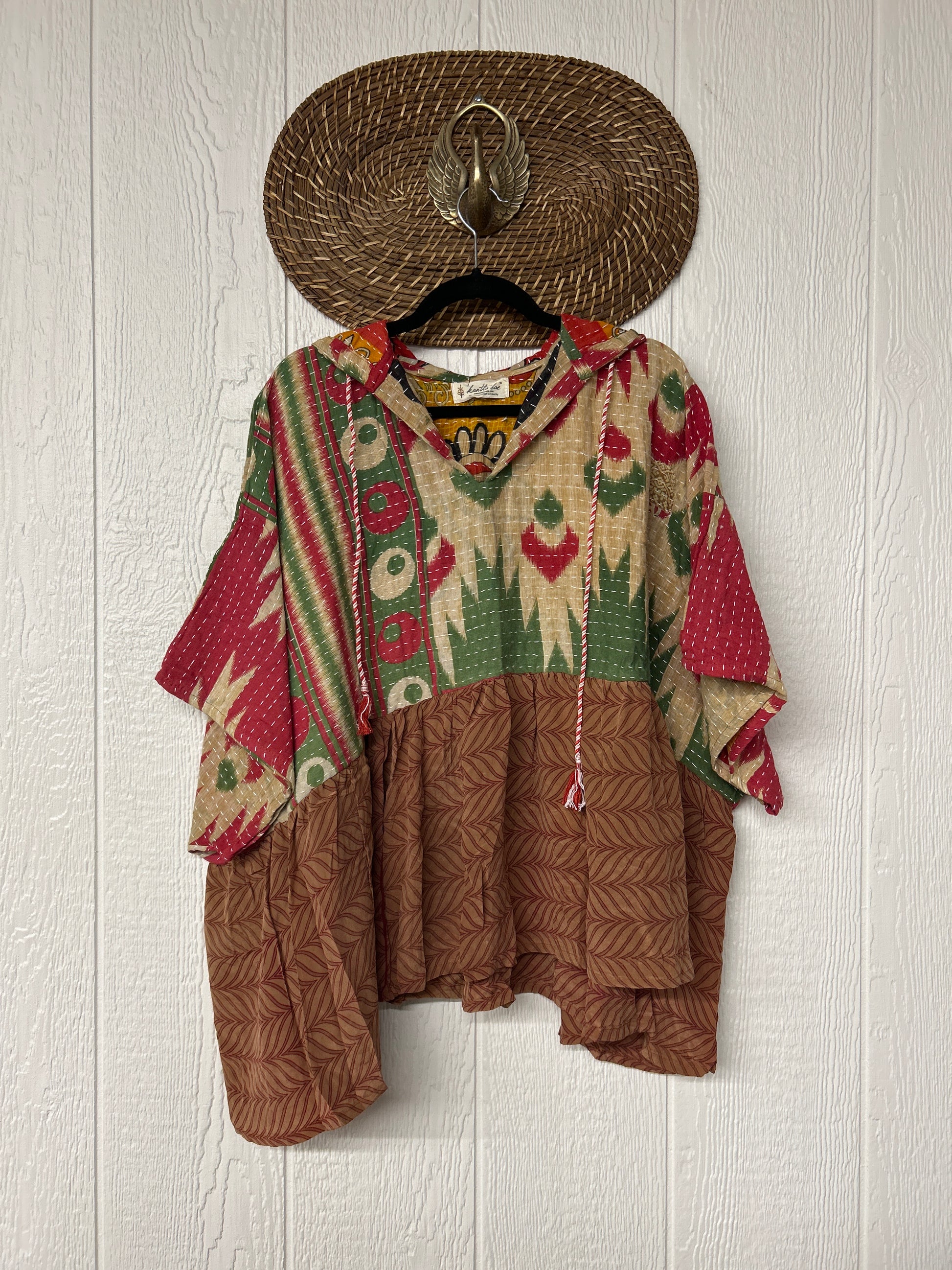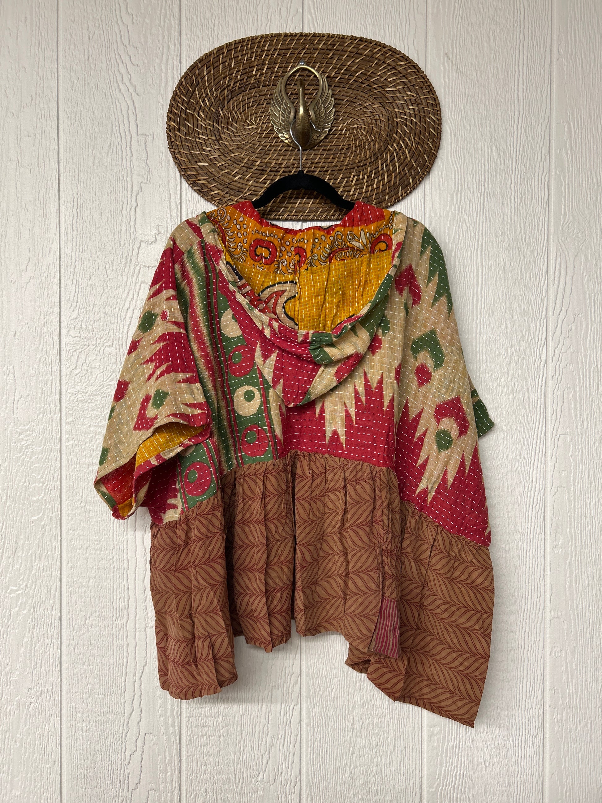 Your favorite throw on and go piece is made out of our vintage kantha embroidered sari with a crepe sari flounce. This poncho like silhouette is a flowy floaty dream.