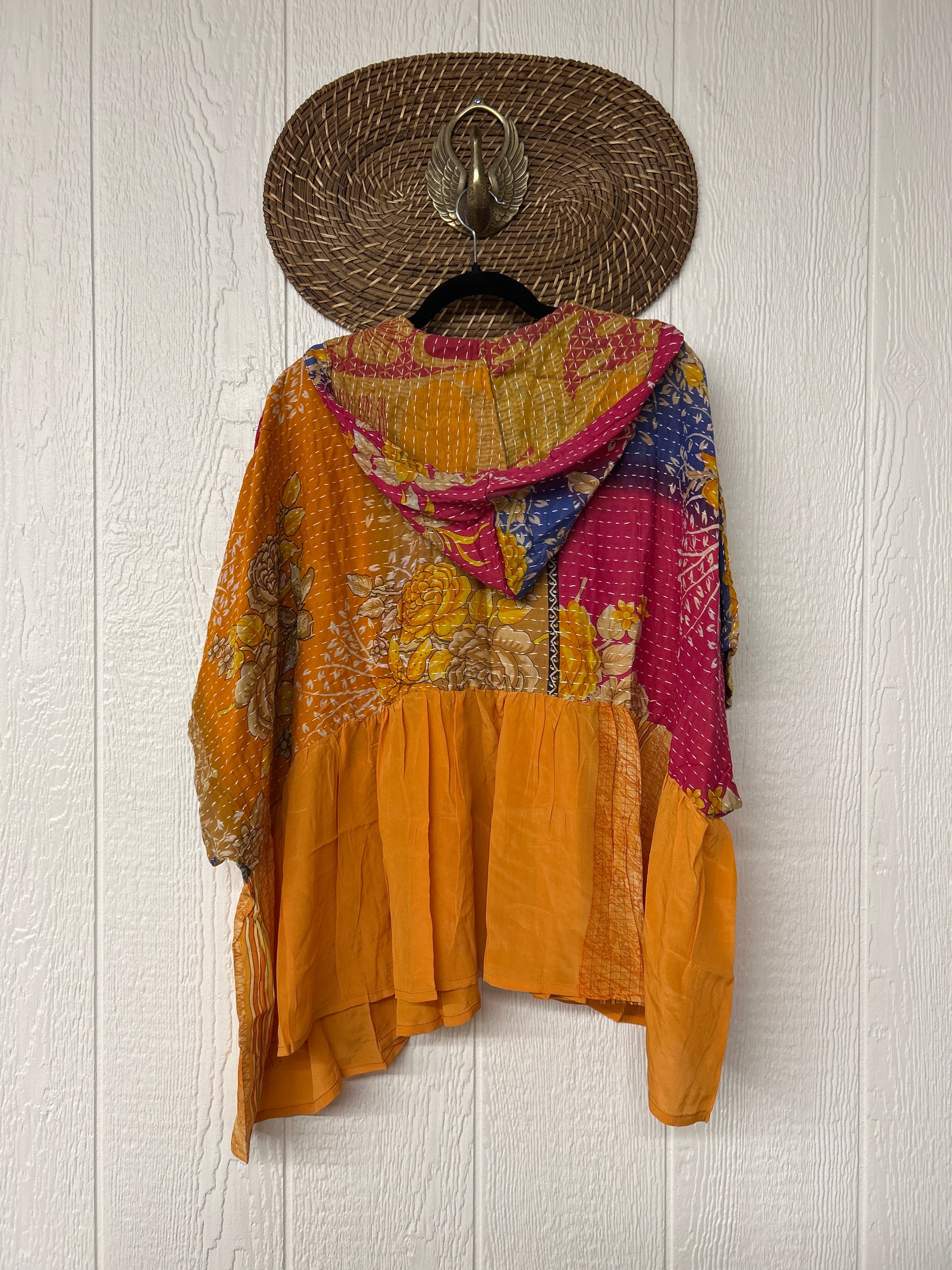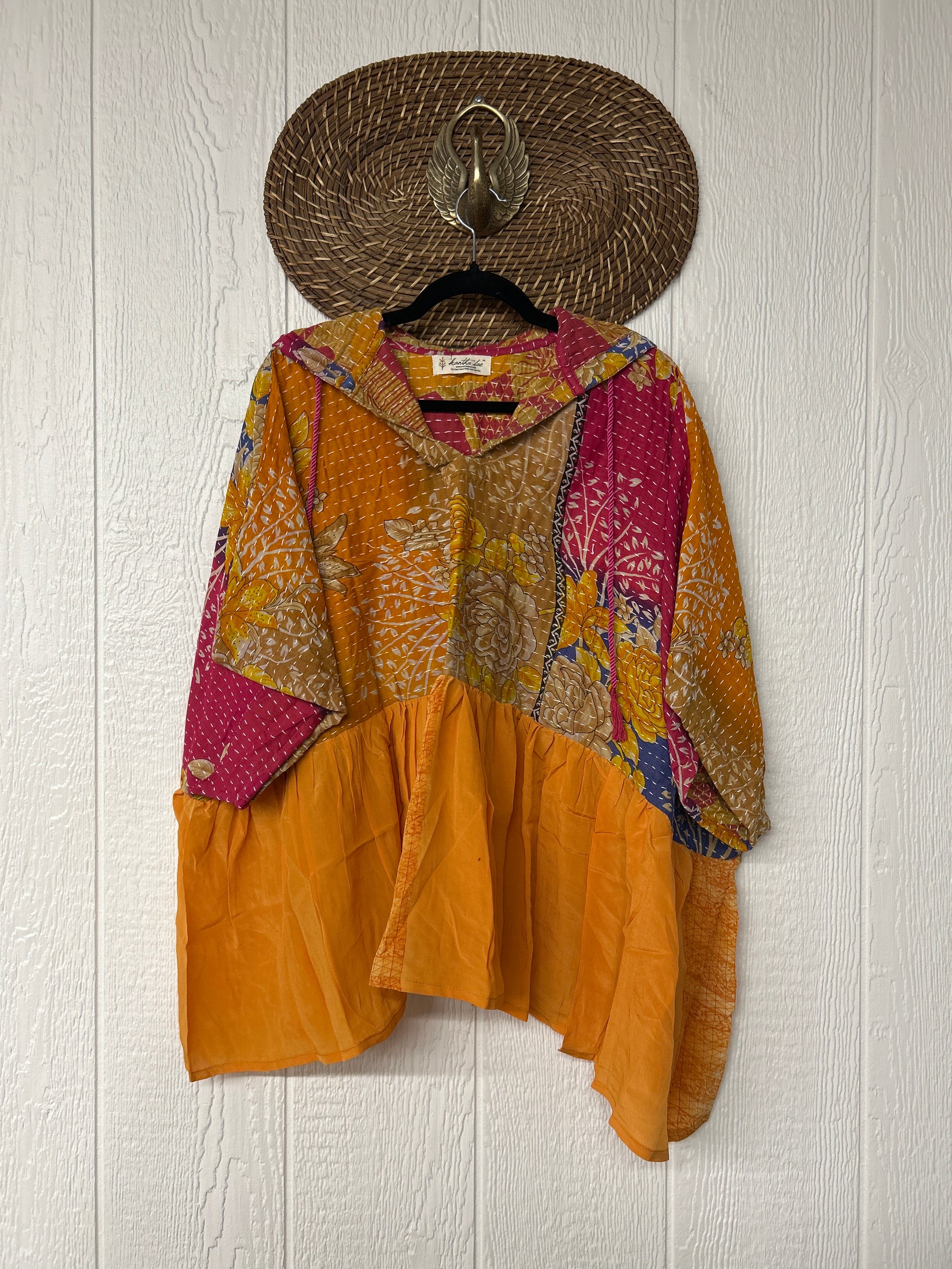 Your favorite throw on and go piece is made out of our vintage kantha embroidered sari with a crepe sari flounce. This poncho like silhouette is a flowy floaty dream.