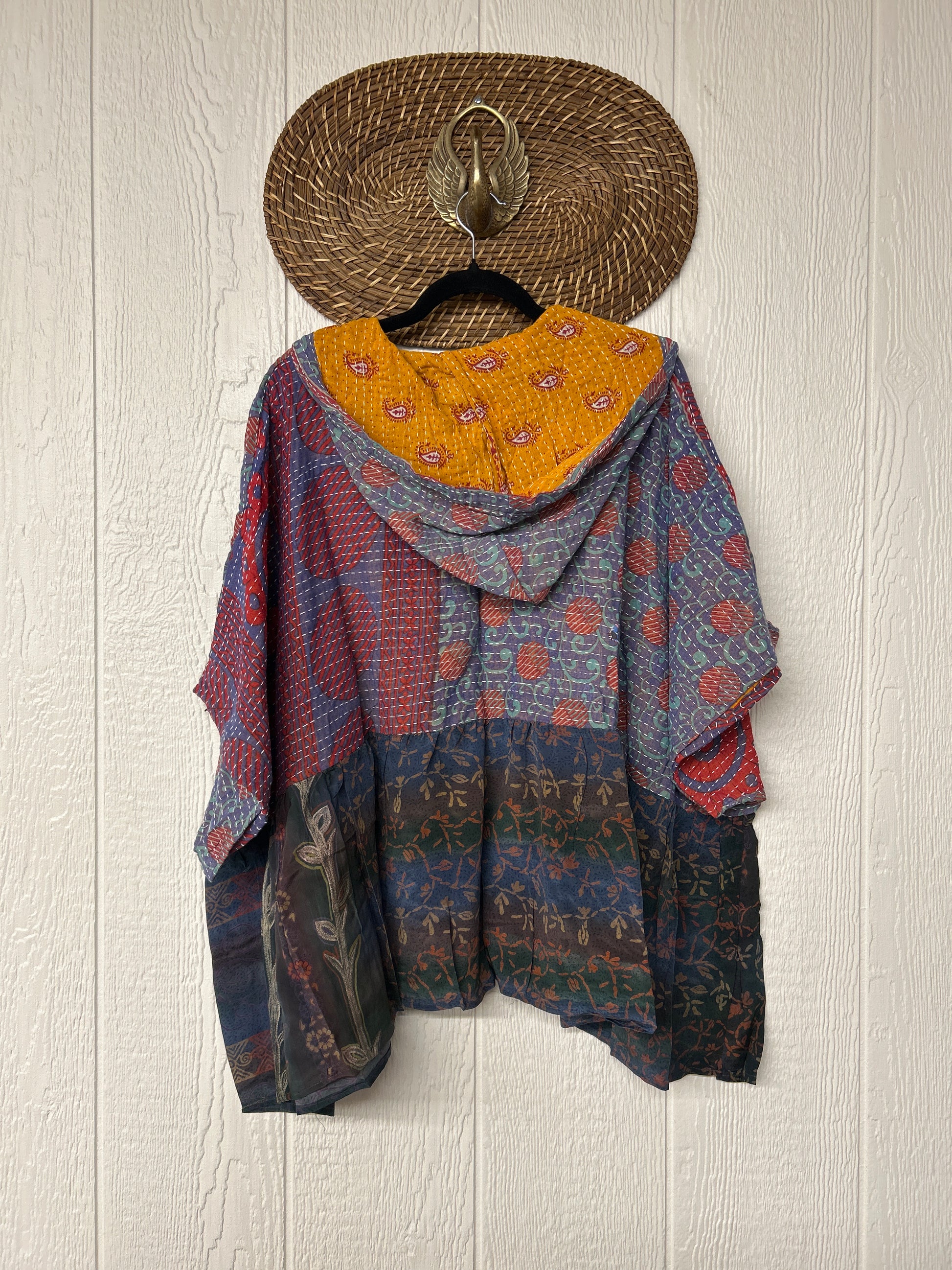 Your favorite throw on and go piece is made out of our vintage kantha embroidered sari with a crepe sari flounce. This poncho like silhouette is a flowy floaty dream.