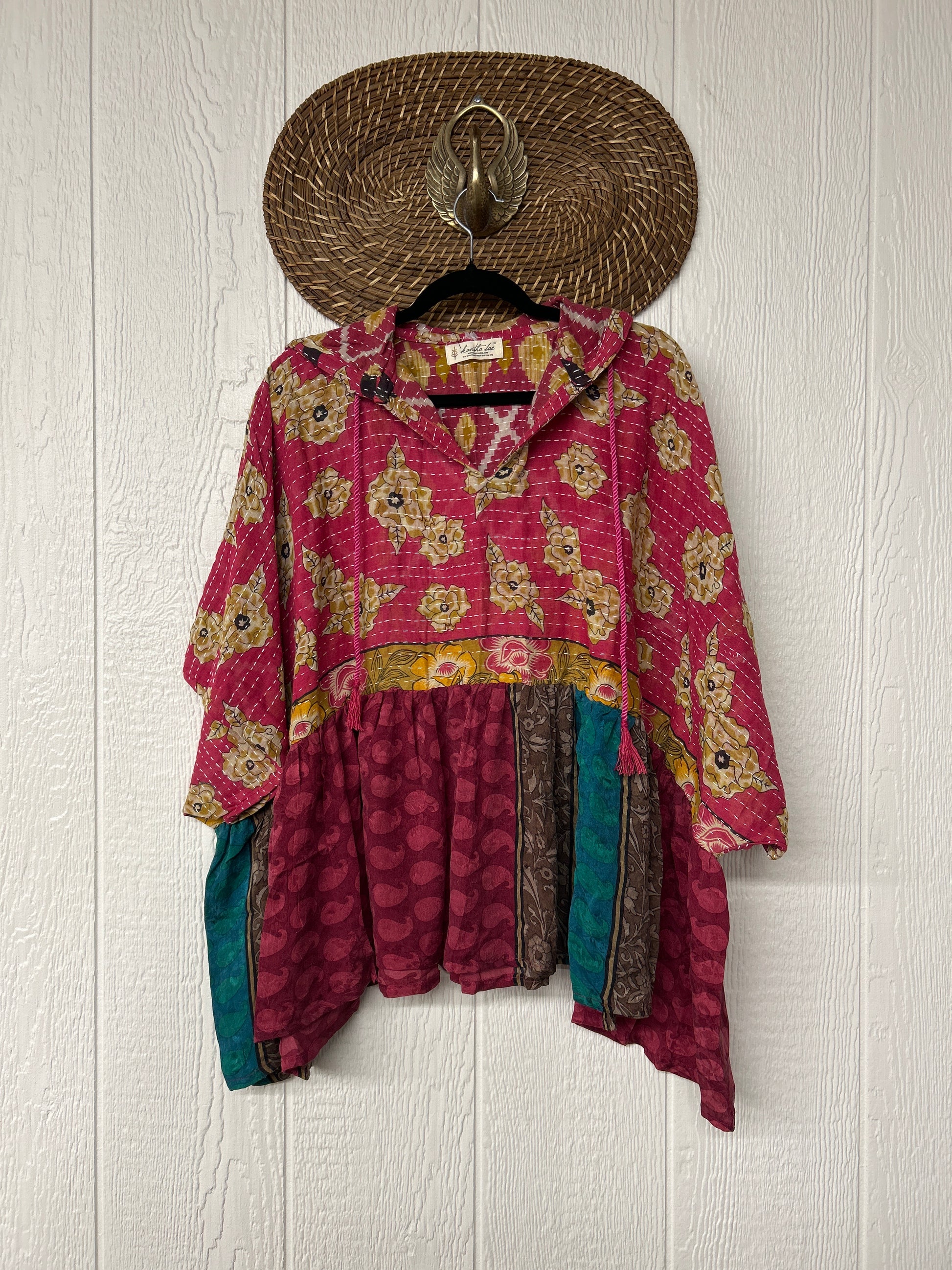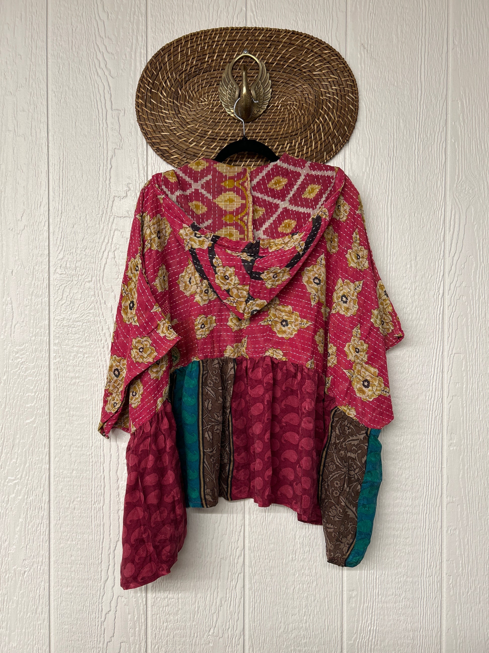 Your favorite throw on and go piece is made out of our vintage kantha embroidered sari with a crepe sari flounce. This poncho like silhouette is a flowy floaty dream.