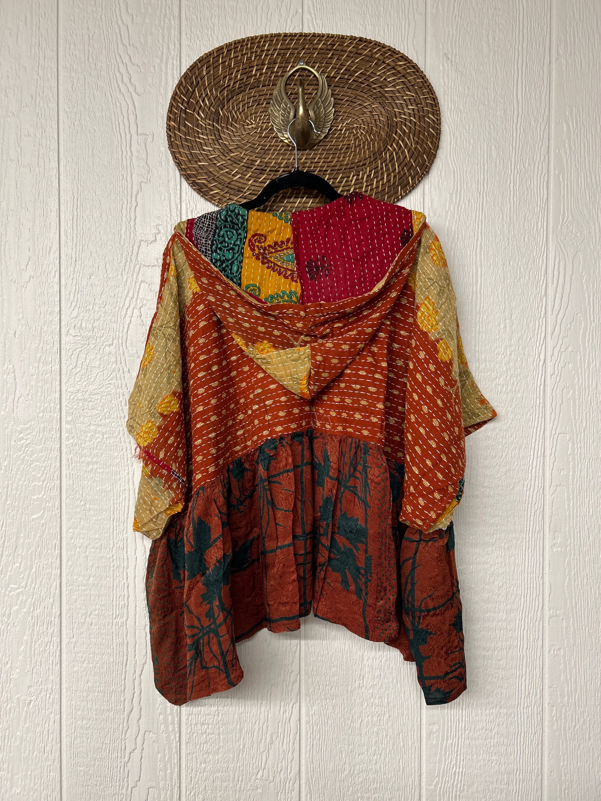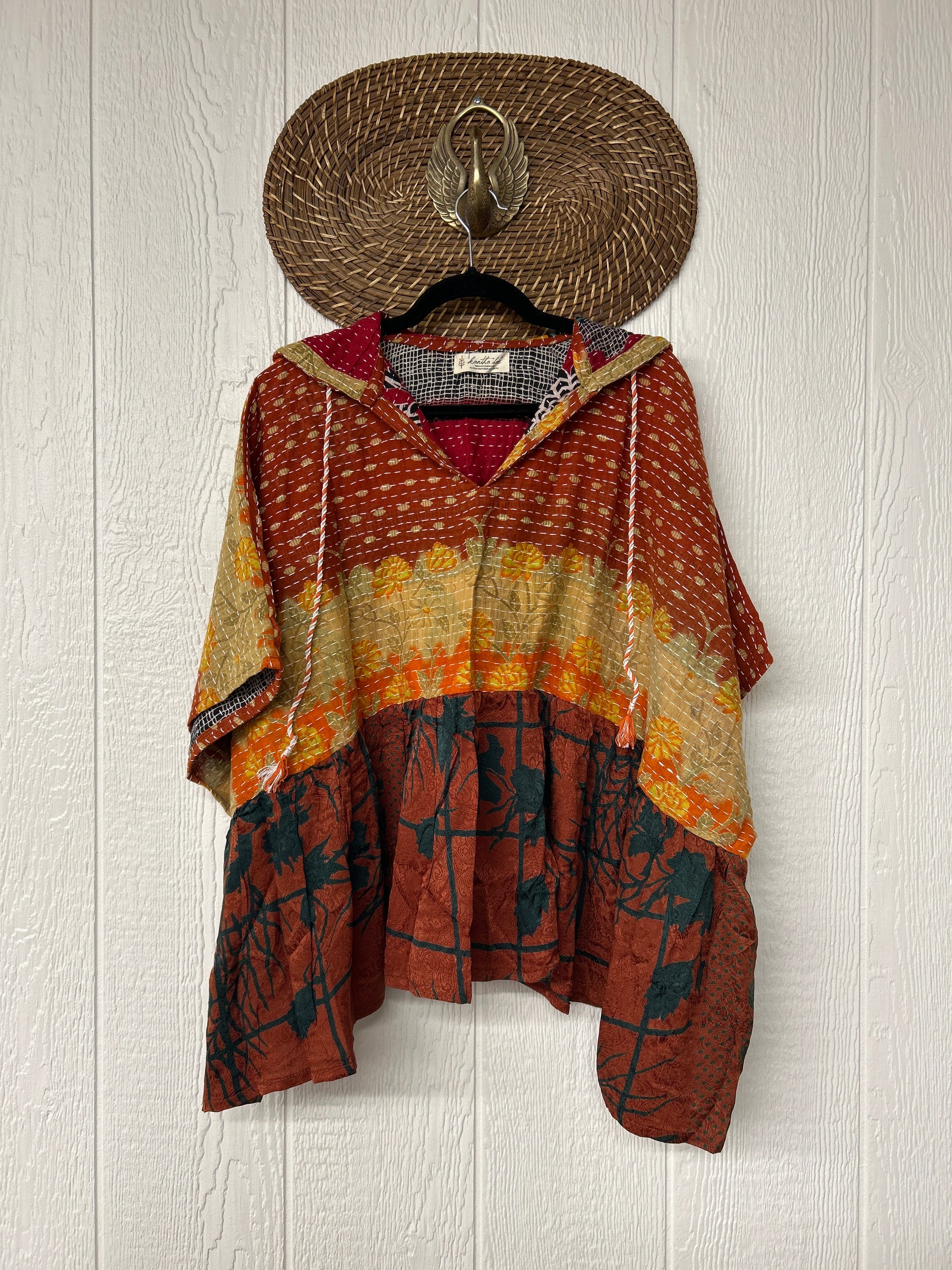 Your favorite throw on and go piece is made out of our vintage kantha embroidered sari with a crepe sari flounce. This poncho like silhouette is a flowy floaty dream.