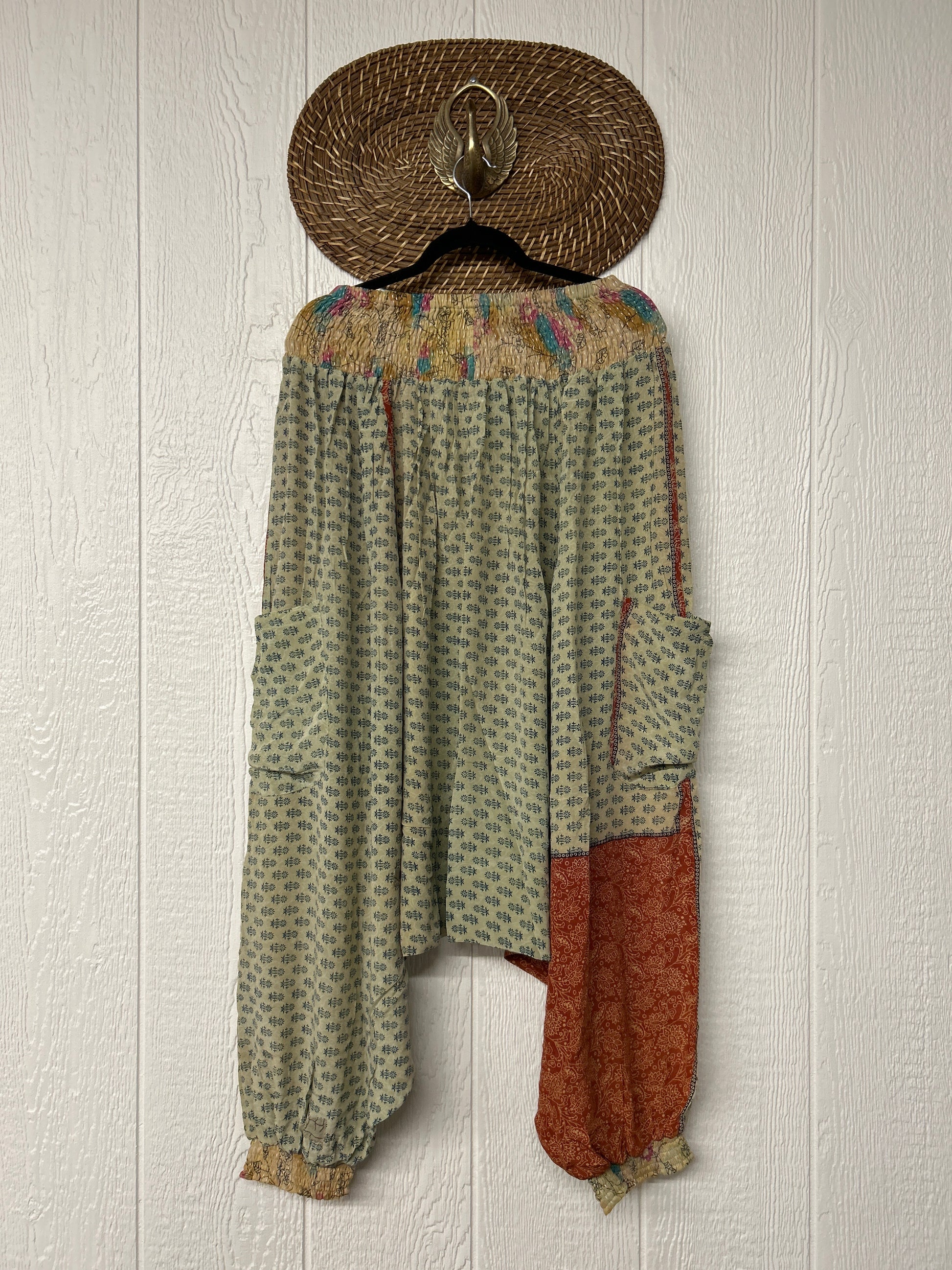 Made from vintage crepe sari, these are perfectly slouchy with a low harem drop for that effortless, flowy feel. Featuring deep side pockets, kantha stretch at the ankles, and a kantha smocked waistband that feels smooth and soft on the skin.