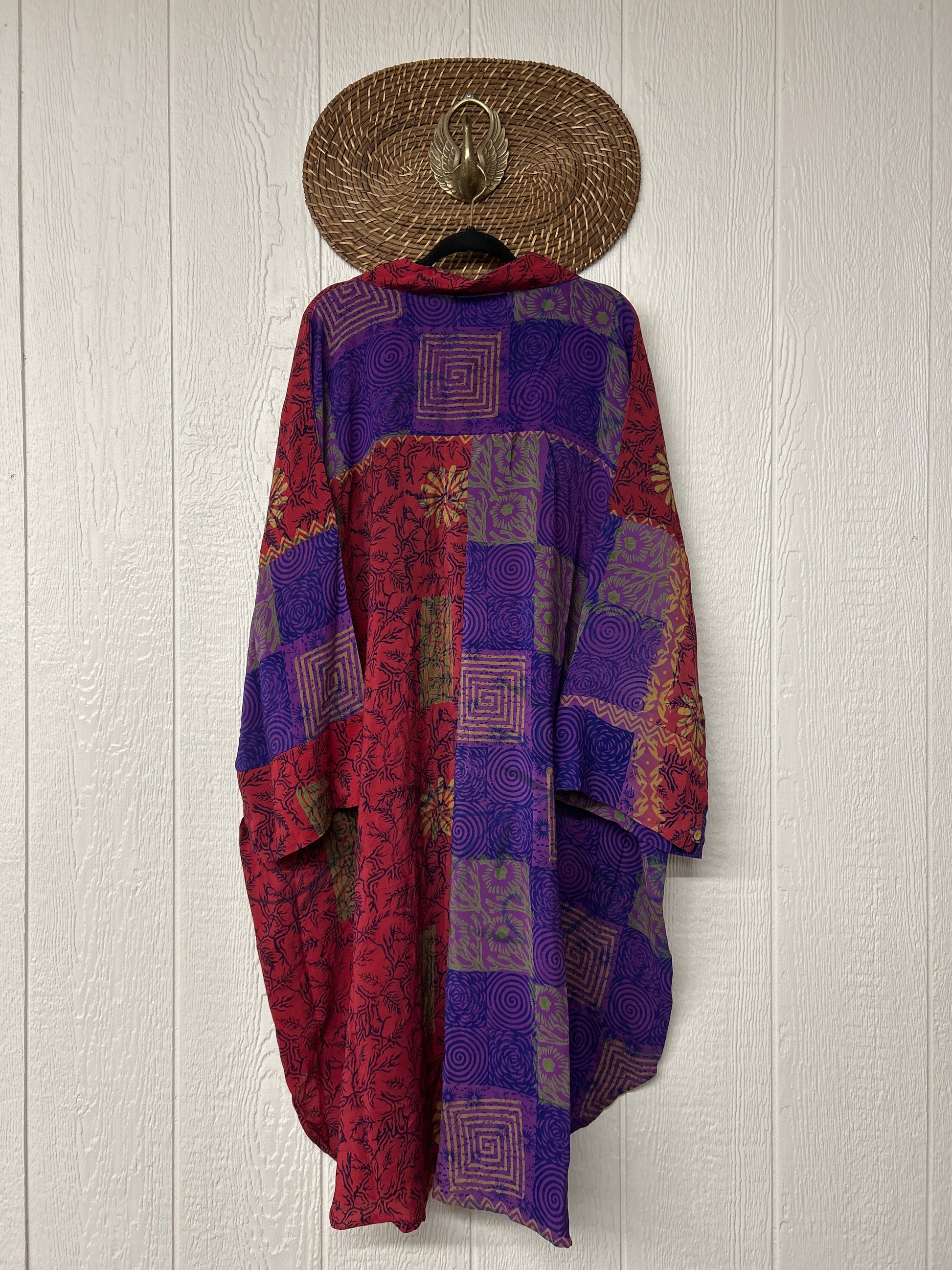 Made from our vintage crepe sari, this billowy dream functional buttons, two deep pockets in the front, dreamy longsleeves and a curved bottom.