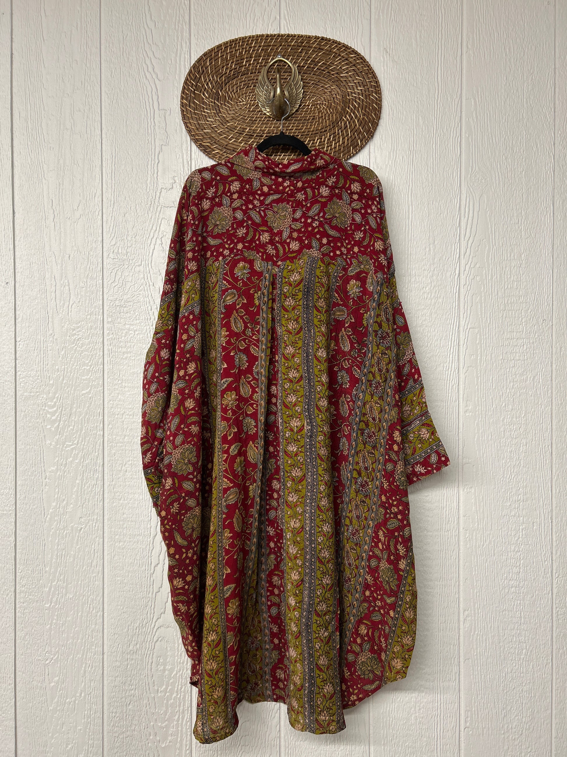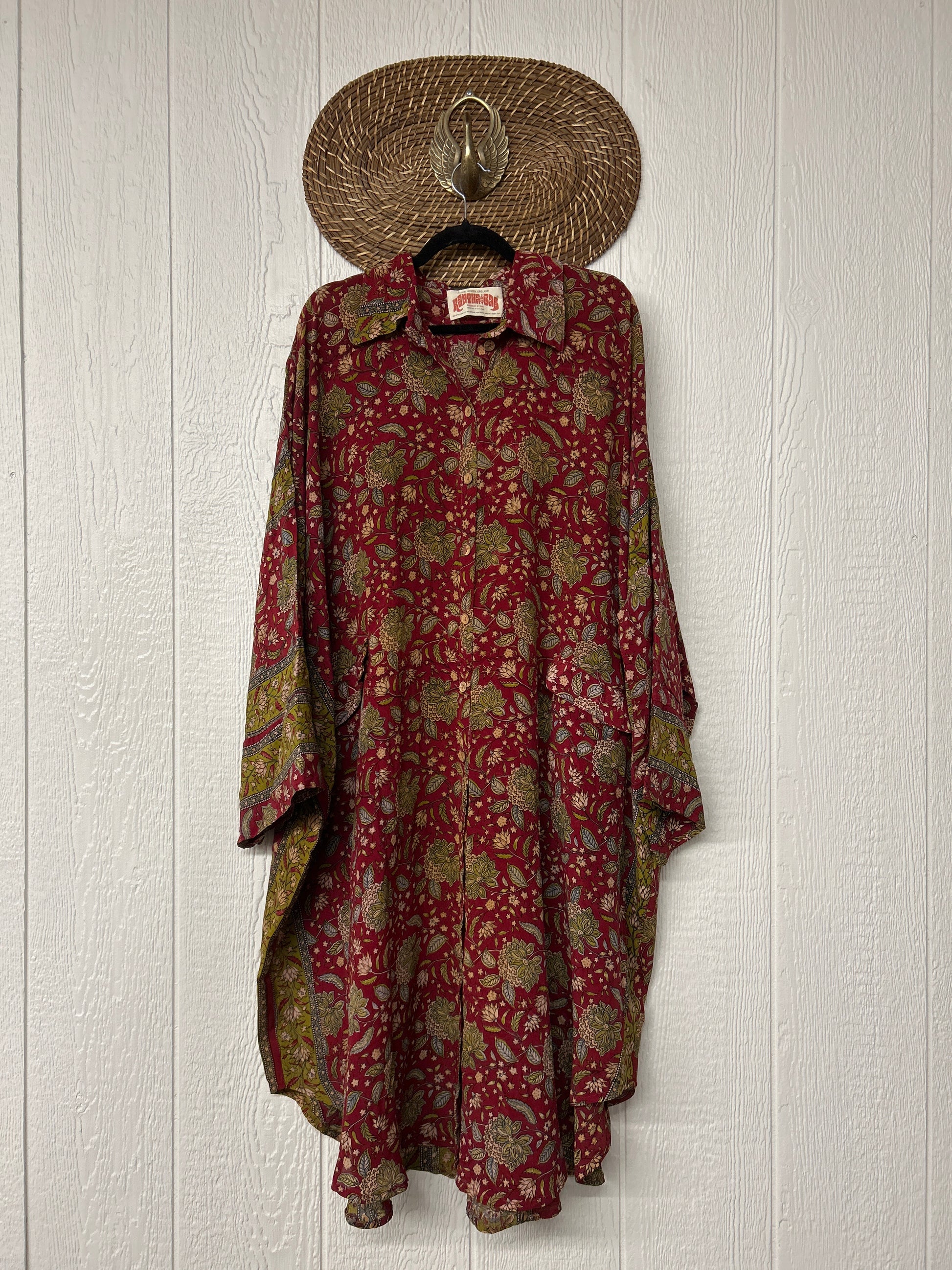 Made from our vintage crepe sari, this billowy dream functional buttons, two deep pockets in the front, dreamy longsleeves and a curved bottom.