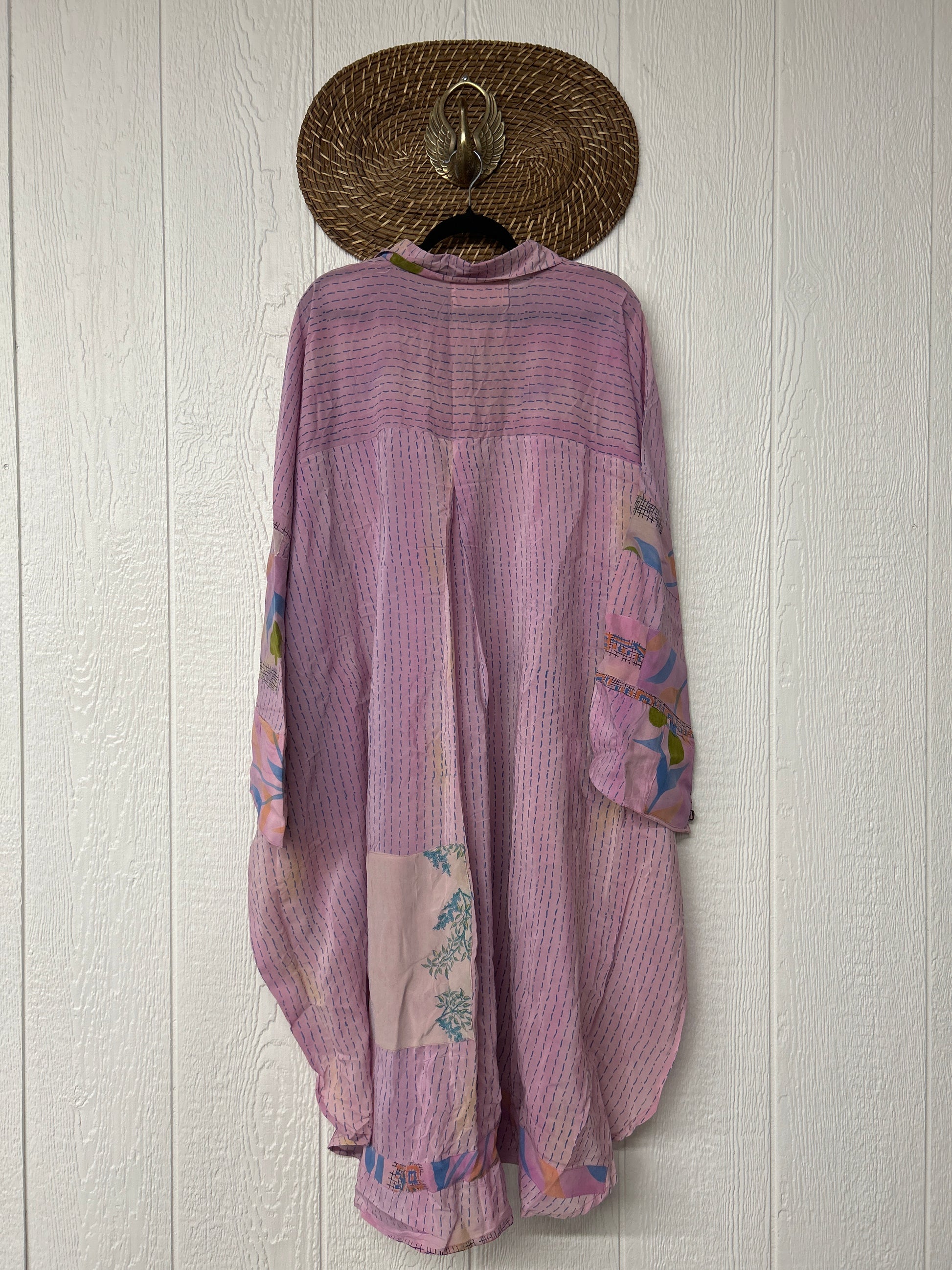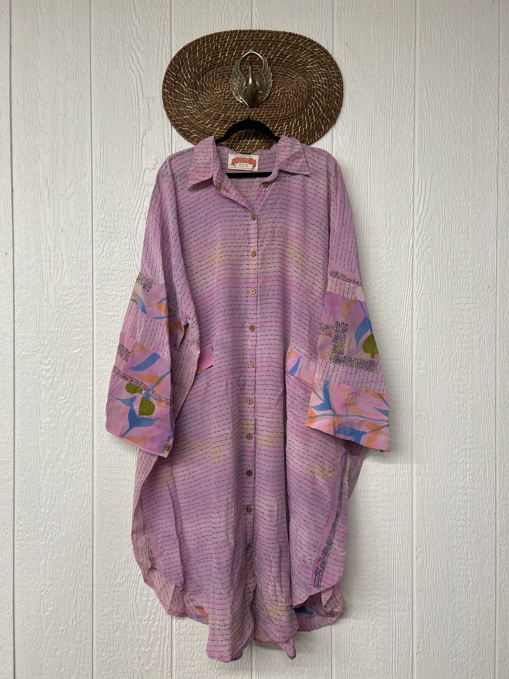Made from our vintage crepe sari, this billowy dream functional buttons, two deep pockets in the front, dreamy longsleeves and a curved bottom.