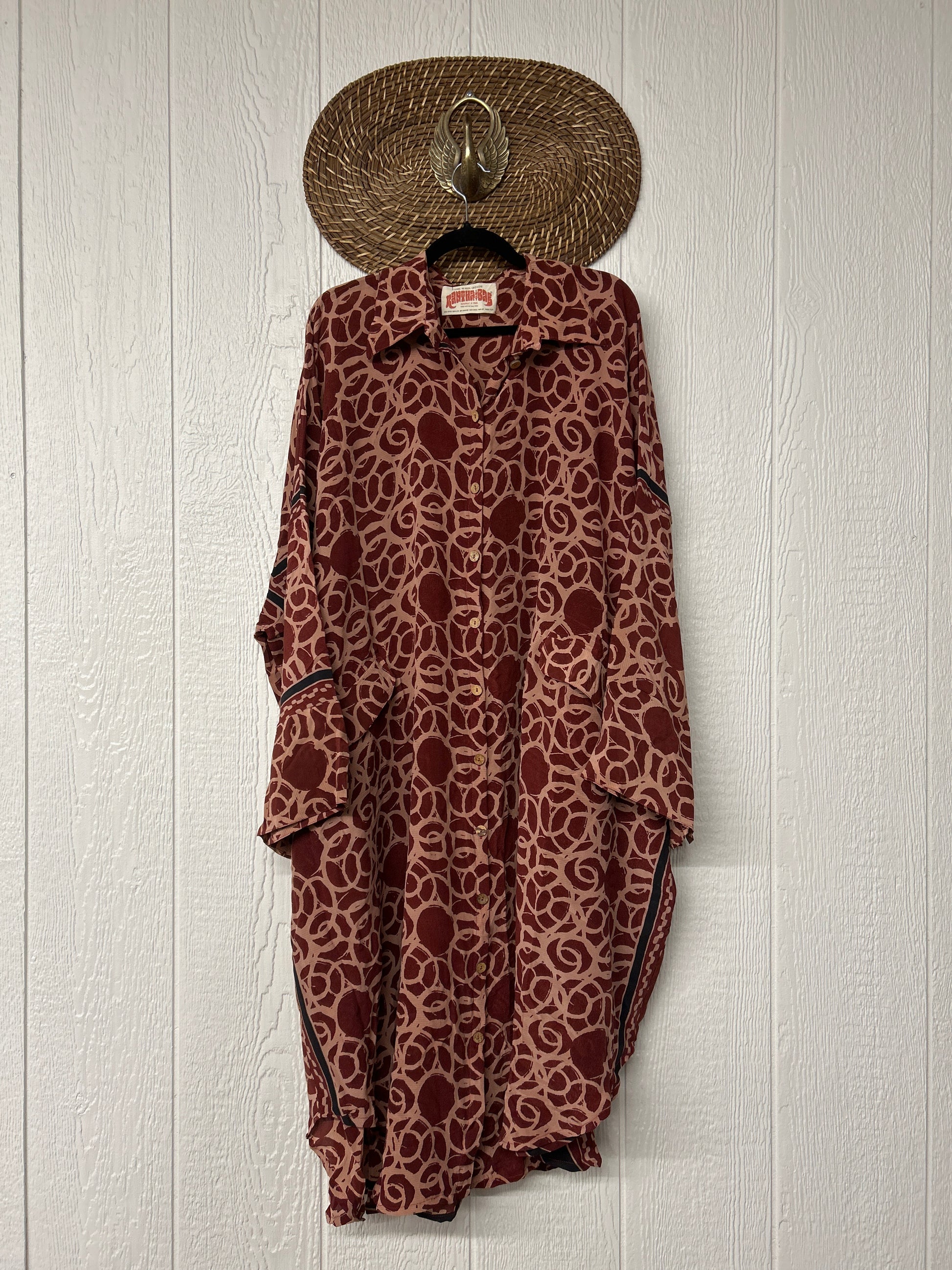 Made from our vintage crepe sari, this billowy dream functional buttons, two deep pockets in the front, dreamy longsleeves and a curved bottom.