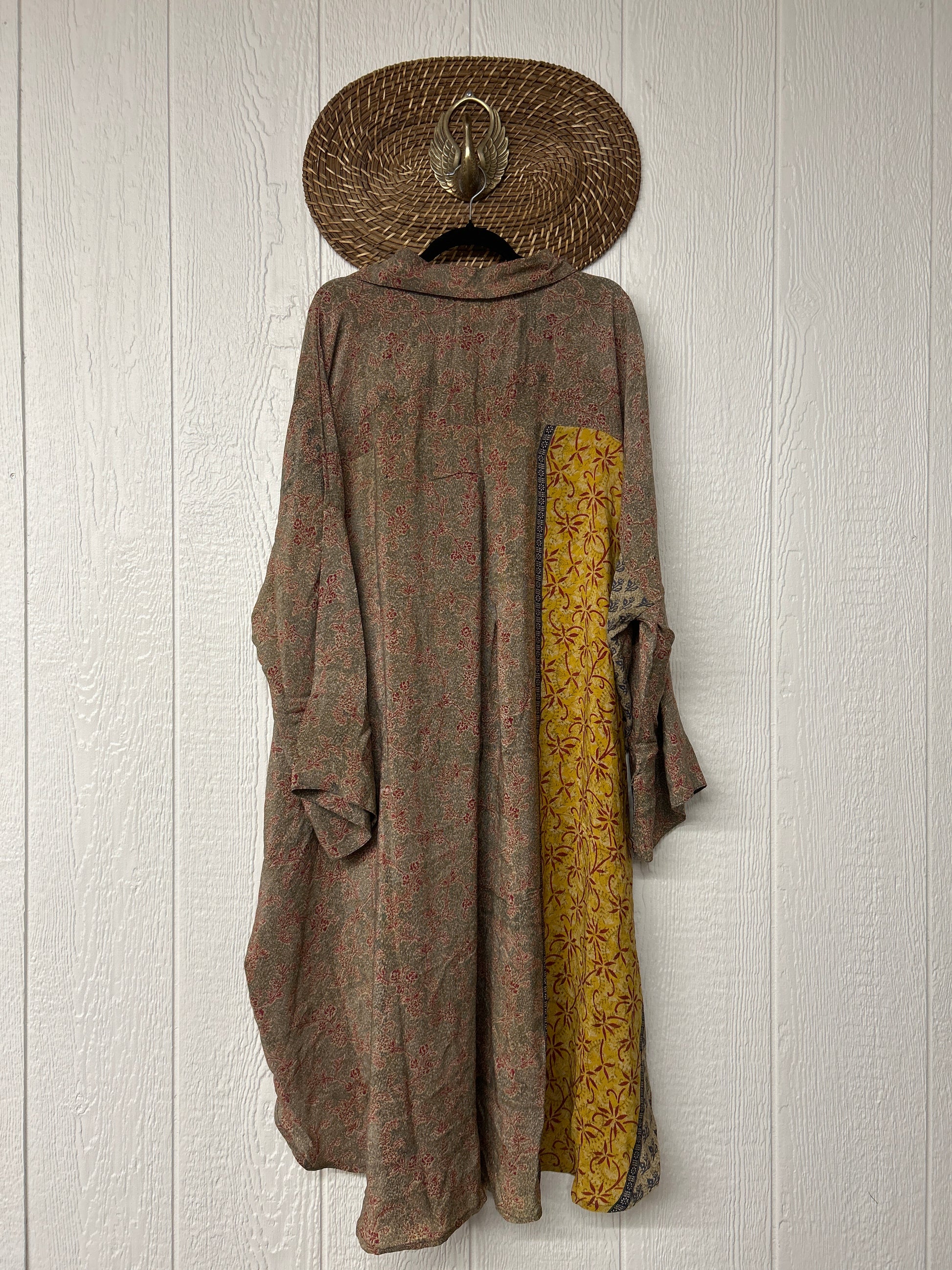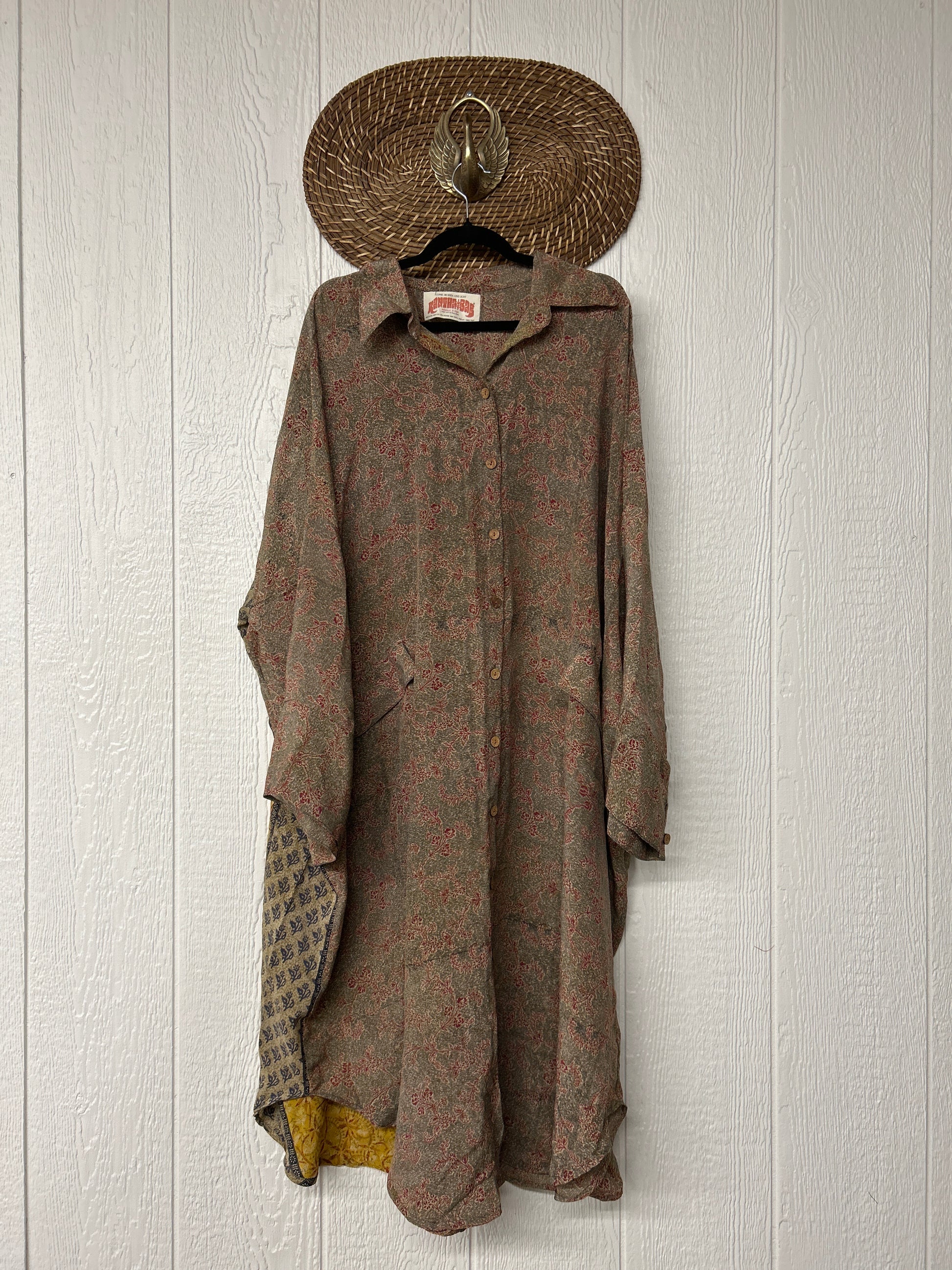 Made from our vintage crepe sari, this billowy dream functional buttons, two deep pockets in the front, dreamy longsleeves and a curved bottom.