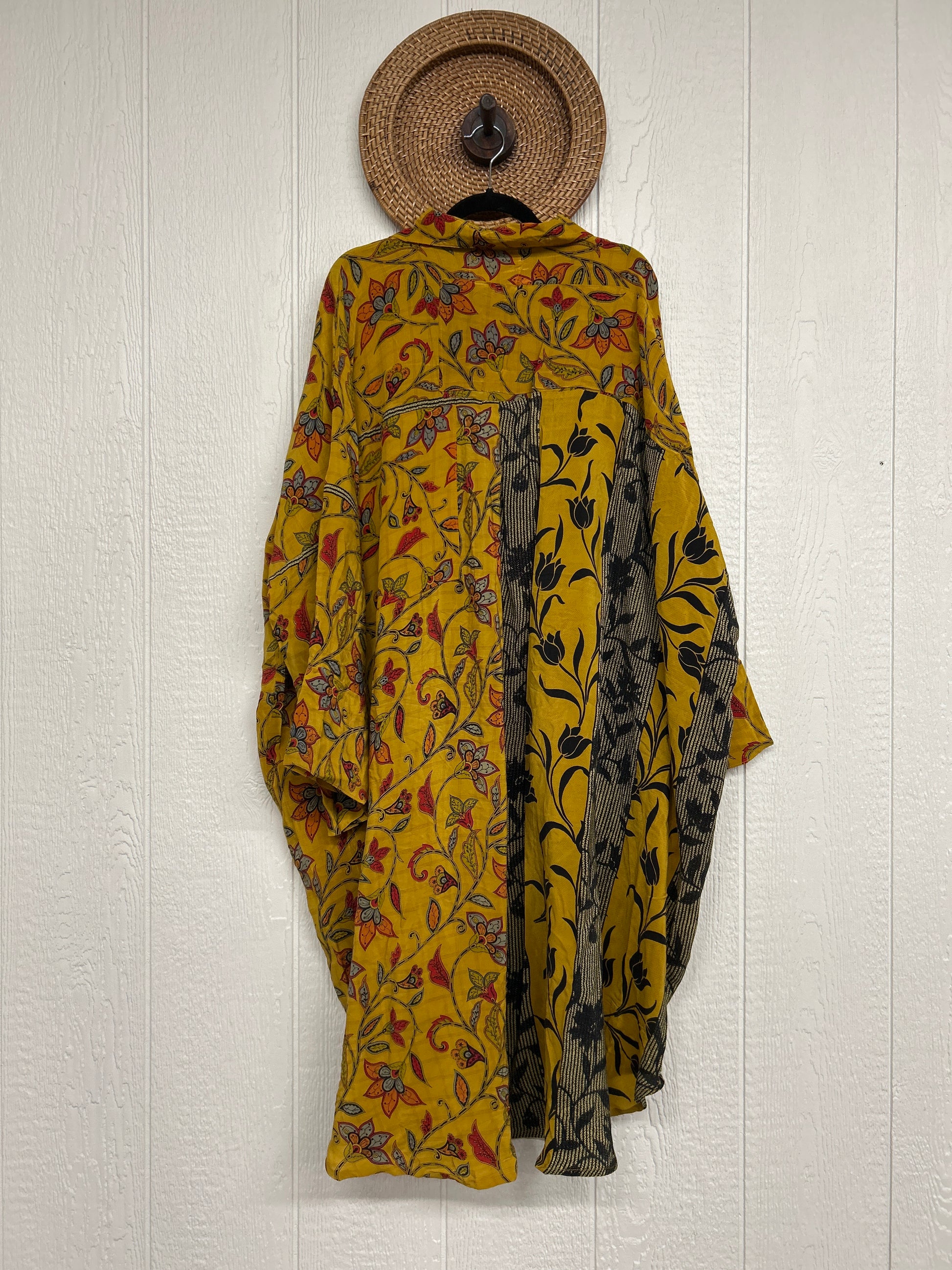 Made from our vintage crepe sari, this billowy dream functional buttons, two deep pockets in the front, dreamy longsleeves and a curved bottom.