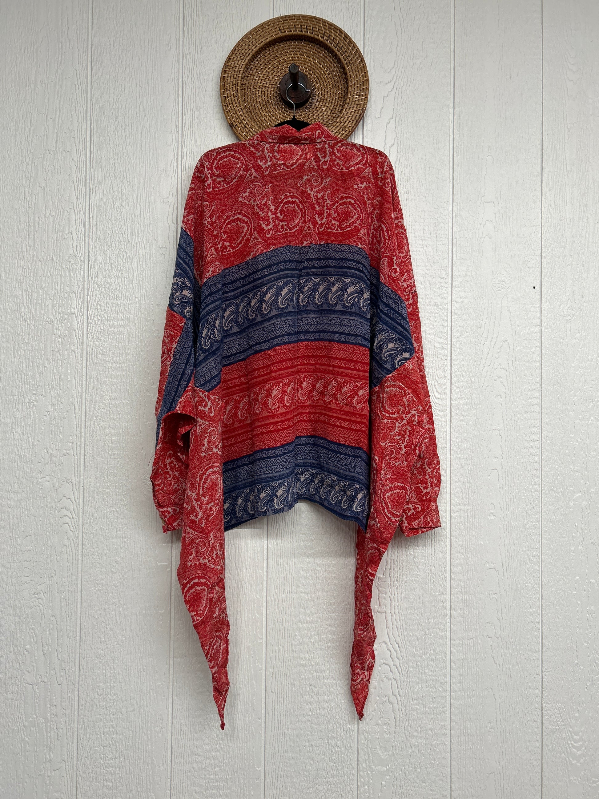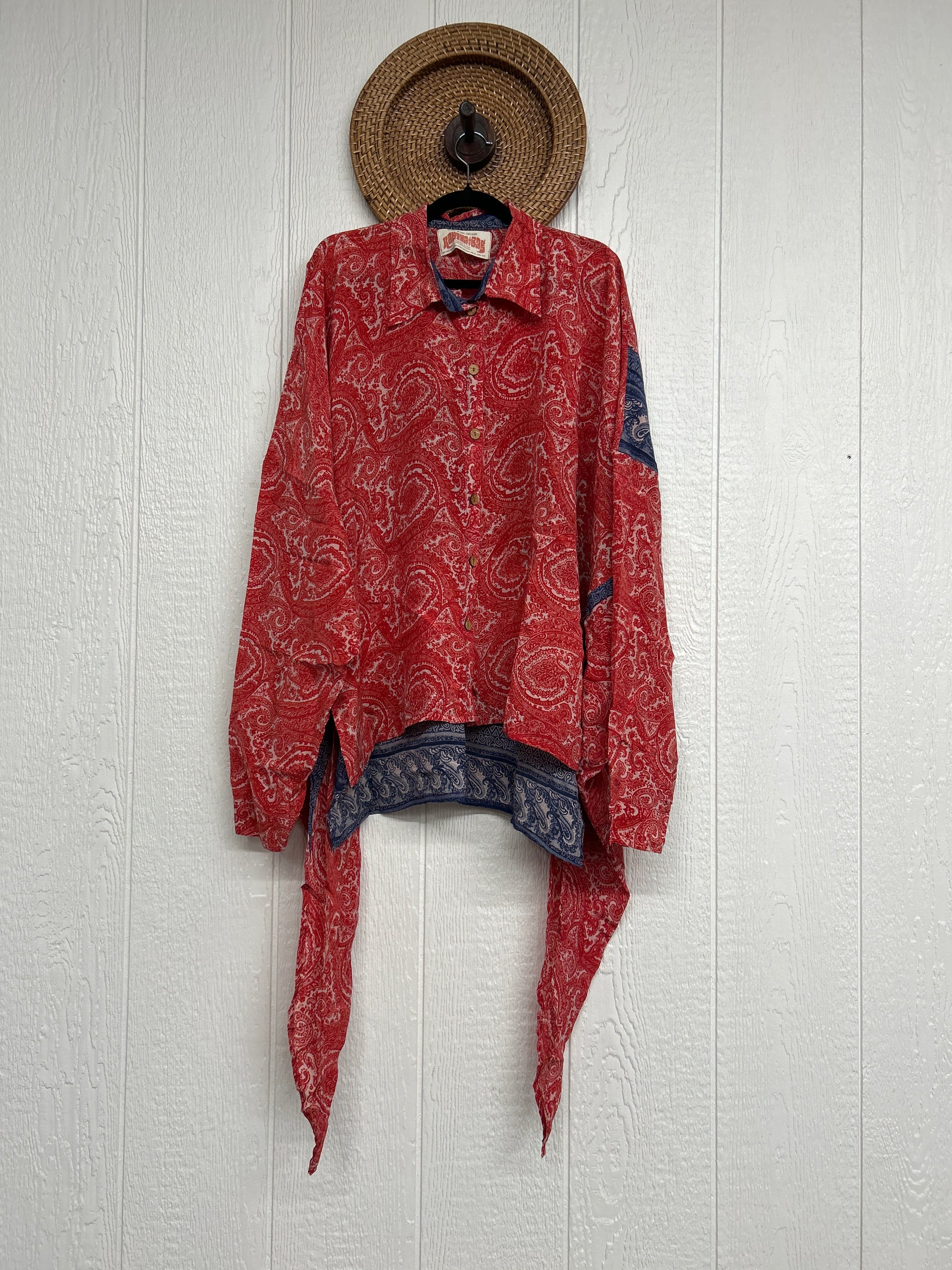 Crafted from our ultra lux vintage crepe sari this floaty dream features a Button-down placket with a high low hem, collar, and button cuffs.
