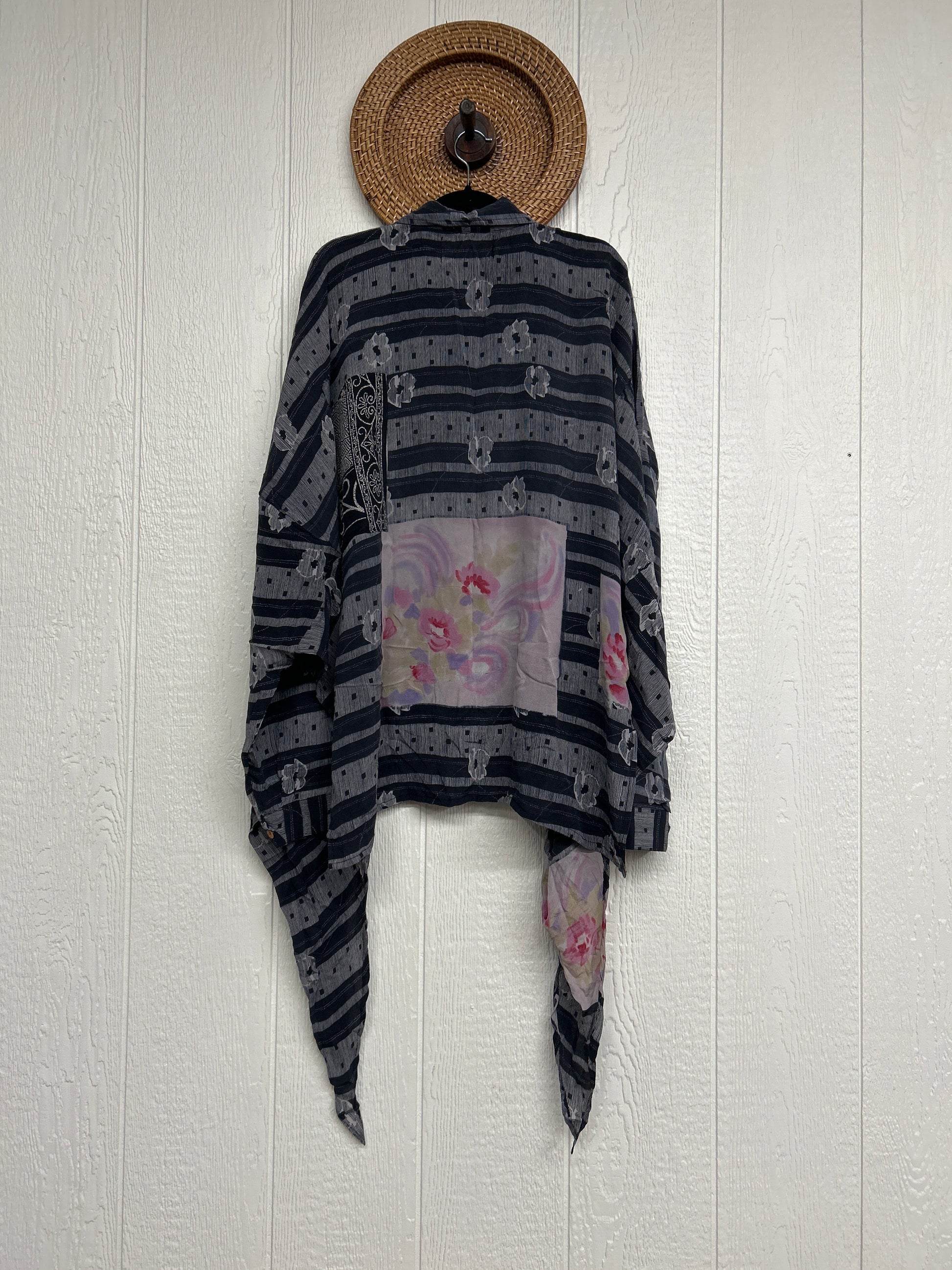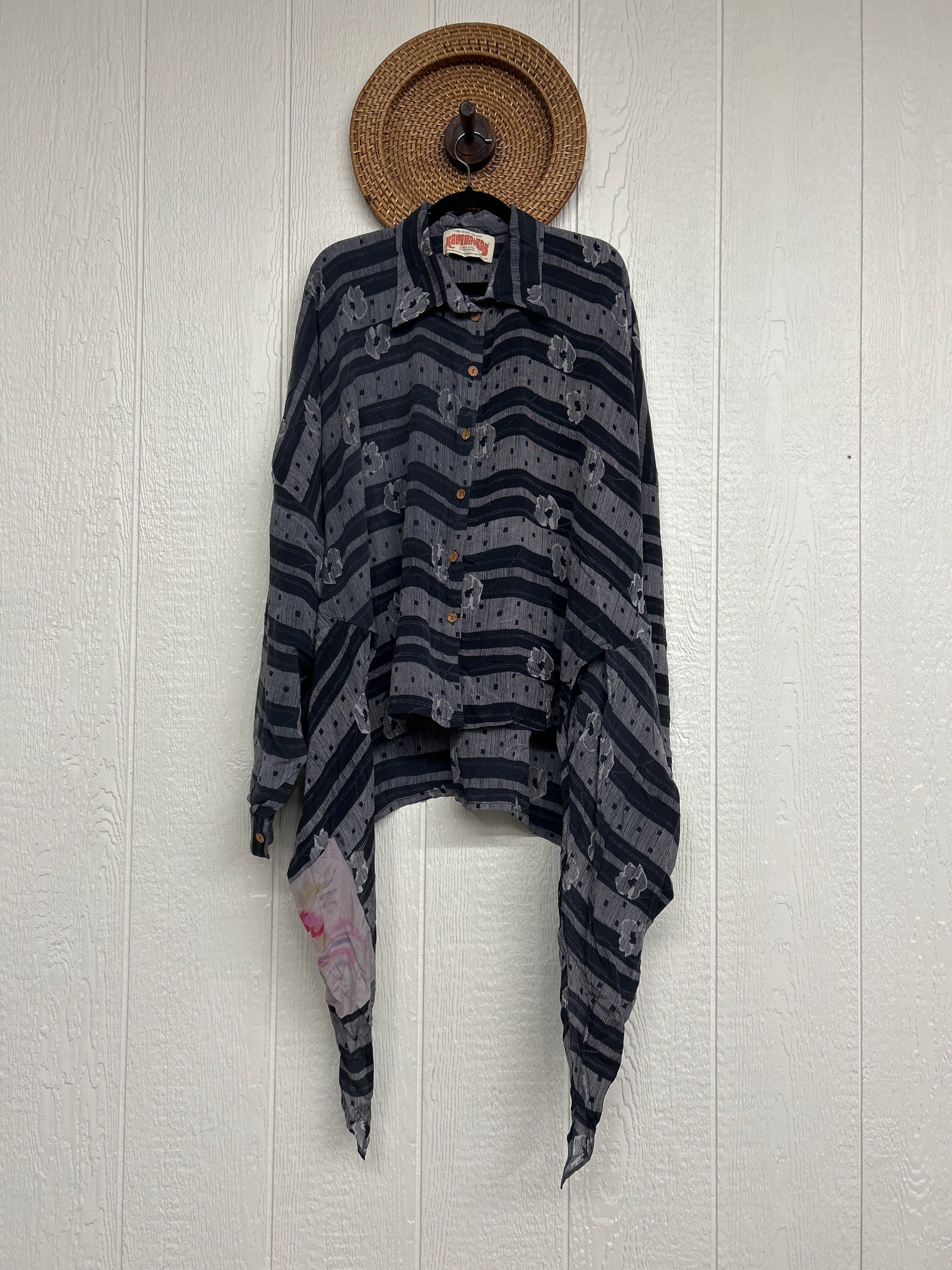 Crafted from our ultra lux vintage crepe sari this floaty dream features a Button-down placket with a high low hem, collar, and button cuffs.