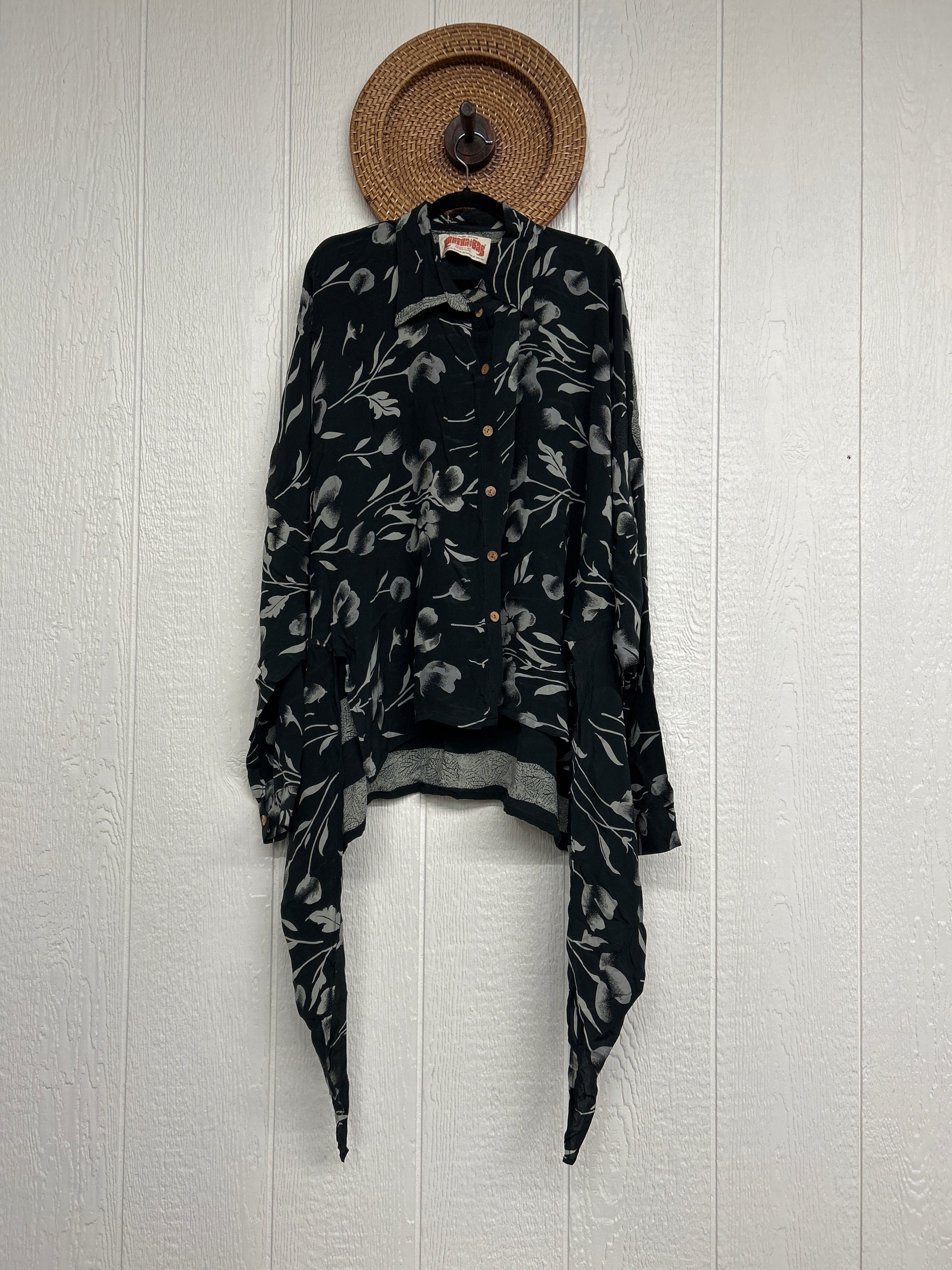 Crafted from our ultra lux vintage crepe sari this floaty dream features a Button-down placket with a high low hem, collar, and button cuffs.