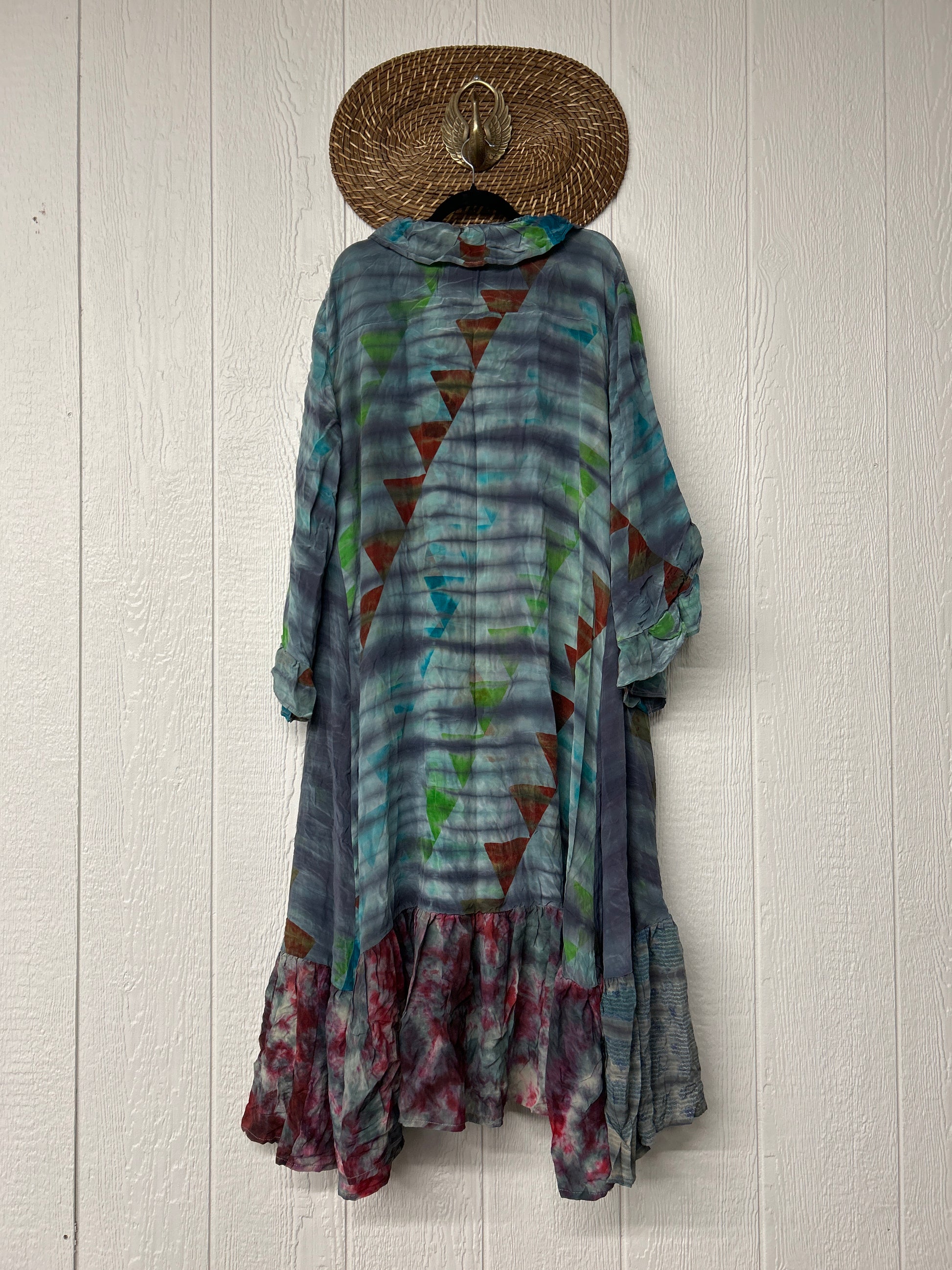 Our pixie duster is pure magic! crafted from ultra lux vintage crepe sari this ethereal layer features ruffles all the way around the outer hem, bell sleeves, double tie closure & high low hem for extra dimension size recommended 00-22/24
