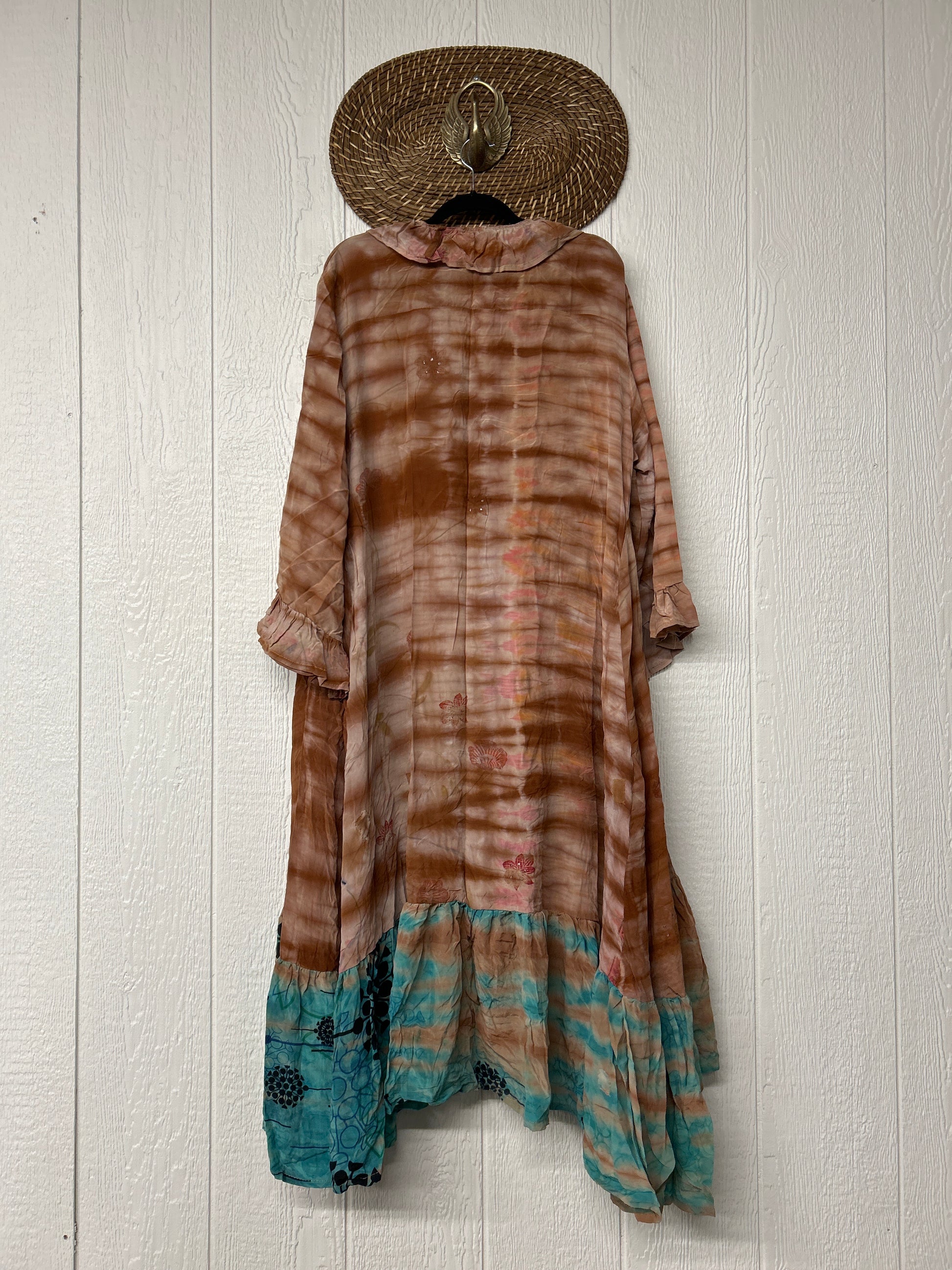 Our pixie duster is pure magic! crafted from ultra lux vintage crepe sari this ethereal layer features ruffles all the way around the outer hem, bell sleeves, double tie closure & high low hem for extra dimension size recommended 00-22/24