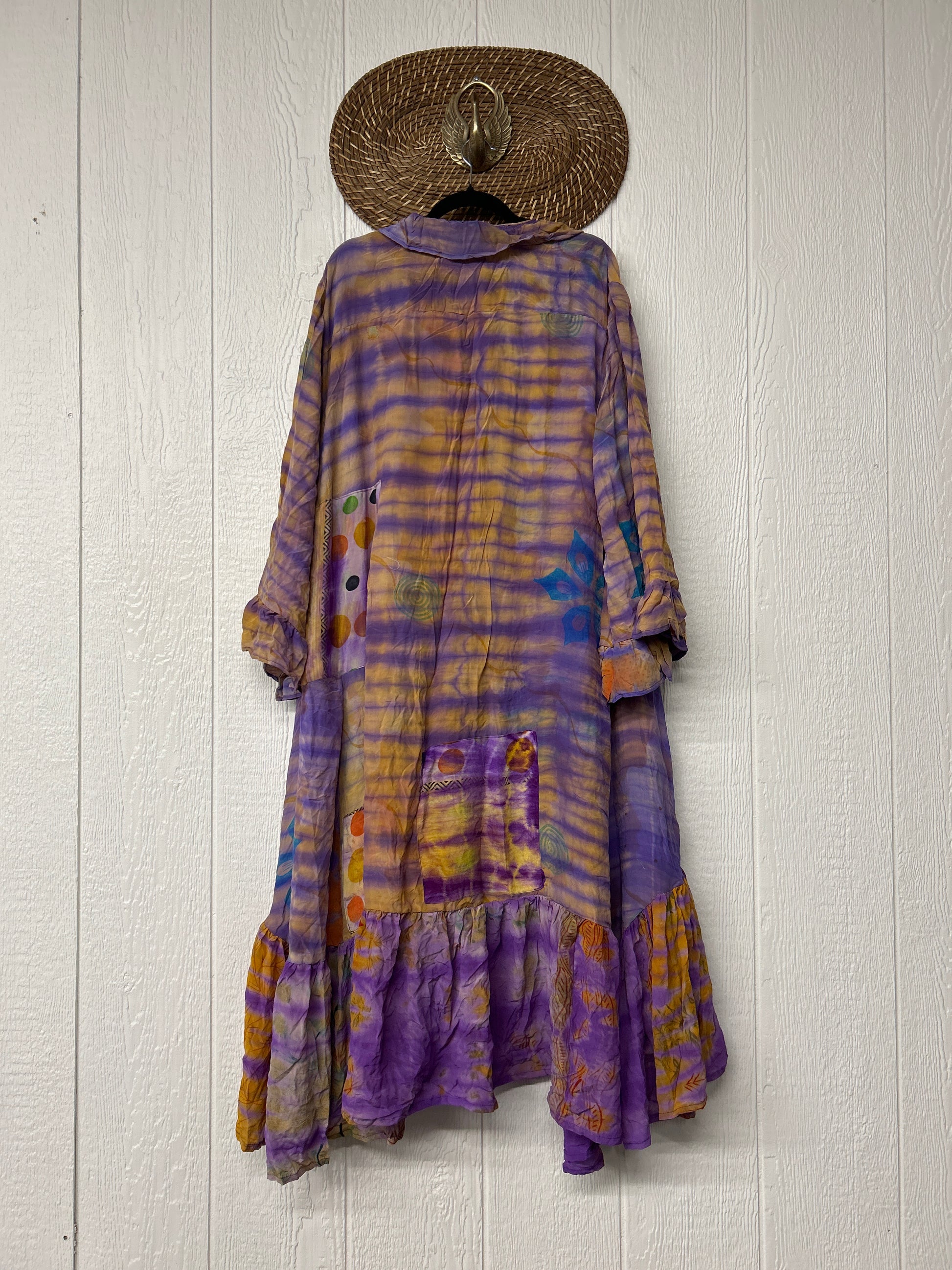 Our pixie duster is pure magic! crafted from ultra lux vintage crepe sari this ethereal layer features ruffles all the way around the outer hem, bell sleeves, double tie closure & high low hem for extra dimension size recommended 00-22/24