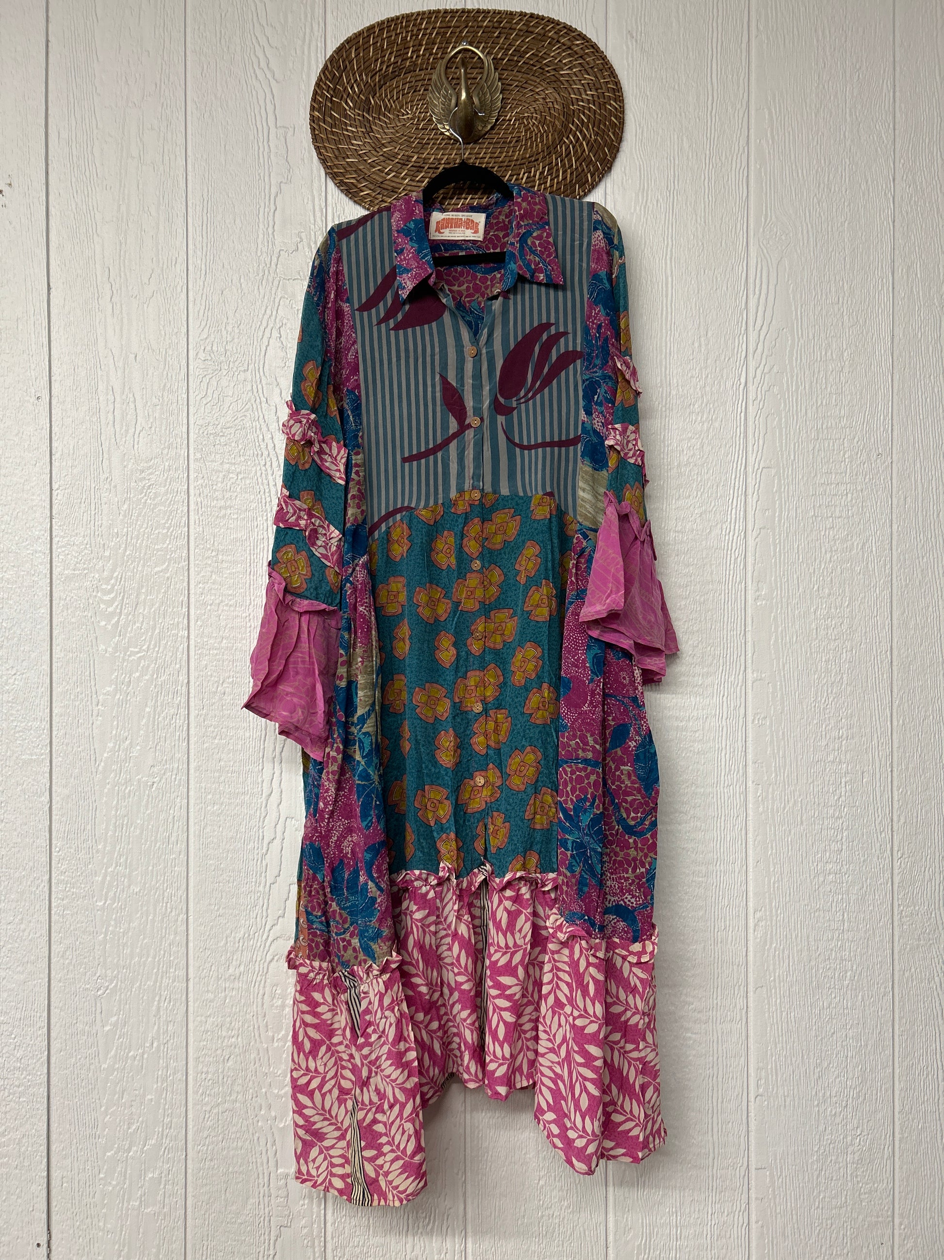 Made from our ultra lux vintage crepe sari this dreamy piece features ruffle bell sleeves, button down front, collar, mixed prints throughout and a fabulous ruffle hem.