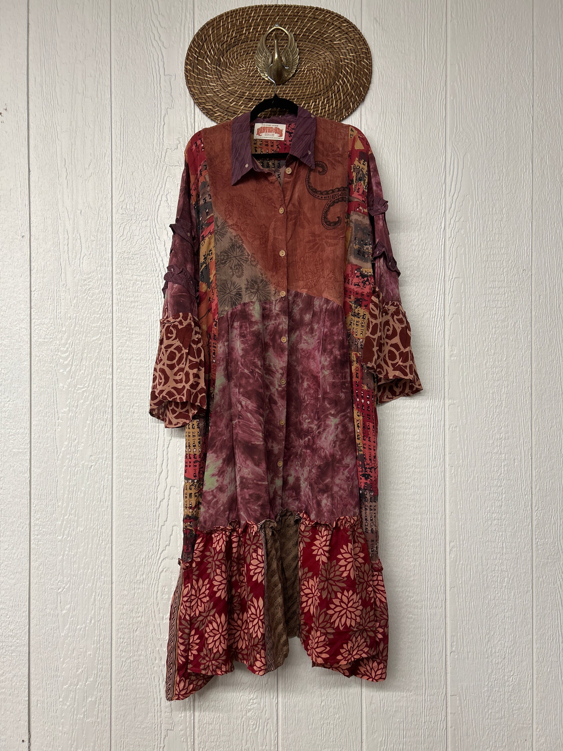 Made from our ultra lux vintage crepe sari this dreamy piece features ruffle bell sleeves, button down front, collar, mixed prints throughout and a fabulous ruffle hem.