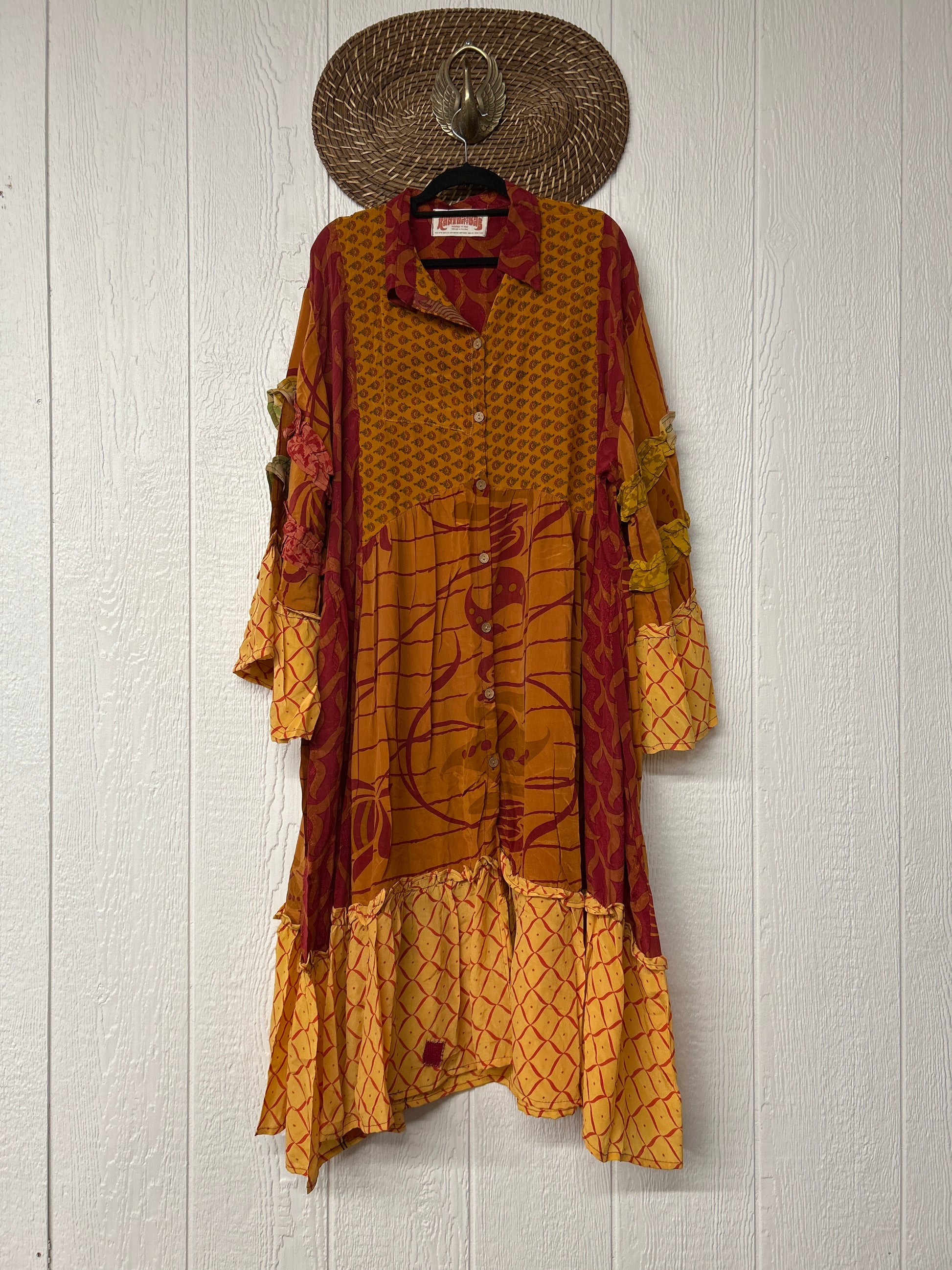 Made from our ultra lux vintage crepe sari this dreamy piece features ruffle bell sleeves, button down front, collar, mixed prints throughout and a fabulous ruffle hem.