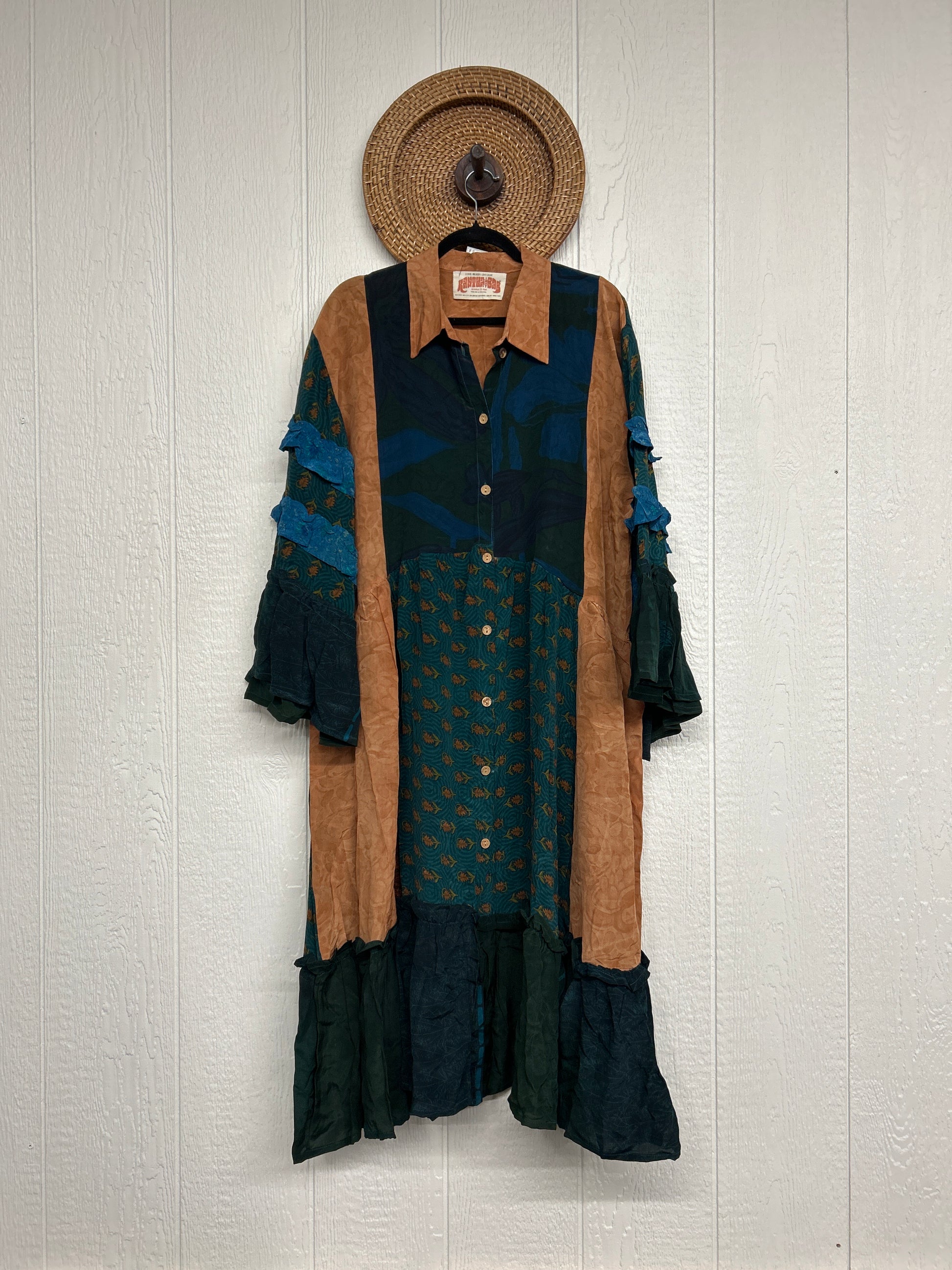 Made from our ultra lux vintage crepe sari this dreamy piece features ruffle bell sleeves, button down front, collar, mixed prints throughout and a fabulous ruffle hem.