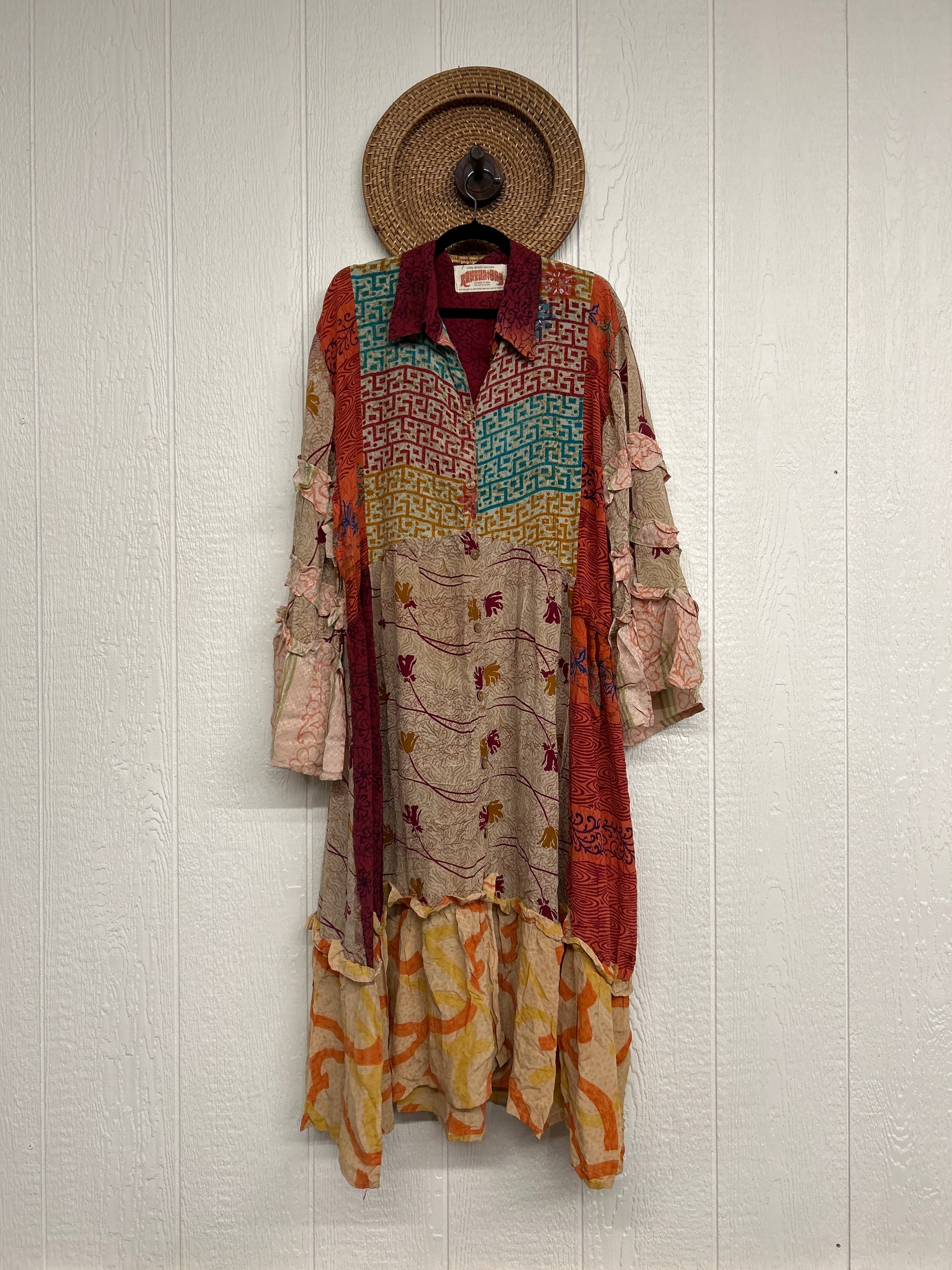 Made from our ultra lux vintage crepe sari this dreamy piece features ruffle bell sleeves, button down front, collar, mixed prints throughout and a fabulous ruffle hem.