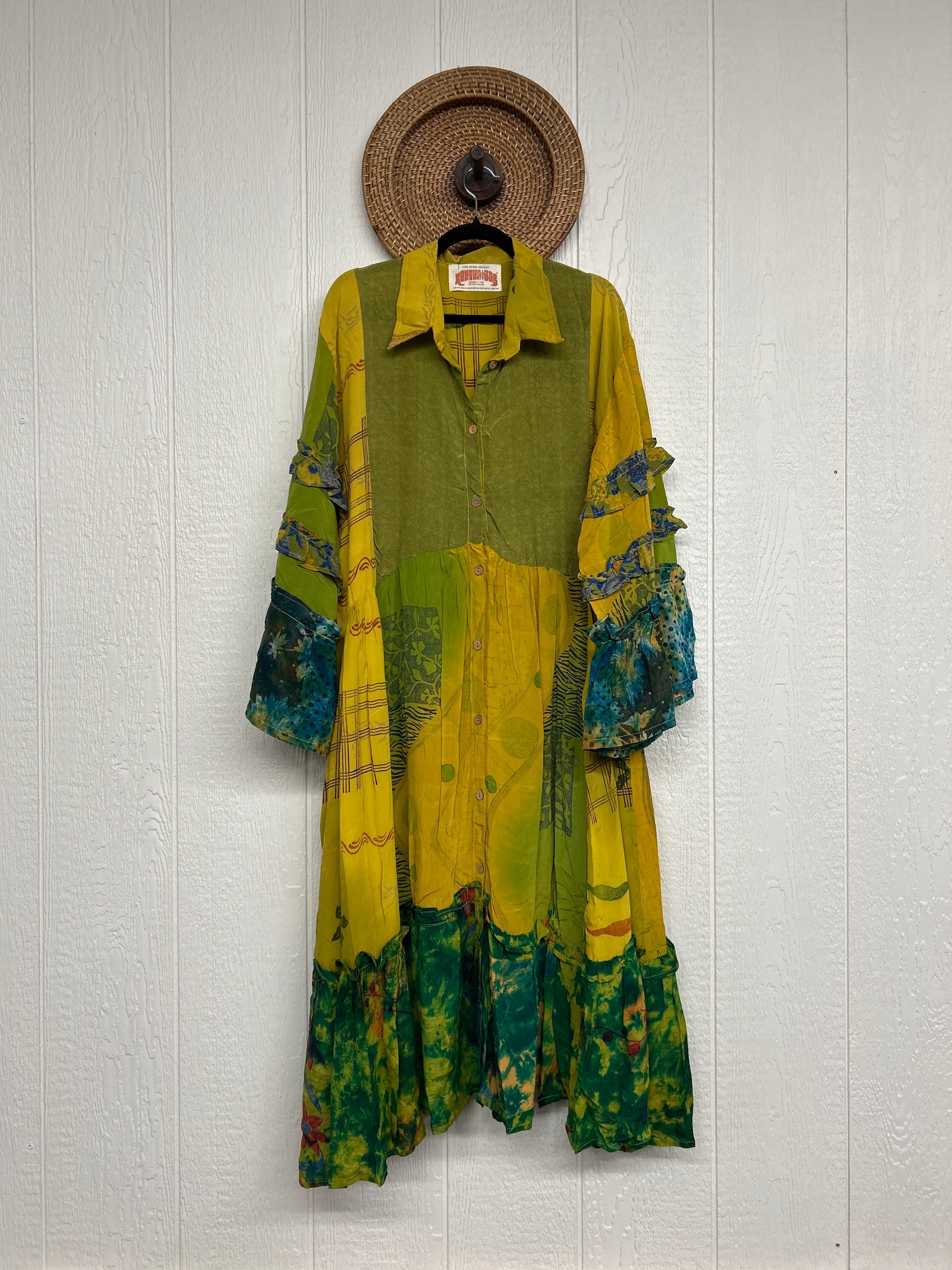 Made from our ultra lux vintage crepe sari this dreamy piece features ruffle bell sleeves, button down front, collar, mixed prints throughout and a fabulous ruffle hem.