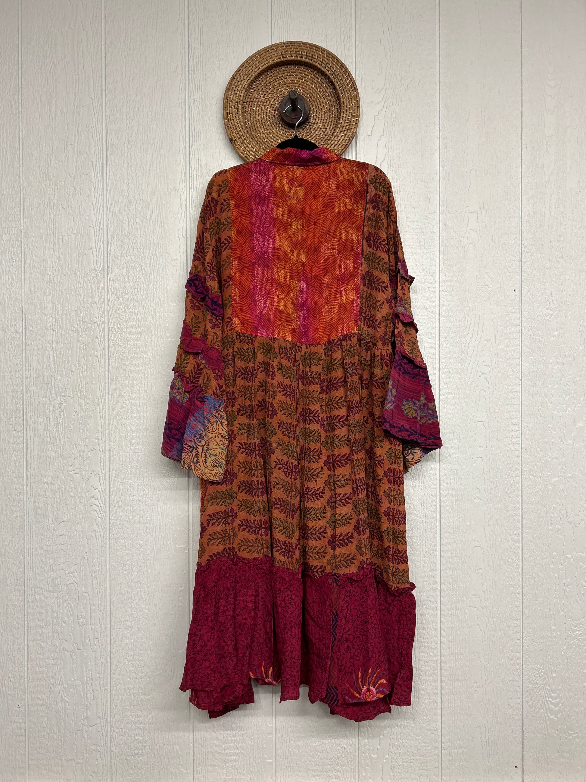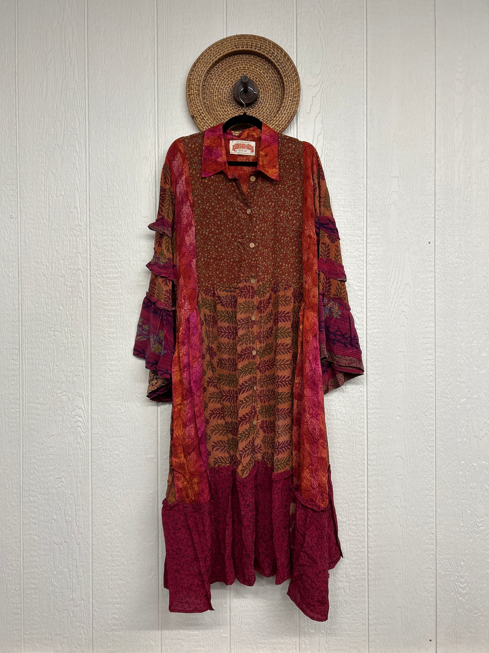 Made from our ultra lux vintage crepe sari this dreamy piece features ruffle bell sleeves, button down front, collar, mixed prints throughout and a fabulous ruffle hem.