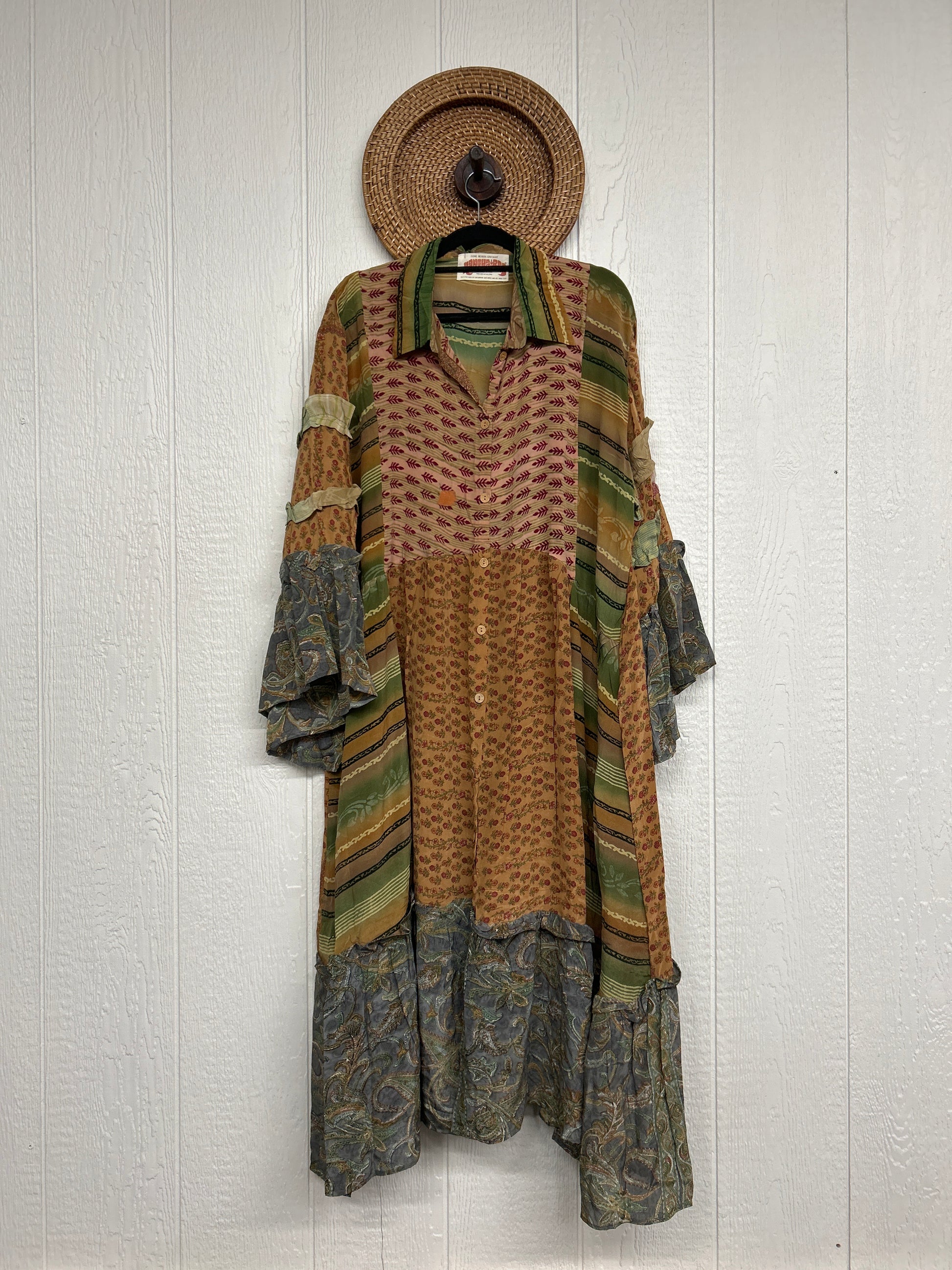 Made from our ultra lux vintage crepe sari this dreamy piece features ruffle bell sleeves, button down front, collar, mixed prints throughout and a fabulous ruffle hem.