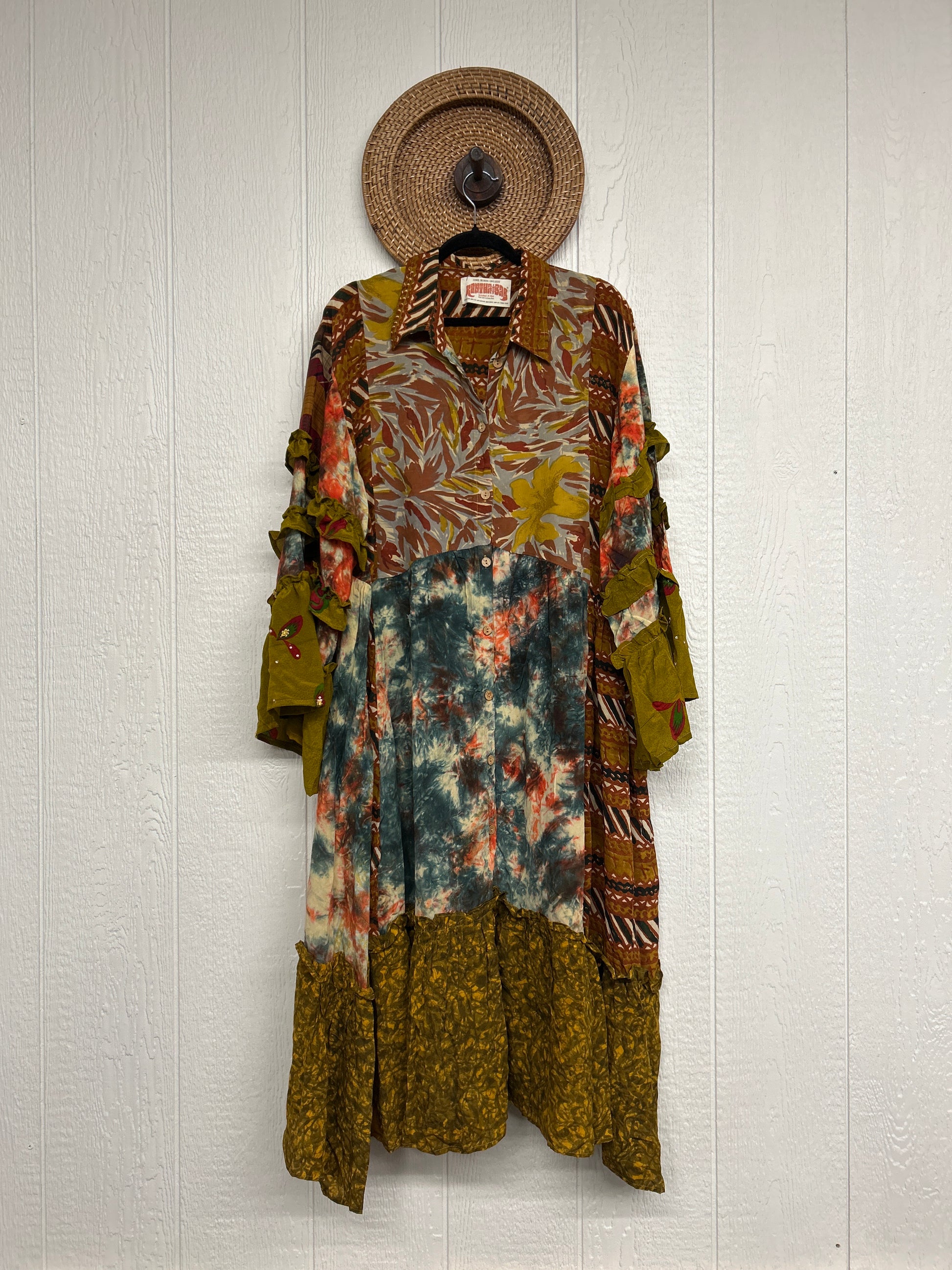 Made from our ultra lux vintage crepe sari this dreamy piece features ruffle bell sleeves, button down front, collar, mixed prints throughout and a fabulous ruffle hem.