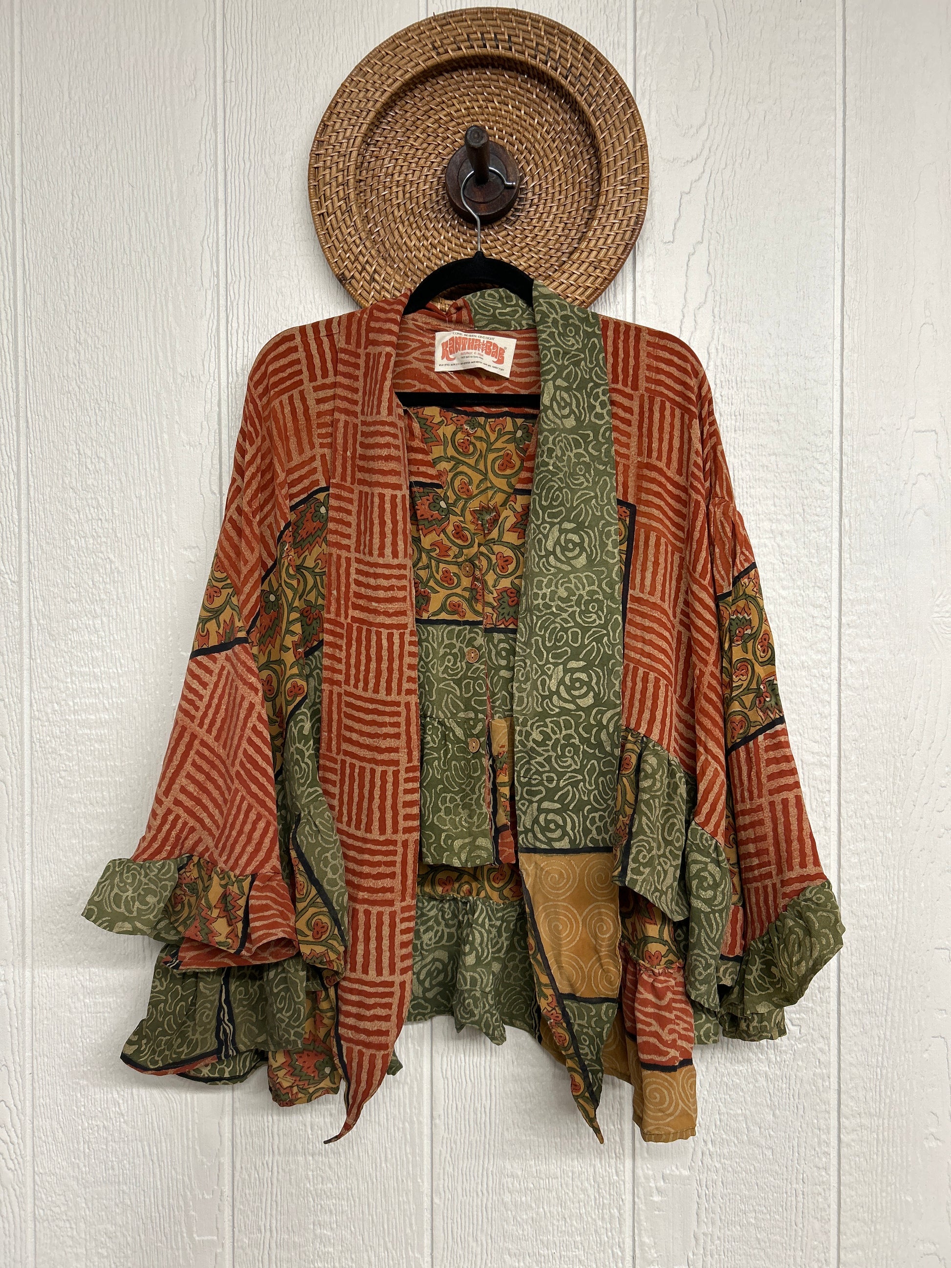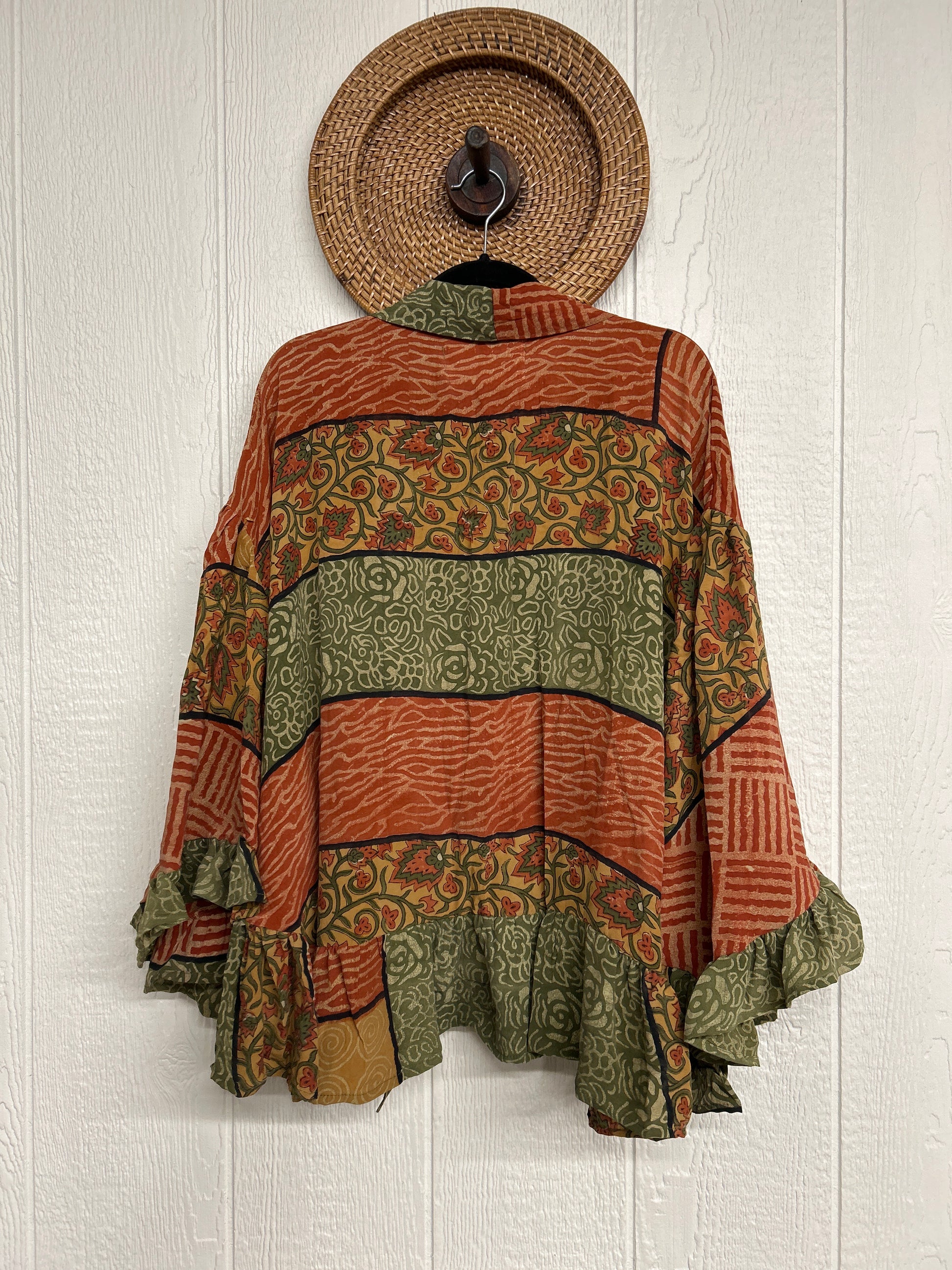 Crafted from vintage crepe sari this romantic piece features ruffles throughout, tie closure on the neck that can be opened or closed, fully functional button placket, high low hem, bell sleeve.